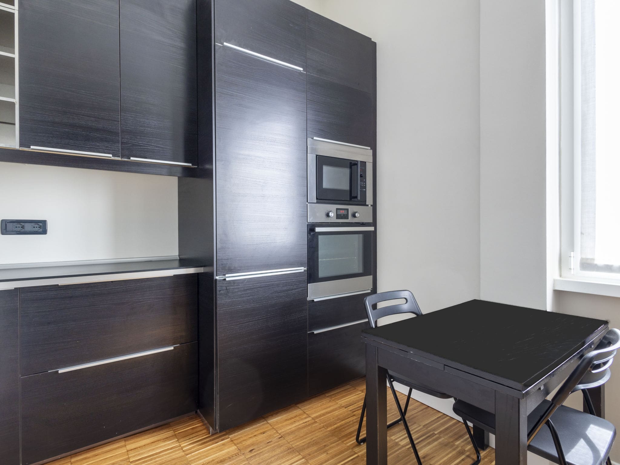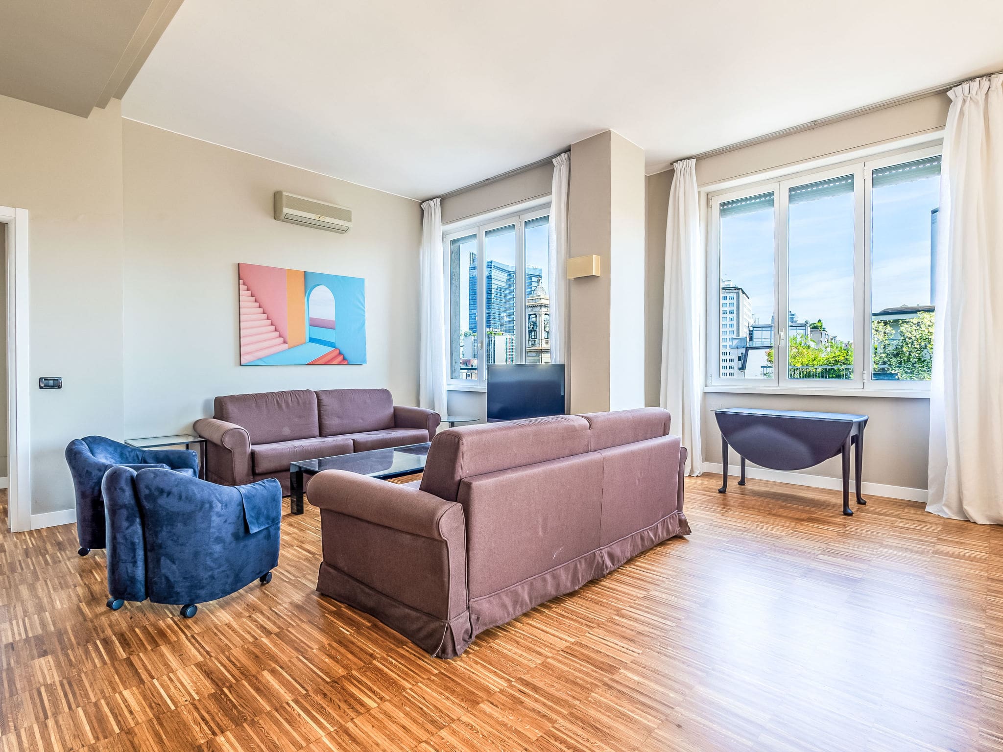 Palazzo Repubblica spans 150 square metres of thoughtfully designed living space, showcasing modern Italian design sensibilities throughout its four rooms. The expansive living and dining area features panoramic windows that frame sweeping views across Milan’s evolving skyline, while sleek parquet floors reflect the abundant natural light. Contemporary furnishings create an atmosphere of understated elegance, complemented by air conditioning and heating systems that ensure year-round comfort.
