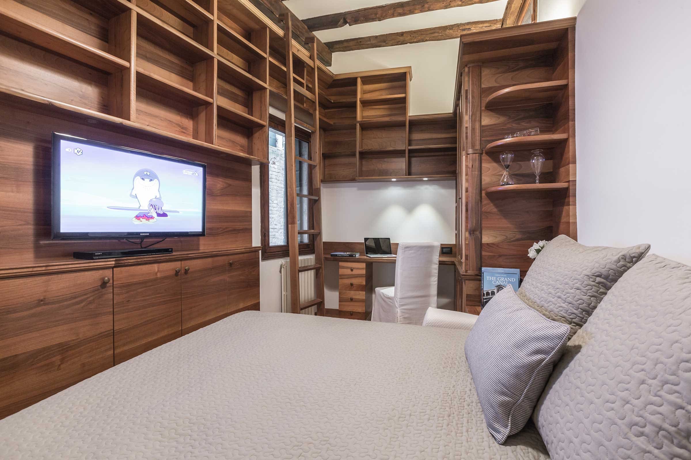 Step into a world of elegance and tradition as you enter this two-bedroom, two-bathroom penthouse. The interior exudes classic Venetian charm with traditional tiles and exposed beams, creating a warm and inviting atmosphere. The living area, complete with a comfortable sofa bed, offers ample space for relaxation while providing picturesque views of the bustling canals below. The kitchenette is perfect for preparing light bites, but with San Marco’s finest restaurants just a stone’s throw away, you’ll find dining options aplenty. The bedrooms are cozy and tastefully decorated, ensuring a restful night’s sleep.