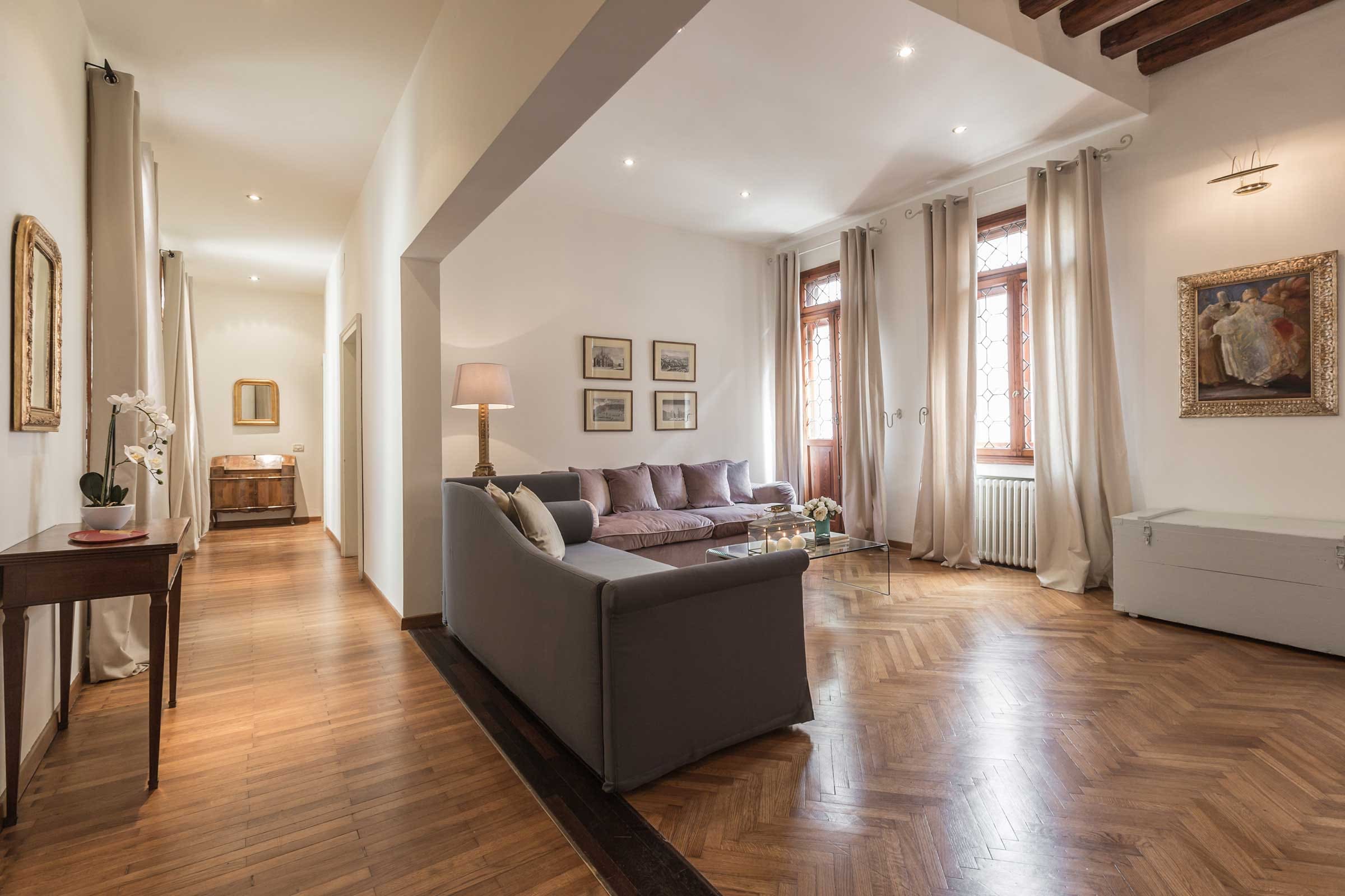 Accommodating up to eight guests, this apartment features four luxurious bedrooms and four bathrooms. Although there is no lift, the historic charm and beauty of the residence more than compensate. One well-behaved dog is welcome, as are children, making it ideal for family holidays. For more options, browse our luxury villa rentals in Italy.