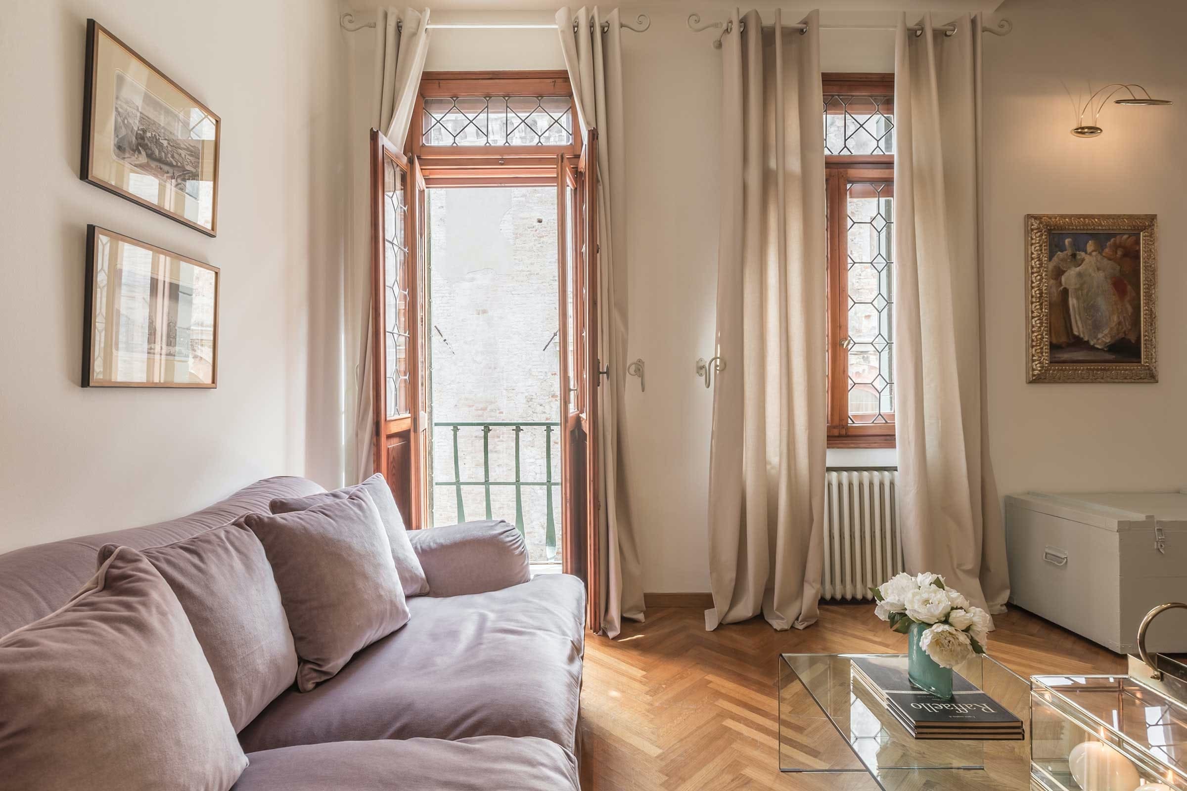 A: The apartment offers stunning views of the Venetian canals from its balcony.