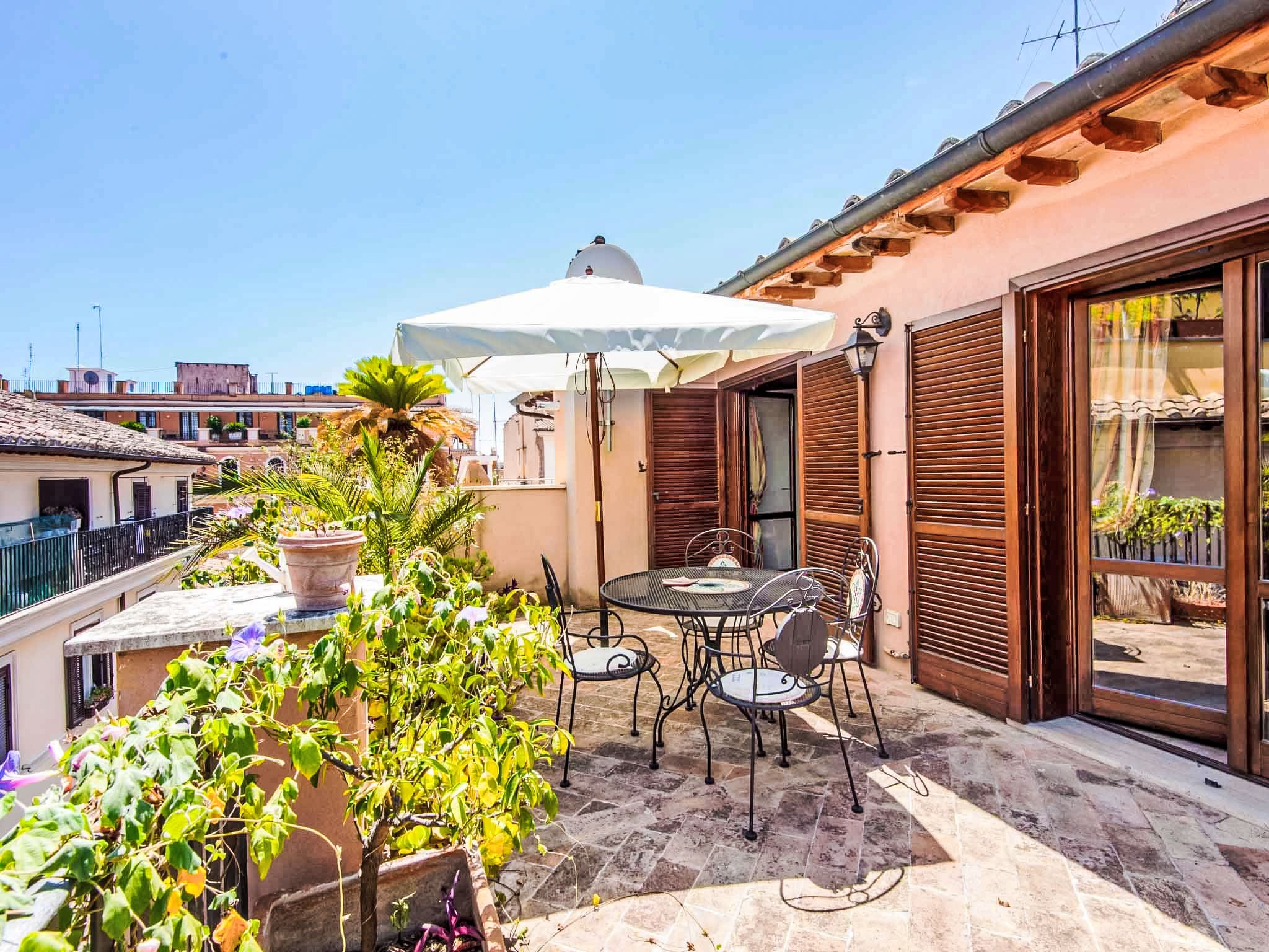 The apartment’s crowning feature is its private terrace, accessible from the living area and furnished for outdoor relaxation. This elevated outdoor space offers panoramic views across Rome’s historic rooftops, providing a perfect setting for morning coffee or evening aperitivos while watching the city come alive below. The terrace serves as an invaluable private retreat in the heart of one of Europe’s busiest tourist destinations.