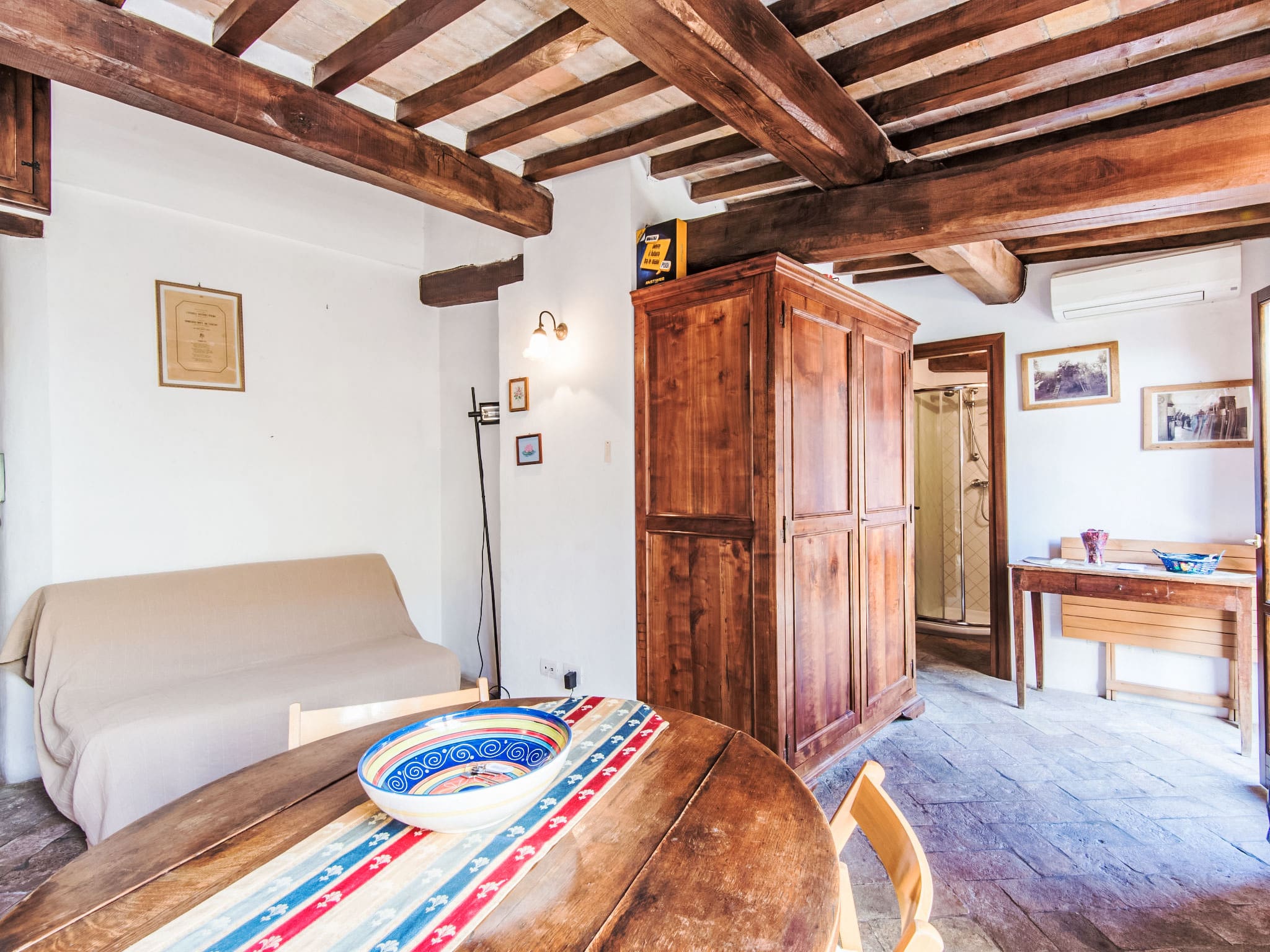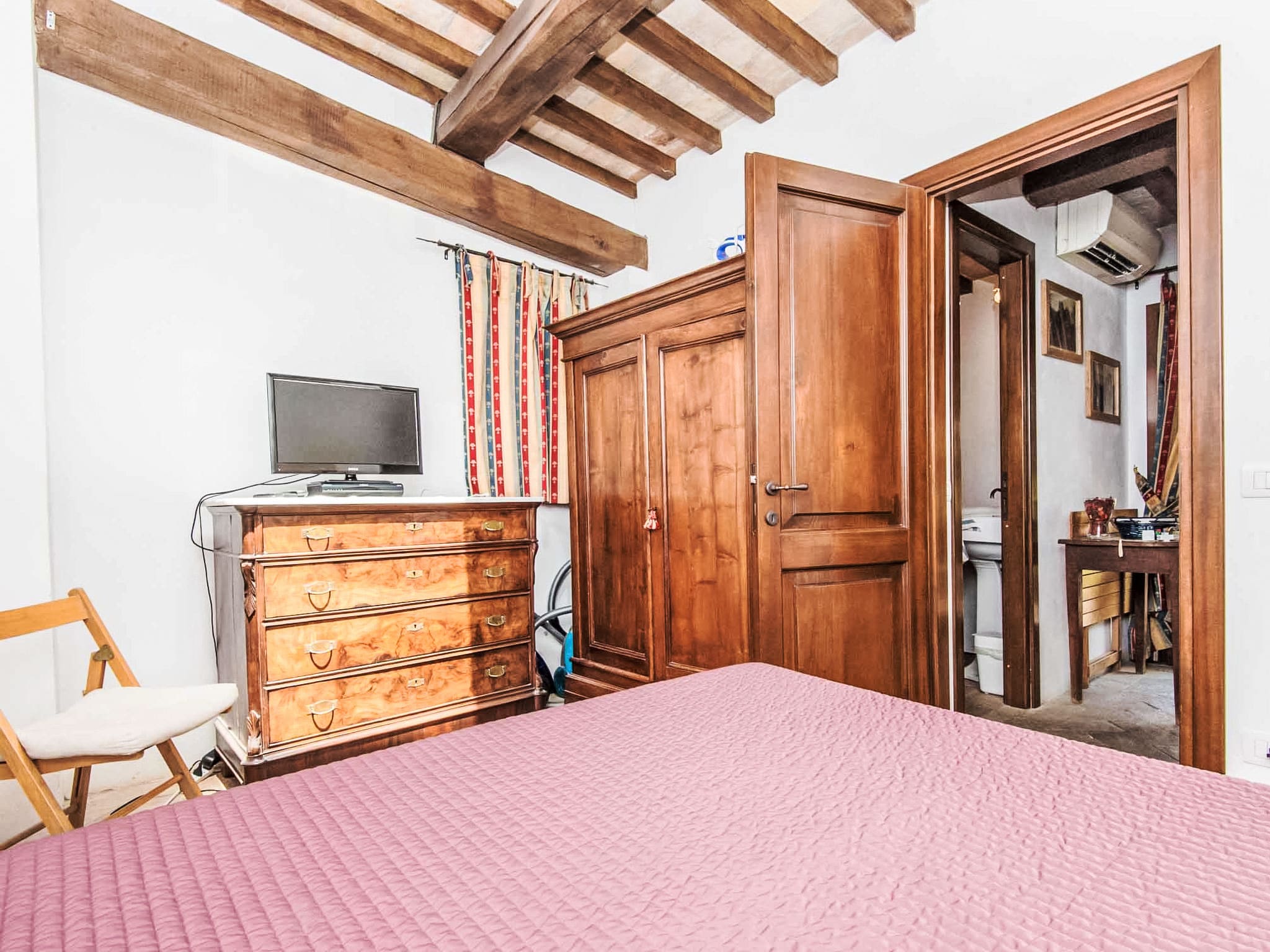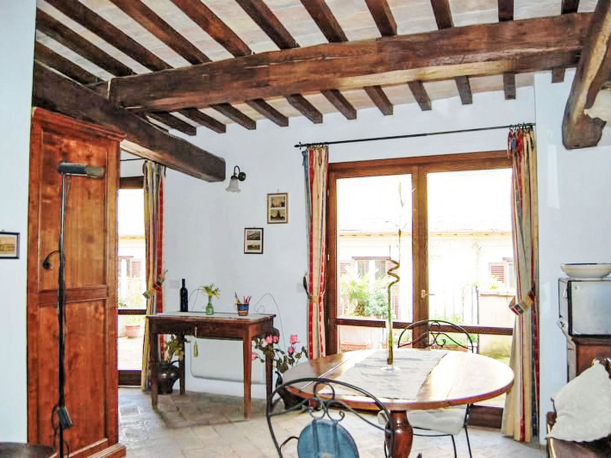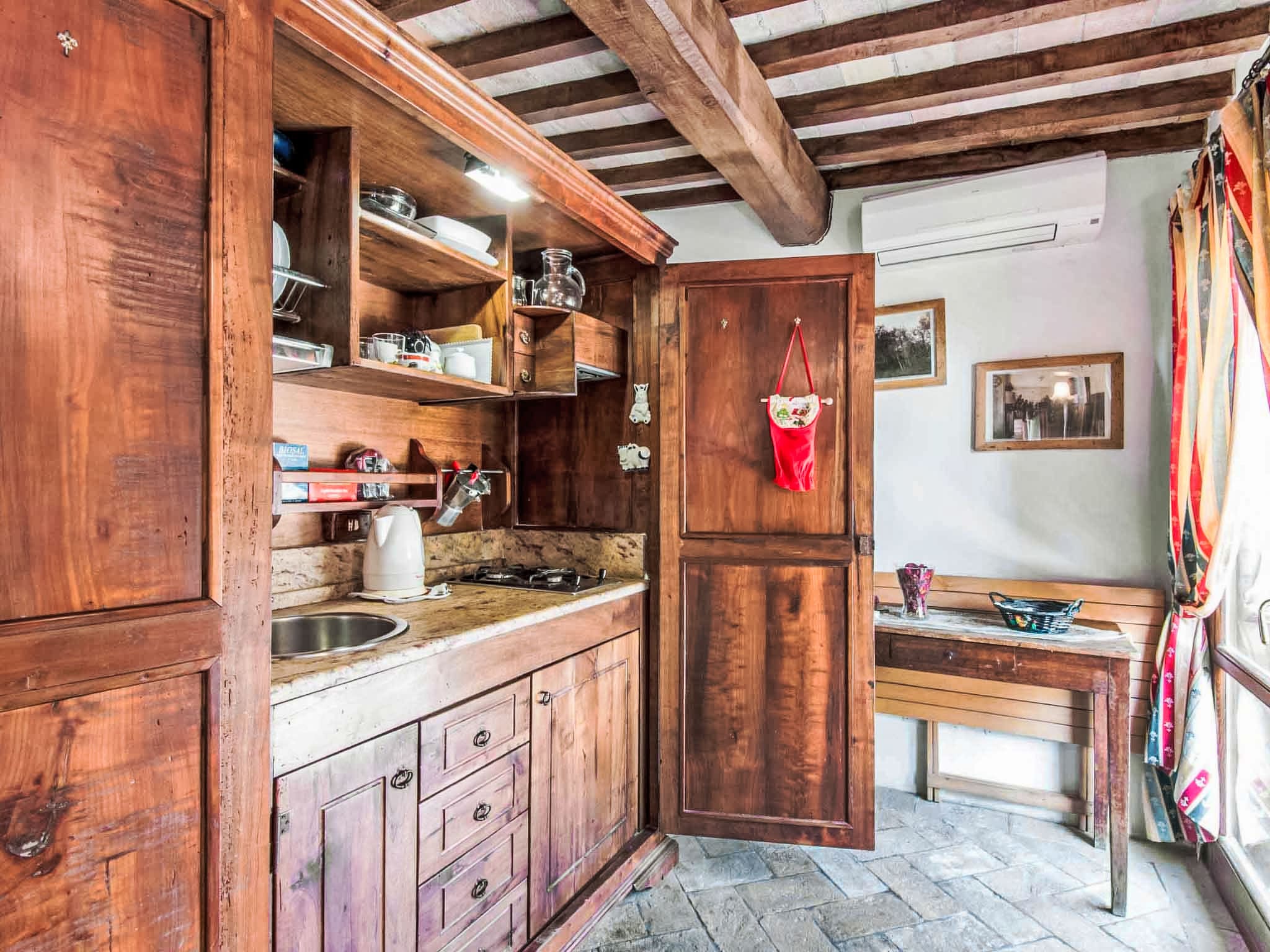 Modern conveniences include air conditioning, heating (available November through April), complimentary WiFi, and a washing machine. The bathroom features a shower, bidet, and WC, while thoughtful touches like a hair dryer and fresh linens add to the overall comfort. Double-glazed windows and LED lighting demonstrate the property’s commitment to both tranquility and sustainability.