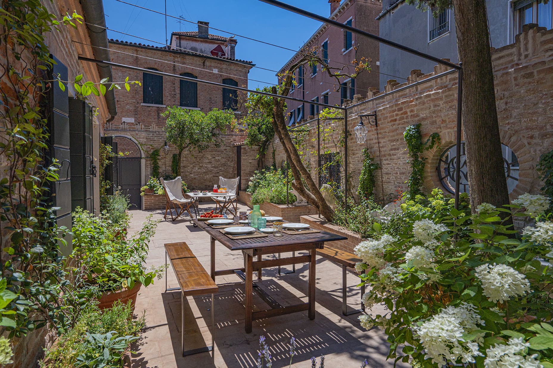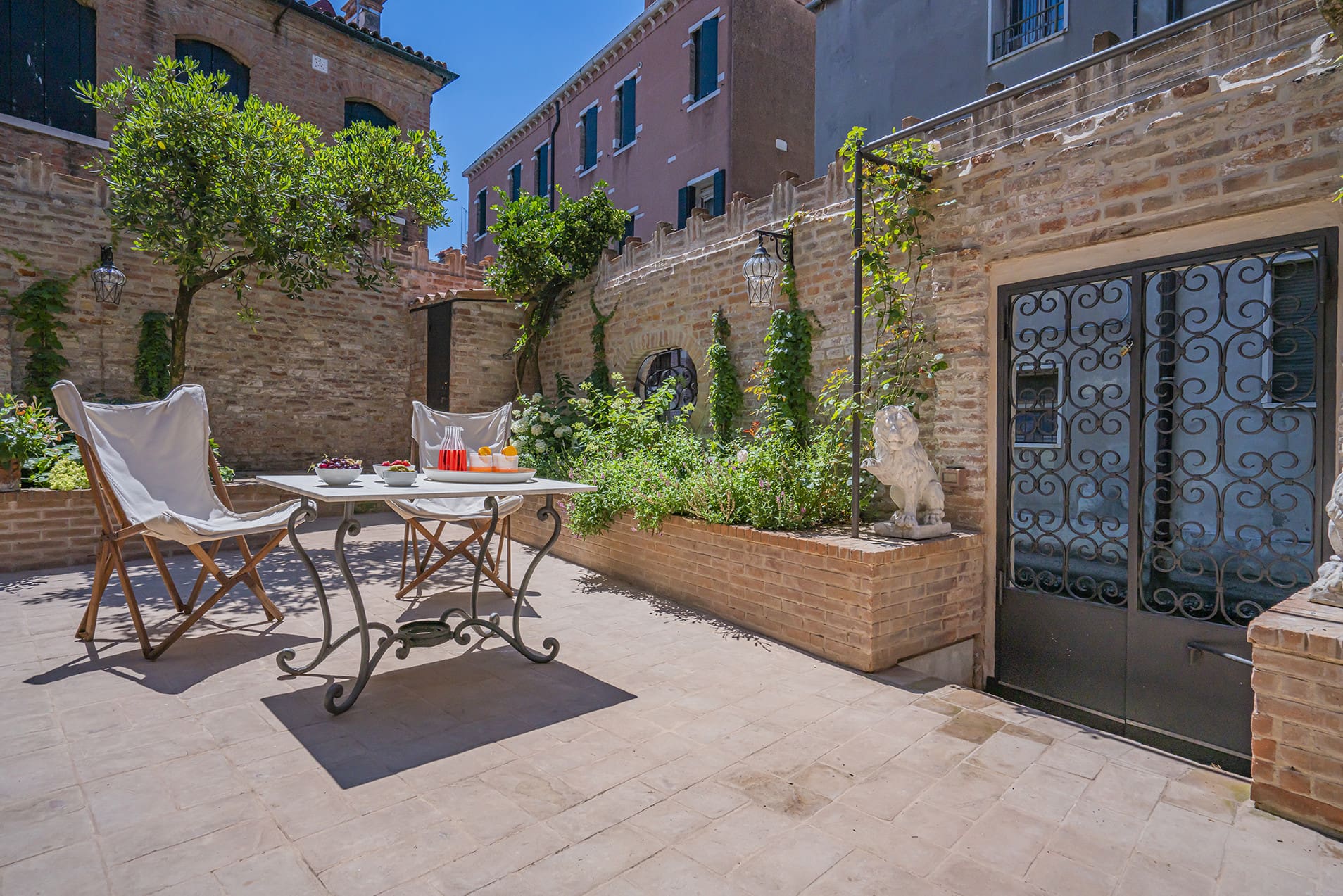 Inside, the apartment spans two floors, showcasing a harmonious blend of traditional Venetian design and contemporary comfort. The ground floor includes a convenient bedroom and bathroom, perfect for guests with reduced mobility. Upstairs, the additional two bedrooms each have access to balconies that offer serene views of the private terrace below. The living spaces are designed to be both stylish and functional, with an open-plan area that encourages relaxation and socializing. The dining room features a unique table with benches that invite communal dining, though it may not suit everyone’s preference.