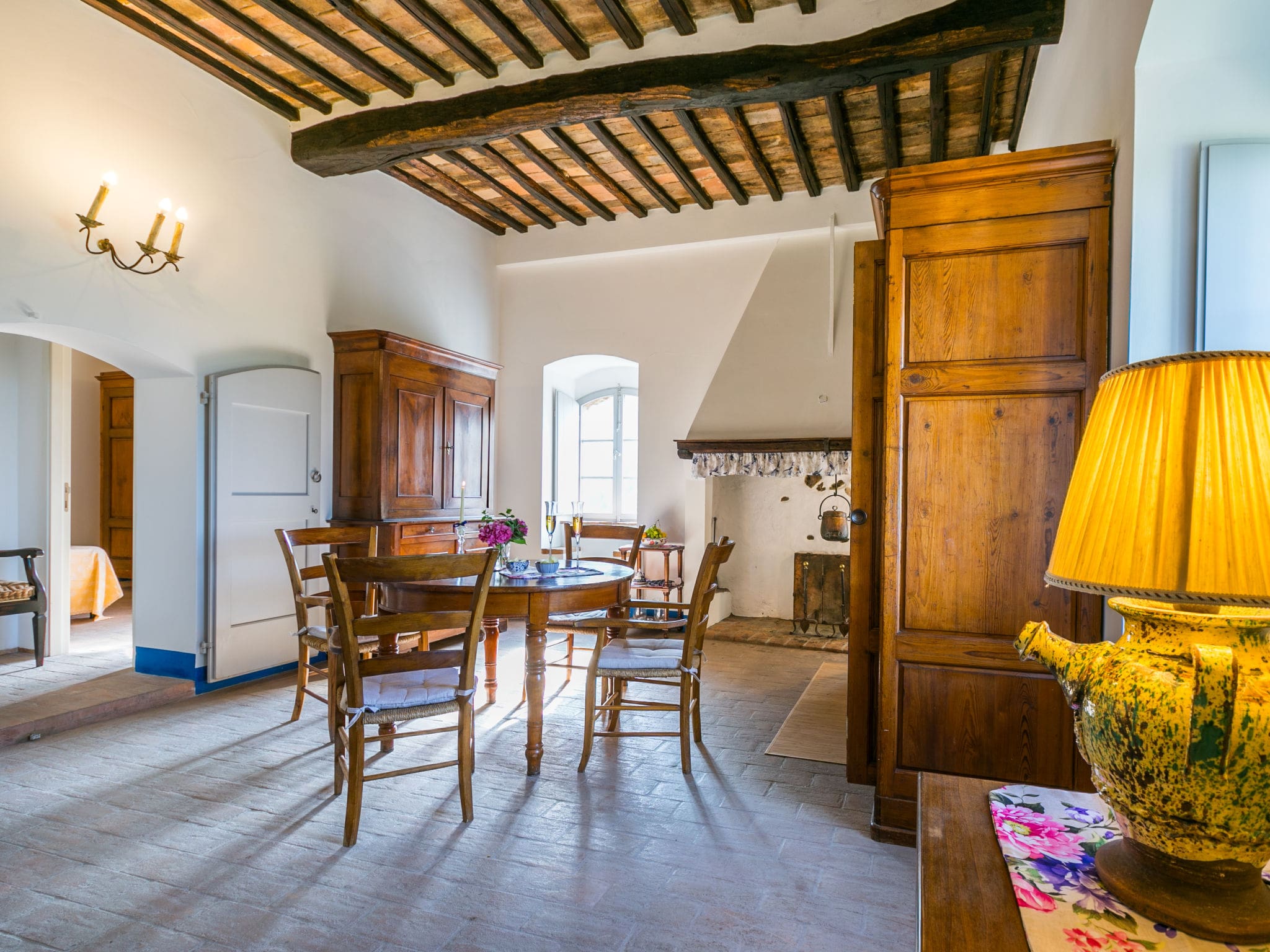 Each ascending level presents a unique configuration of living and sleeping spaces. The upper floors feature charming living rooms with decorative fireplaces, comfortable sofabeds, and well-appointed kitchenettes. Four double bedrooms accommodate up to twelve guests, each paired with modern shower rooms featuring bidets. The crowning glory awaits at the top floor, accessible via an atmospheric spiral staircase, where a magnificent double bedroom opens onto a private terrace through panoramic windows that frame the rolling Tuscan landscape.