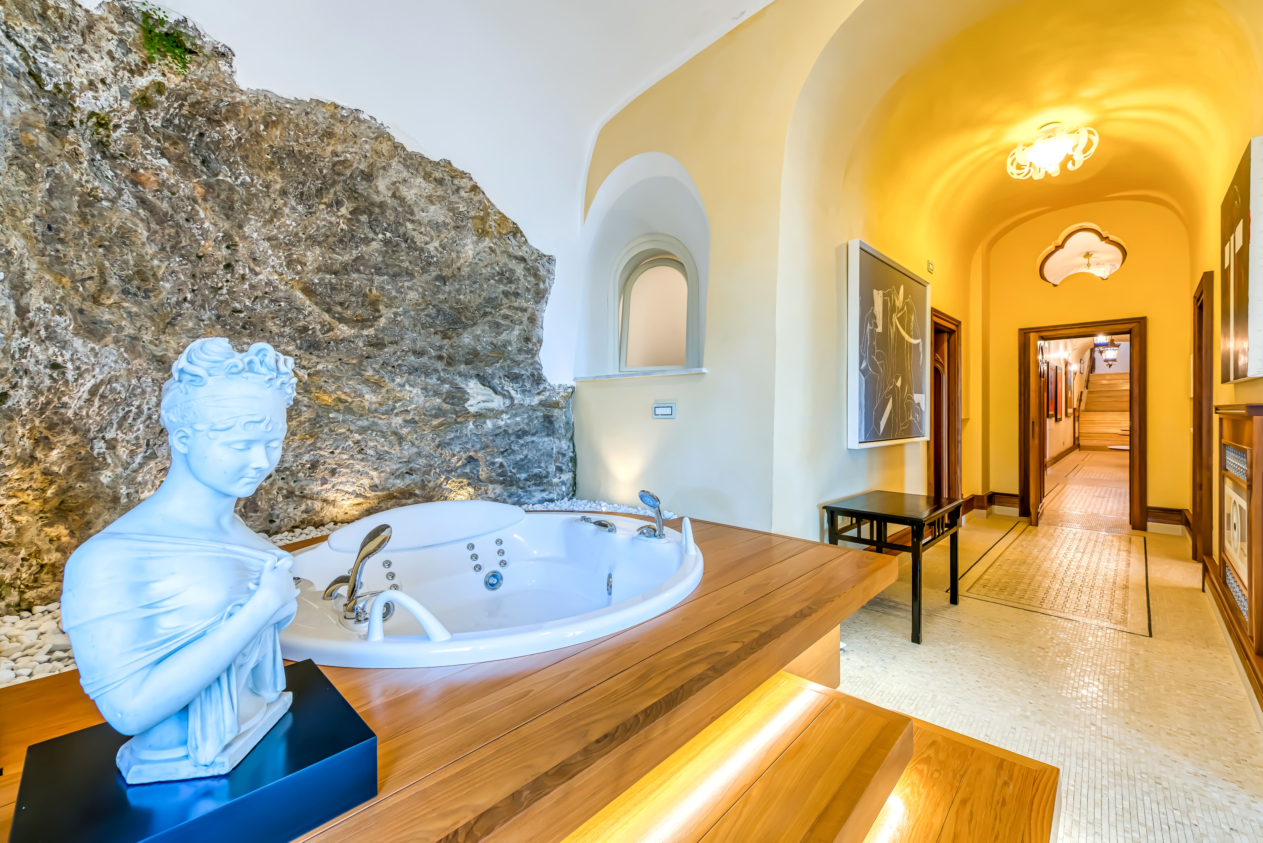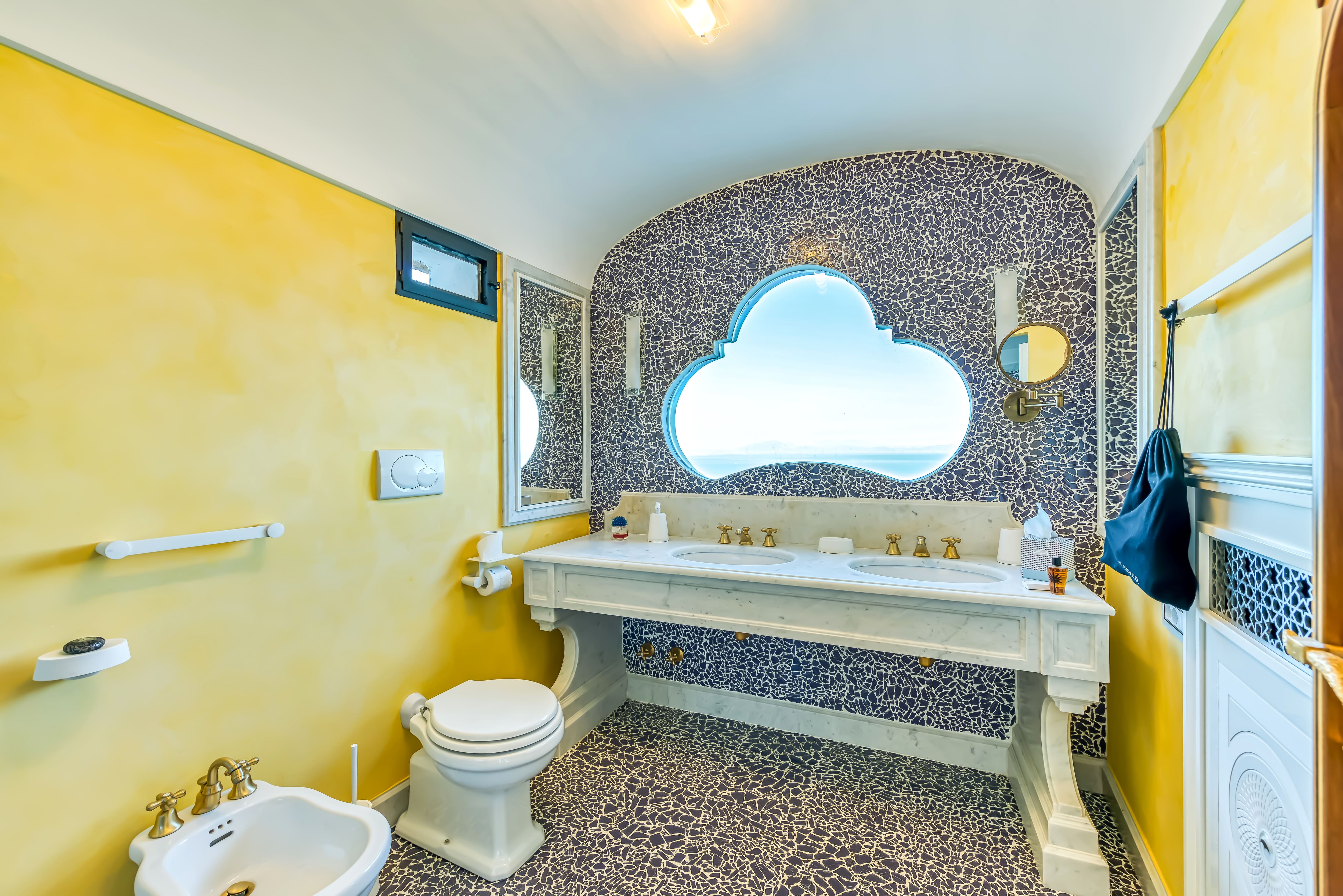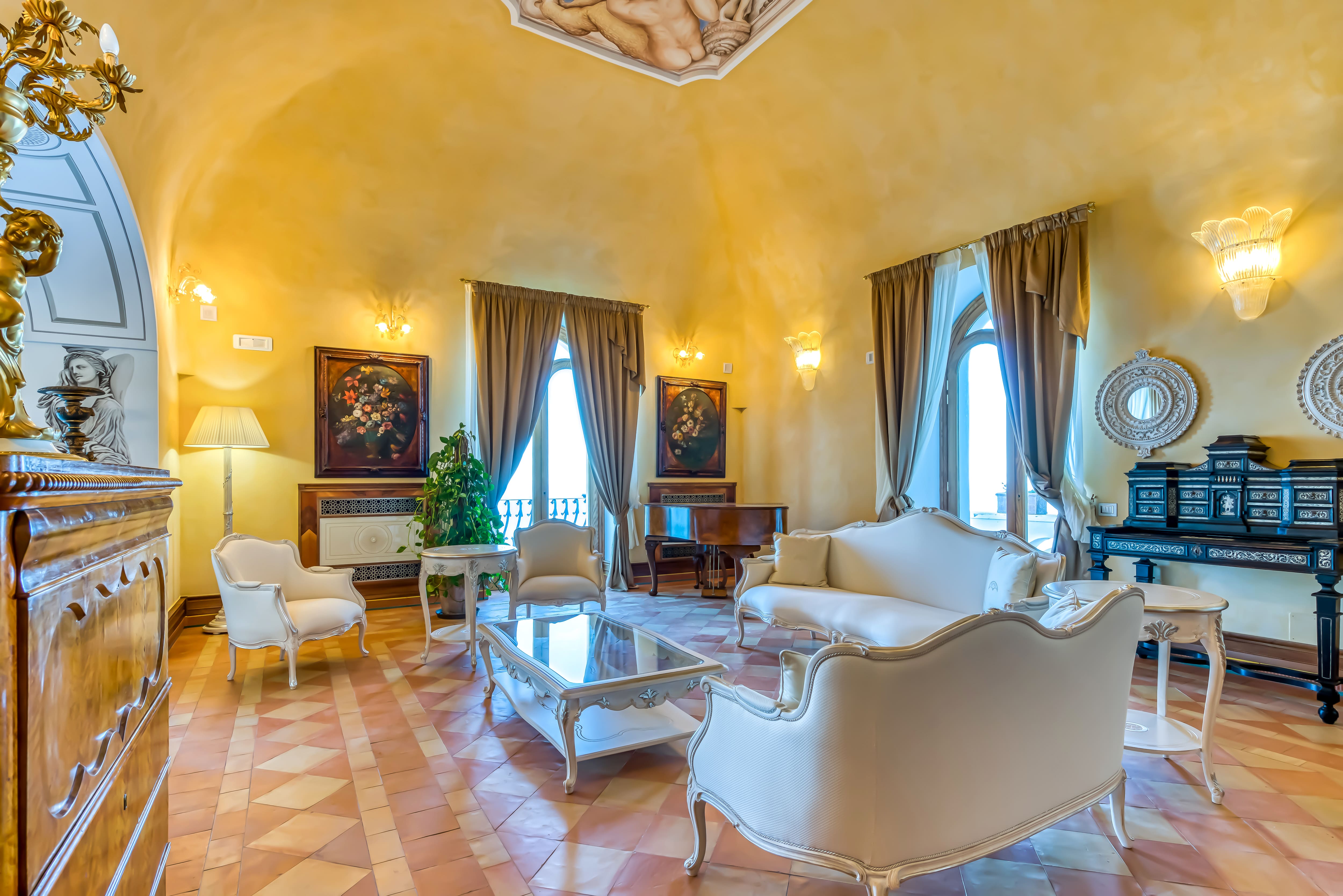 The interior of Palazzo Tramonti Amalfi is a masterpiece of design, blending classic Italian elements with modern luxury. Each of the six bedrooms offers an en-suite bath, providing privacy and comfort. The spacious living areas are adorned with beautiful artwork and antiques, creating an atmosphere of refined elegance. Though the kitchen isn’t photographed, it matches the home’s overall high standards, ensuring that meal preparation is both enjoyable and efficient.