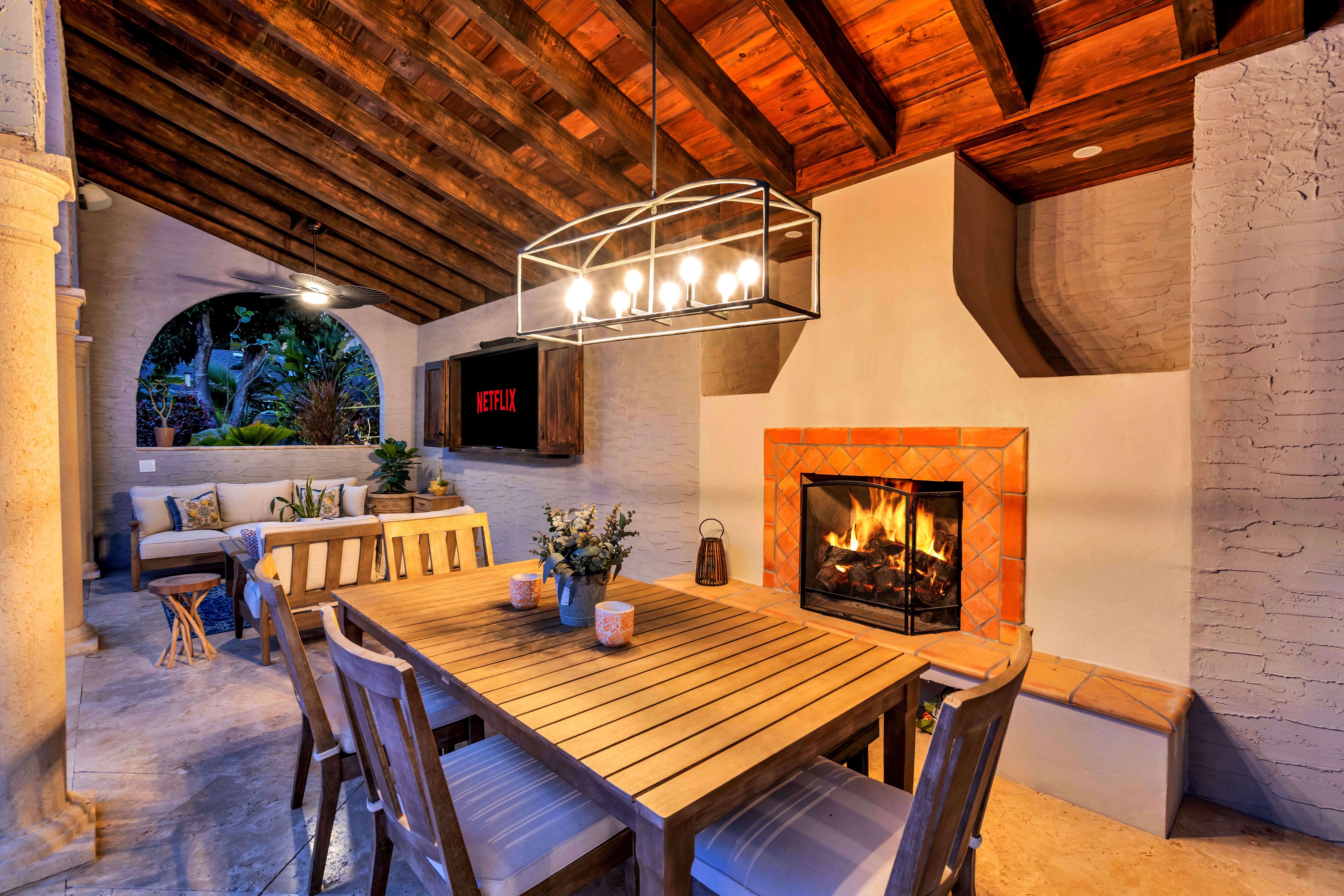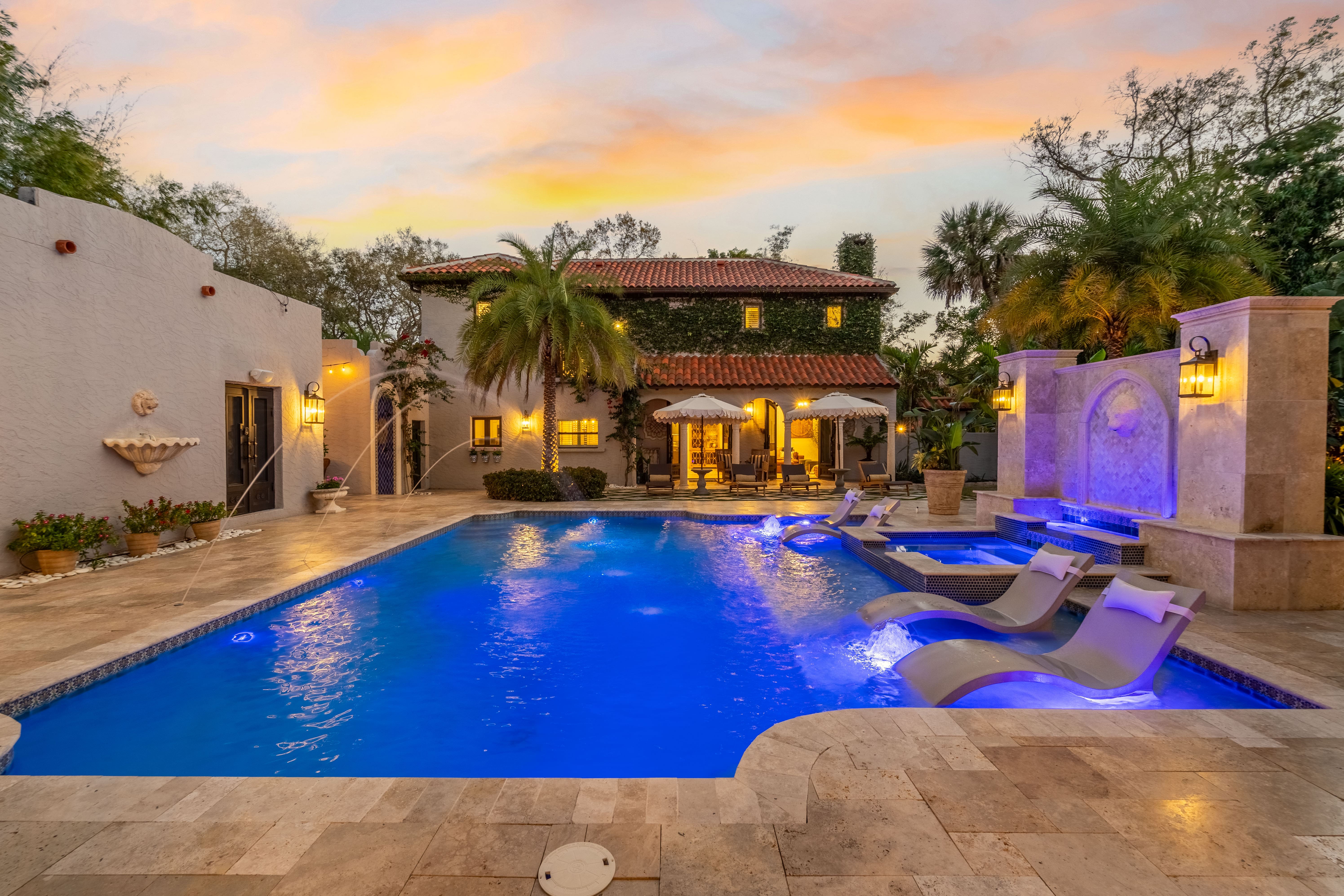This remarkable estate accommodates 19 guests across nine bedrooms and five bathrooms, distributed between the main house (four bedrooms), guest house (two bedrooms), studio apartment (one bedroom), and pool house (two bedrooms). Ample on-site parking includes an electric vehicle charging station, with additional street parking available. A rental car is highly recommended to fully explore Sarasota County’s attractions and beaches, with the property’s convenient location providing easy access to major highways. Browse our luxury villa rentals in United States for more exceptional properties nationwide.