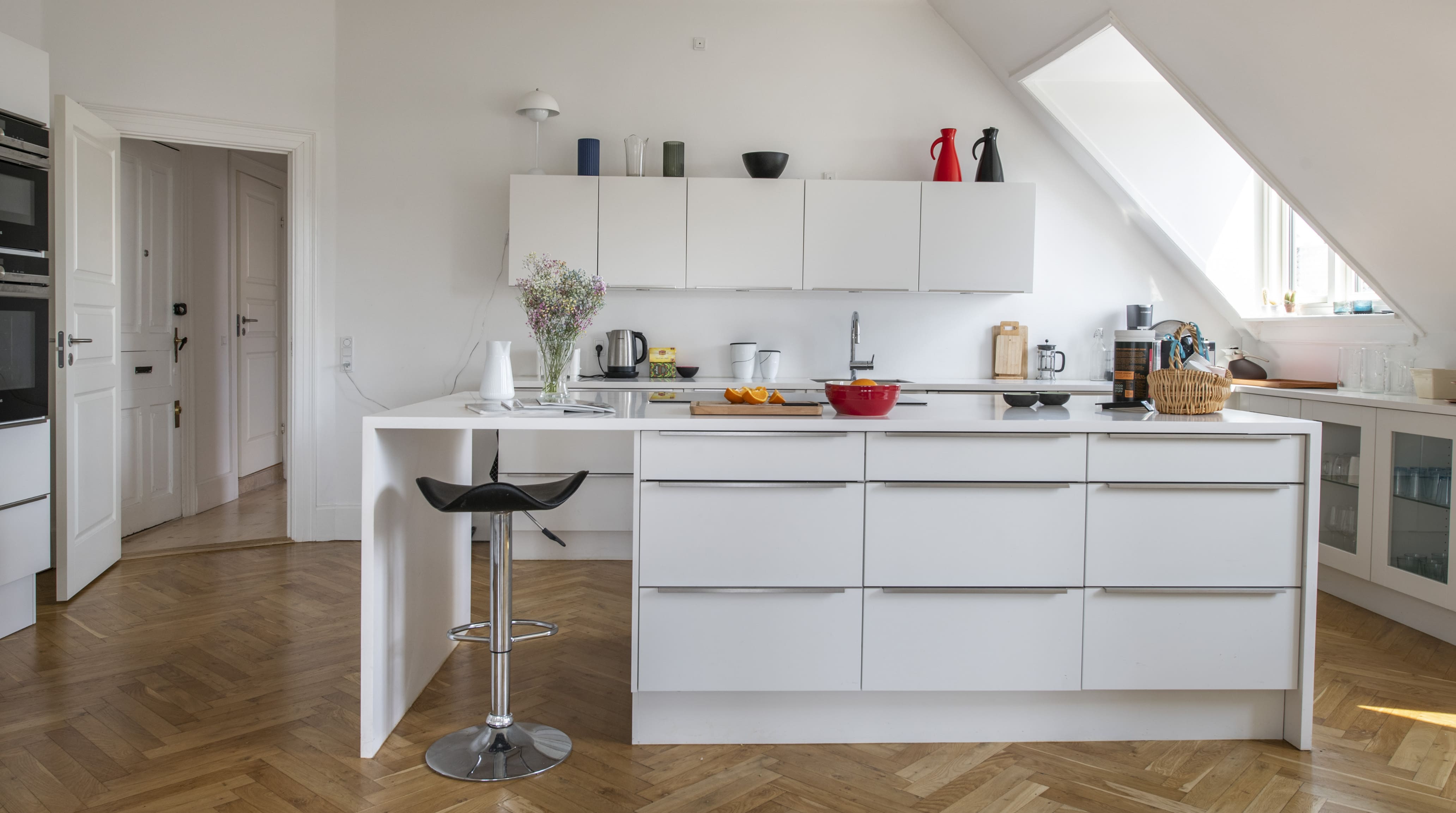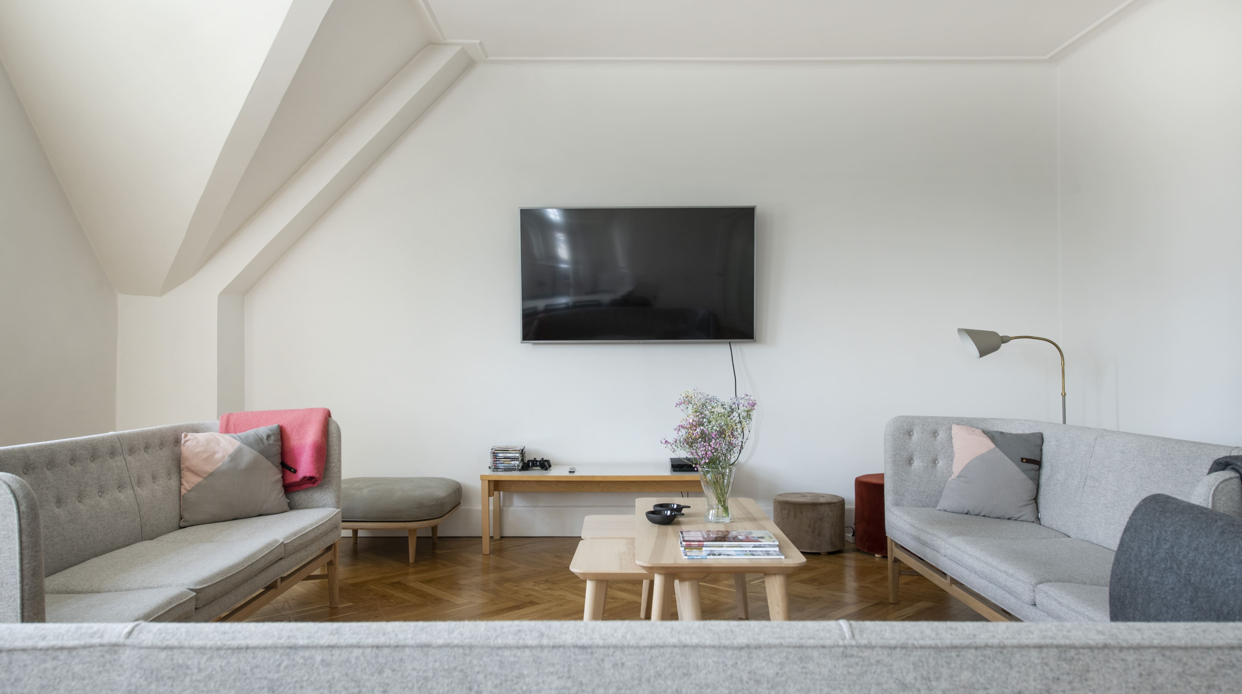 The penthouse accommodates up to six guests across its three bedrooms and two bathrooms. Please note, access requires navigating steep stairs, and the vibrant neighborhood may be lively in the mornings. A no-shoe policy helps maintain the pristine interior. To discover more stunning properties, browse our luxury villa rentals in Denmark.