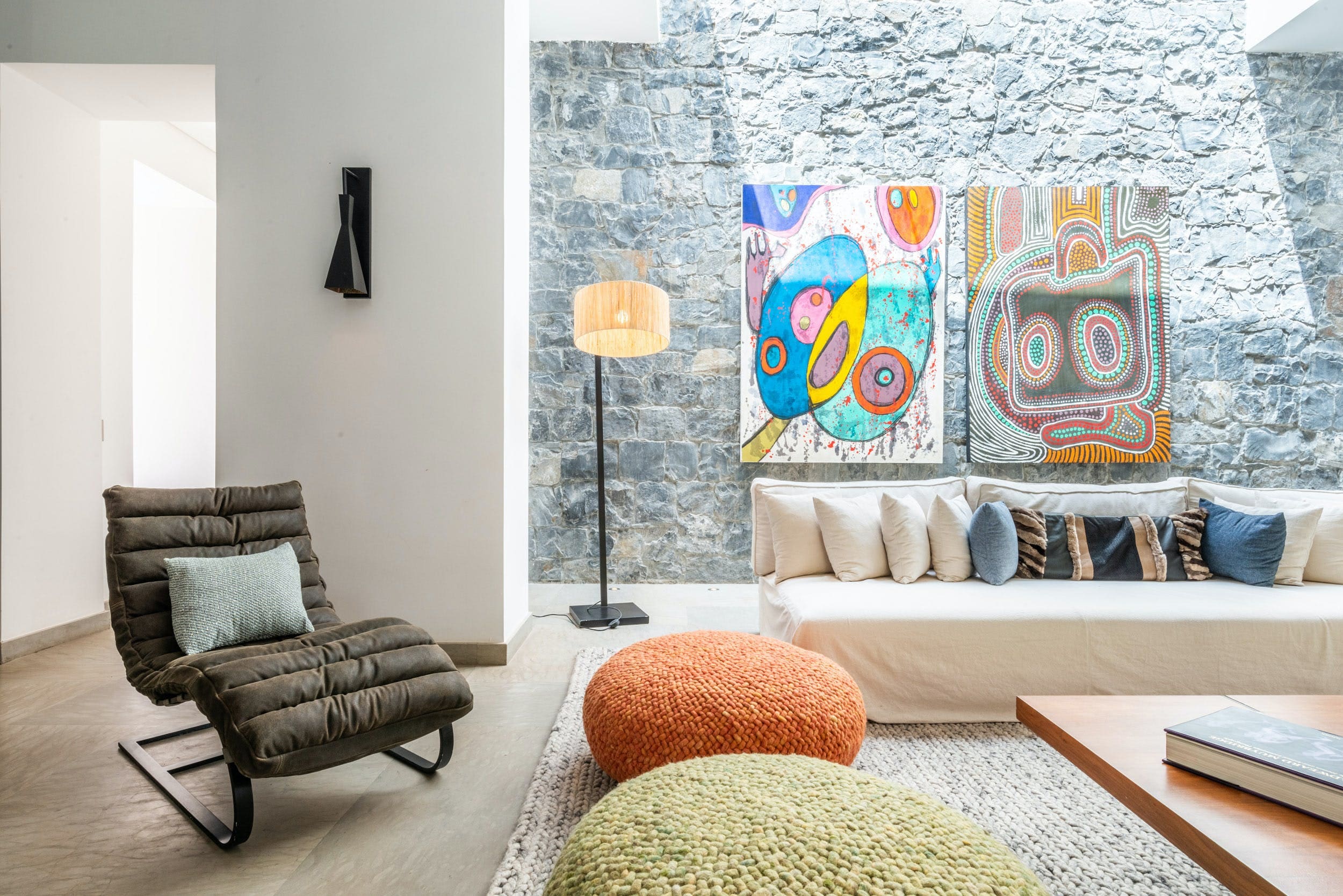 Step inside and be captivated by the harmonious blend of traditional Moroccan architecture and modern elegance. The spacious interior features six beautifully appointed bedrooms and five luxurious bathrooms, accommodating up to twelve guests comfortably. Expansive windows flood the rooms with natural light, highlighting the rich textures of exposed stone and wood, complemented by elegant furnishings. The sleek kitchen is perfect for preparing delightful meals, while the living area, adorned with abstract art, offers a cozy spot for relaxation.