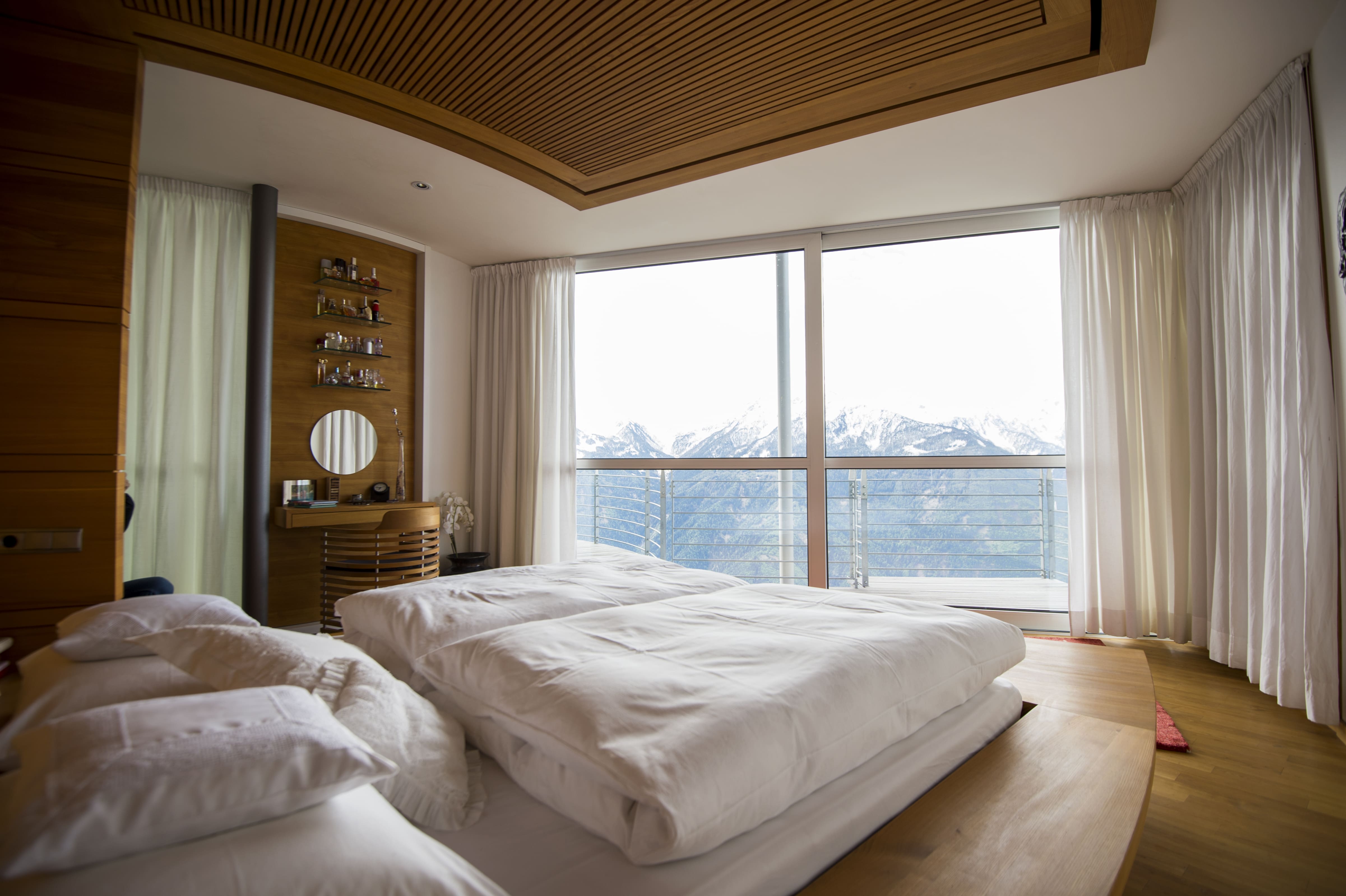 The crown jewel is the rooftop terrace, accessible via the dramatic spiral staircase, offering 360-degree Alpine vistas. The indoor swimming pool and hot tub provide year-round relaxation, while multiple private balconies from each room create intimate outdoor retreats. The mountainside location ensures complete privacy while positioning you perfectly for hiking adventures into the surrounding peaks.
