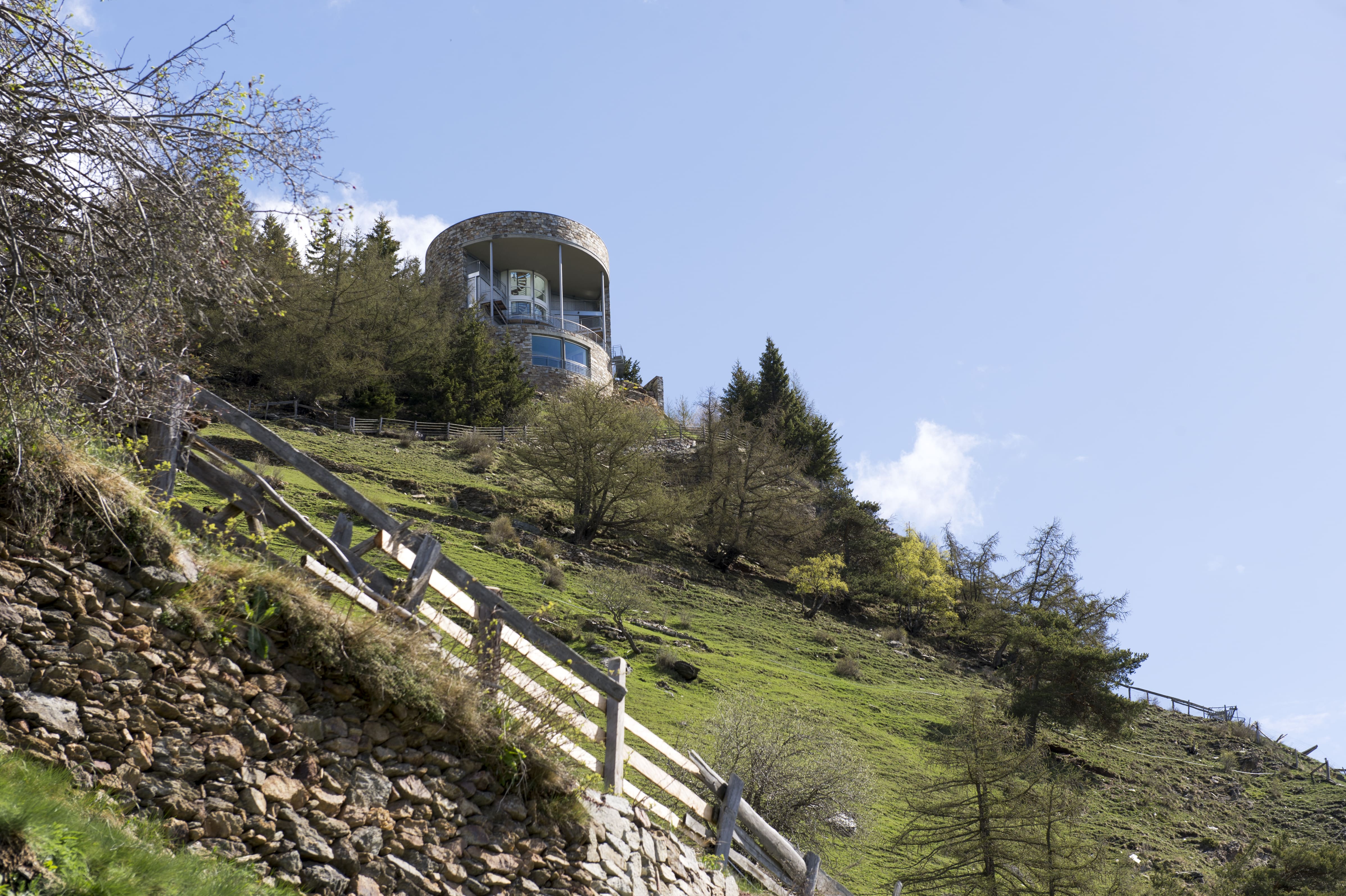 This striking luxury villa South Tyrol commands extraordinary Alpine panoramas from its unique tower design, positioned on a mountainside where every level reveals breathtaking Ötztal Alps vistas. The modernist architecture creates dramatic vertical living spaces across four floors, with the glass spiral staircase serving as both functional element and sculptural centerpiece.