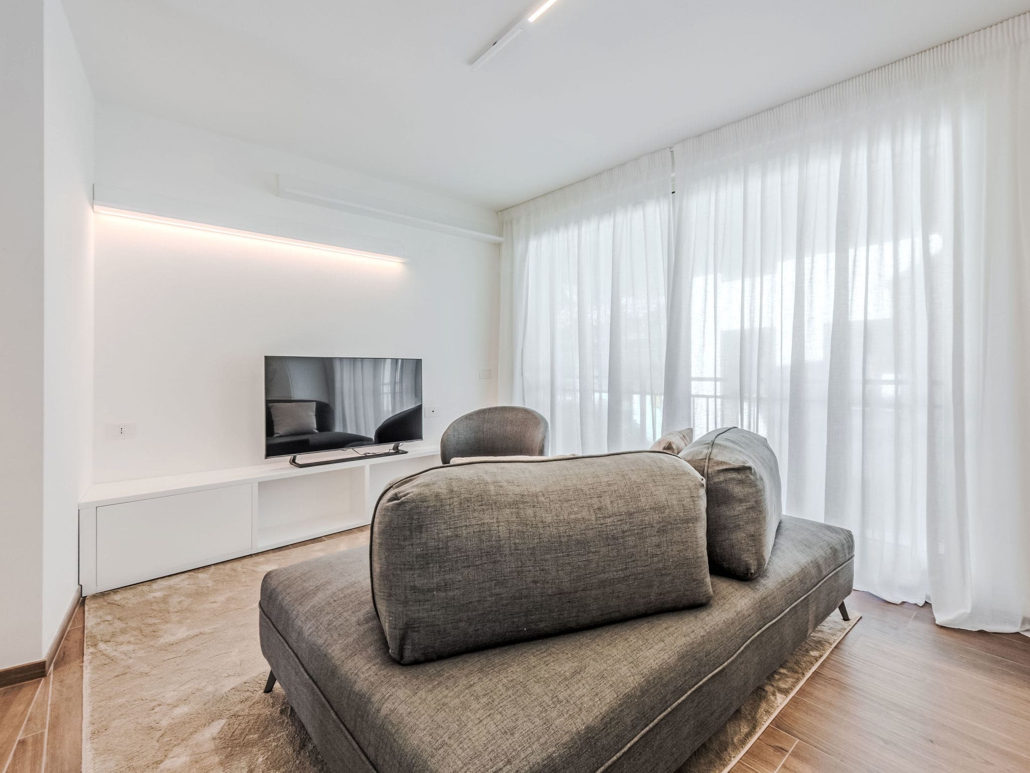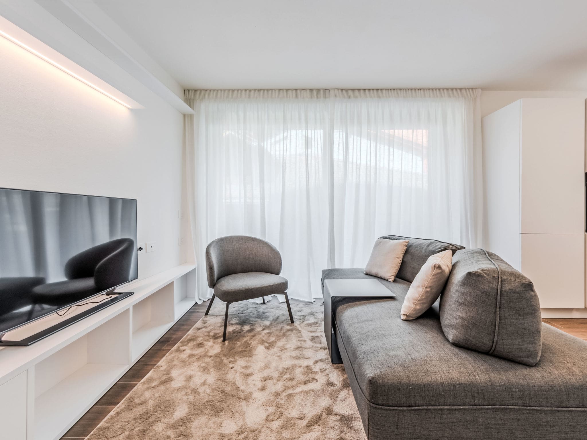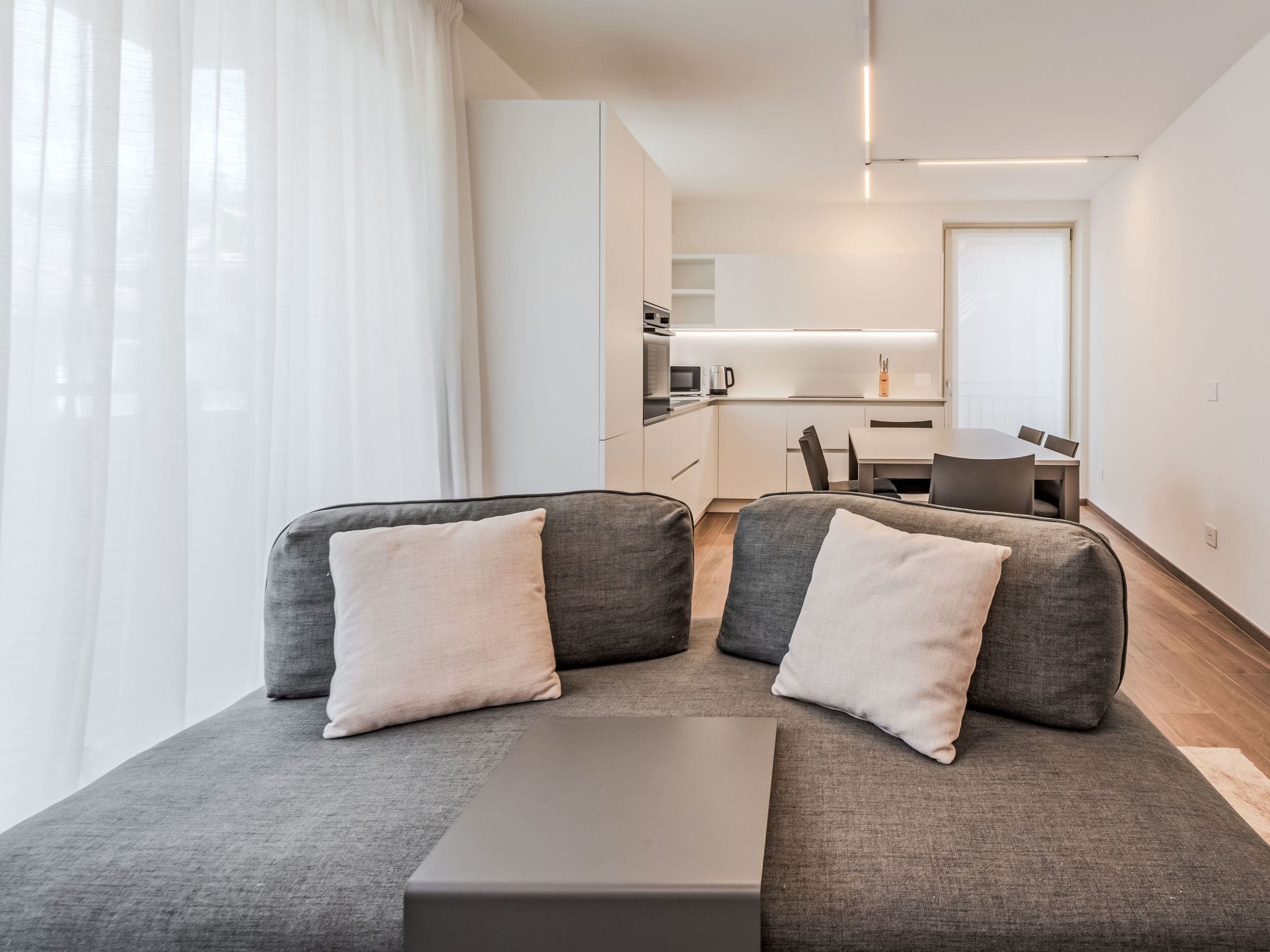 The heart of the villa is the spacious open-plan living and dining area, where floor-to-ceiling windows flood the space with natural light and offer captivating views across Pinzolo’s charming streets. The contemporary kitchen comes fully equipped with premium appliances, including an induction hob, dishwasher, oven, microwave and kettle, making it perfect for preparing everything from quick breakfasts to elaborate evening meals.