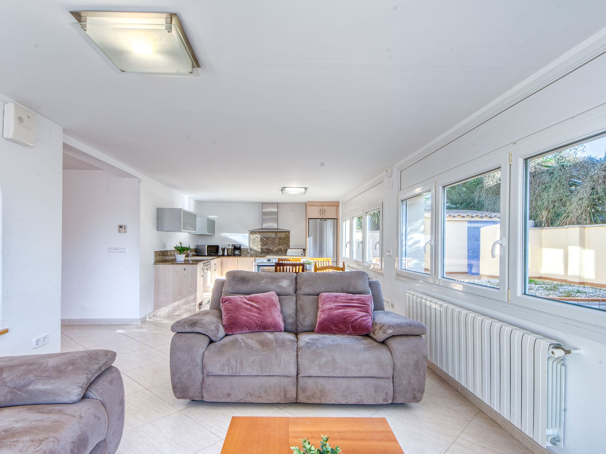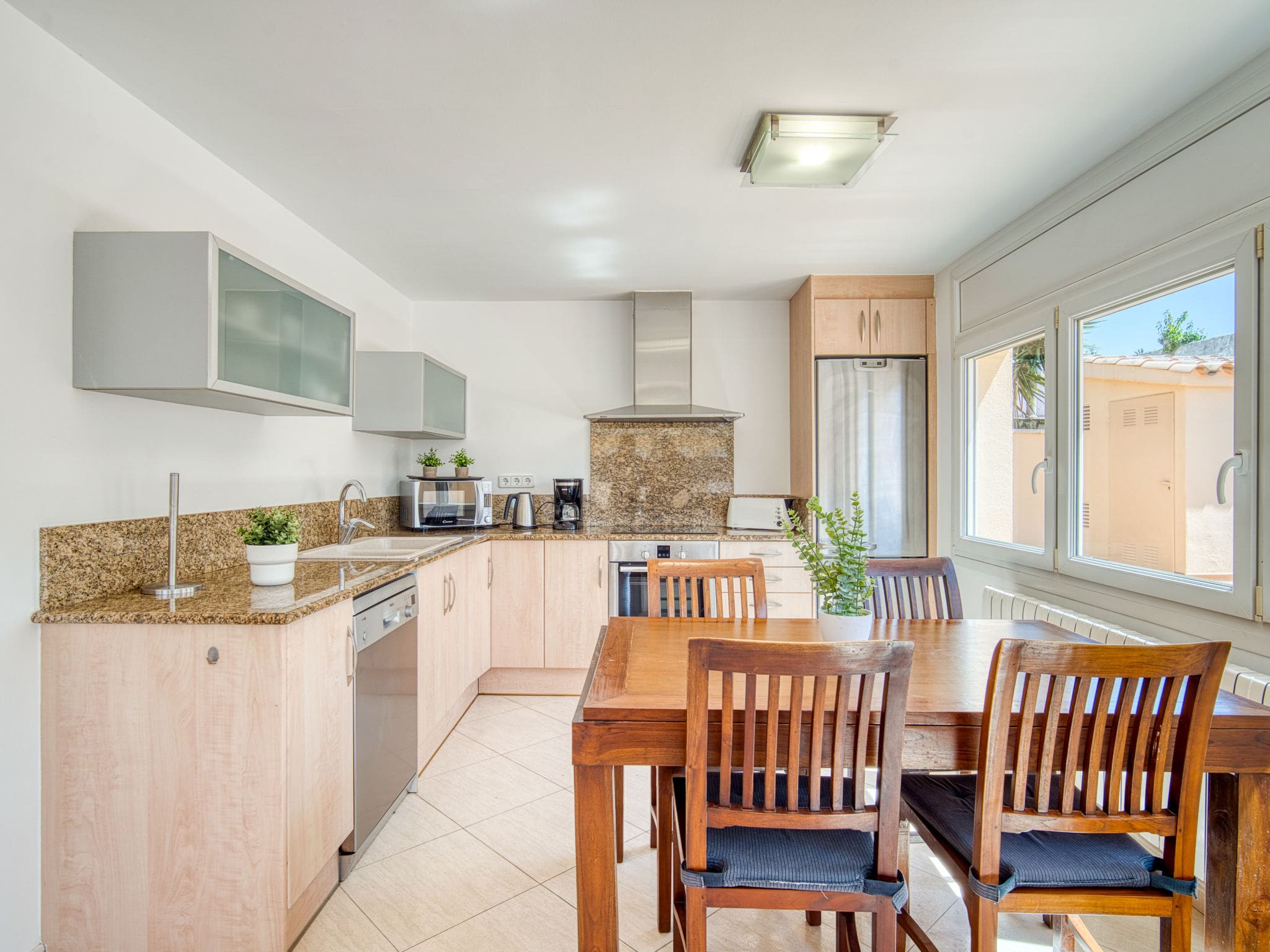 The villa’s outdoor spaces truly shine with a private angular swimming pool measuring nine by four metres, offering varying depths from one to two metres. Available from April through October, the pool features an internal staircase and provides the perfect respite during warm Costa Brava days. The surrounding terrace is furnished with comfortable deck chairs and outdoor dining furniture, creating multiple zones for relaxation and entertainment.