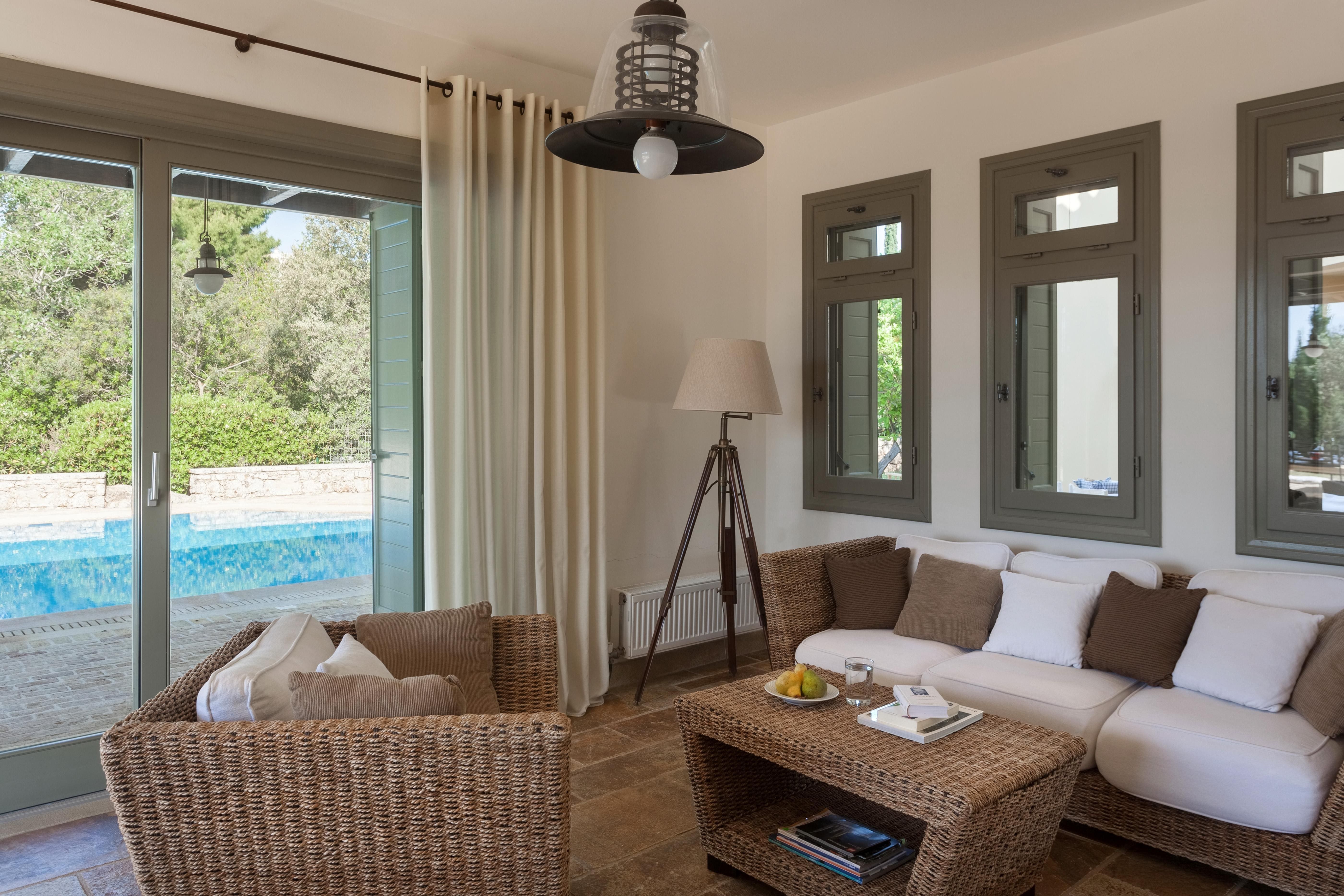 The outdoor area is a paradise for sun-seekers and nature lovers alike. The private swimming pool, surrounded by lush gardens and olive and pine trees, invites you to unwind under the Greek sun. Enjoy al fresco dining on the terrace while taking in the breathtaking seaview. For the active enthusiast, a tennis court and access to water sports provide endless opportunities for adventure.