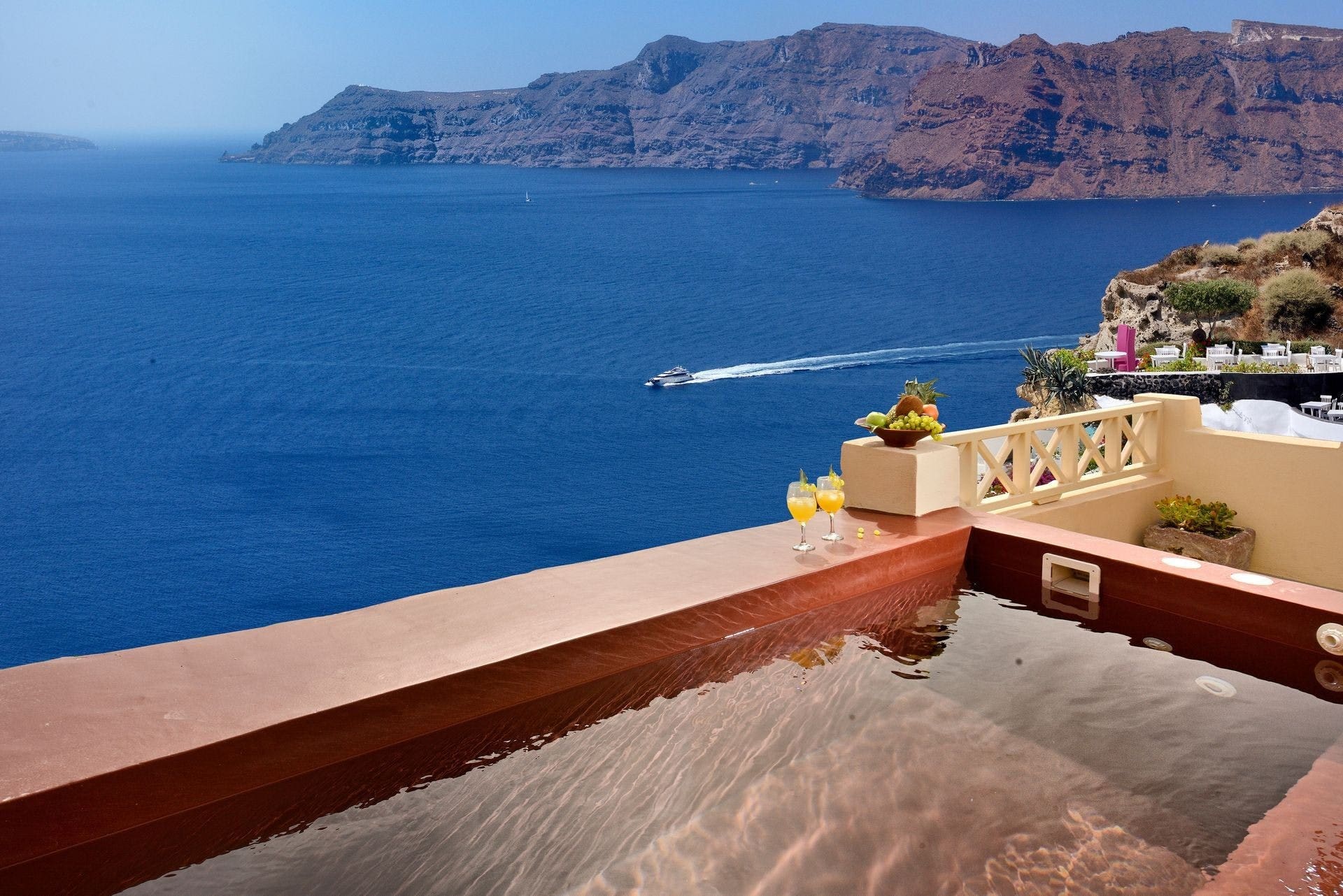 A: Yes, the outdoor hot tub provides a perfect spot for enjoying Santorini’s sunsets.