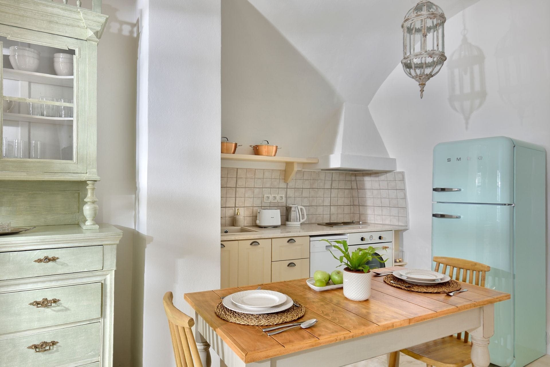 Step inside to discover a space that marries traditional Cycladic architecture with modern amenities. The apartment features a bright and airy living area, where domed ceilings create a sense of space and grandeur. The fully-equipped kitchen invites culinary exploration, complemented by a dining table that doubles as a workspace, perfect for remote work. With three beautifully appointed bedrooms, including a mezzanine main bedroom open to the living space, and two bathrooms, this home comfortably accommodates up to six guests. A cozy sofa bed in the living room is available for a seventh guest, though we recommend the apartment for six for optimal comfort.