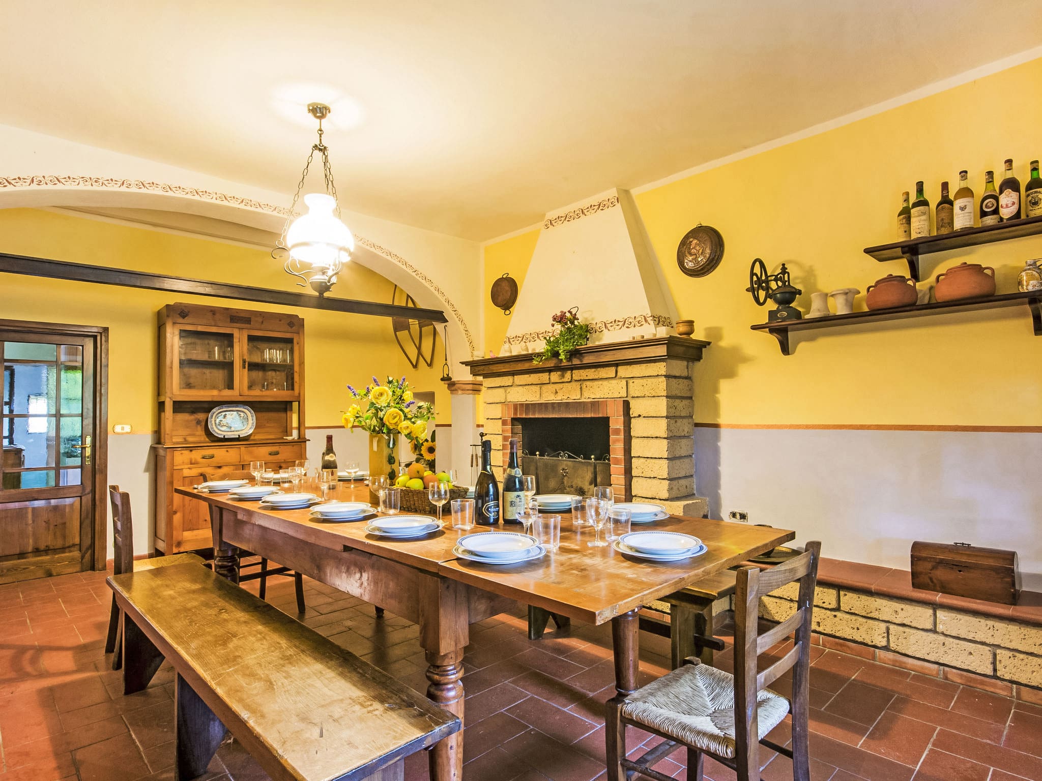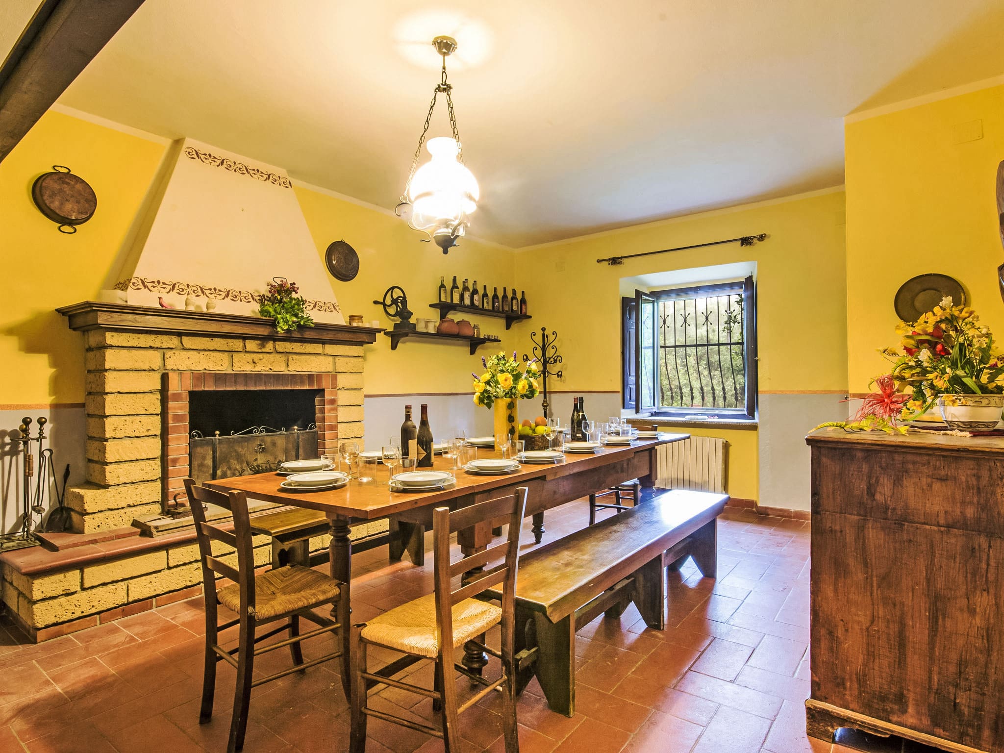 This elegant 10-room residence spans two thoughtfully designed levels, featuring antique furnishings and tasteful Liberty-style décor that creates a sophisticated yet relaxed atmosphere throughout. The main floor welcomes guests with a spacious living room complete with satellite television and DVD player, opening directly onto the beautiful loggia that overlooks the swimming pool. The formal dining room centres around an impressive open-hearth fireplace, perfect for gathering around during cooler evenings. A well-appointed kitchen offers four hot plates, oven, dishwasher, and microwave, while the ground floor also houses one double bedroom with ensuite shower facilities and an additional double bedroom.