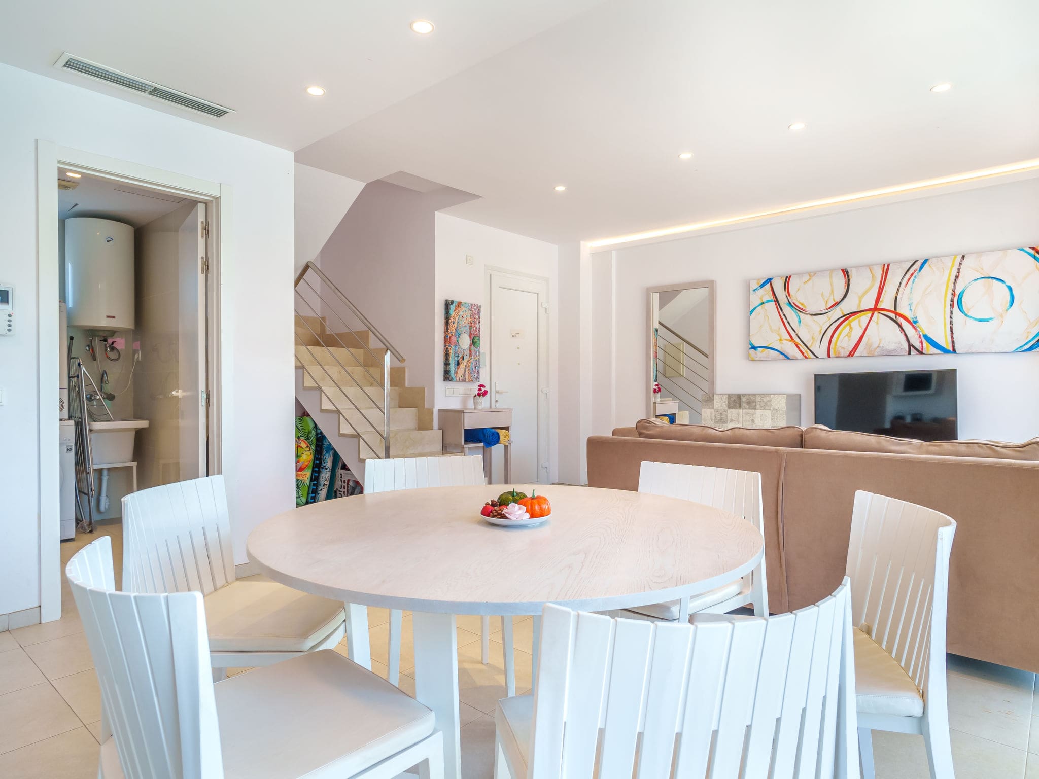 Built in 2017, this striking 110m² semi-detached property spans two thoughtfully designed levels. The ground floor features an open-plan living and dining area with panoramic windows that flood the space with natural light. Sliding doors create seamless indoor-outdoor flow to the private pool terrace. The contemporary kitchen comes fully equipped with modern appliances including dishwasher, oven, microwave, and electric coffee machine, plus a convenient dining area for casual meals.