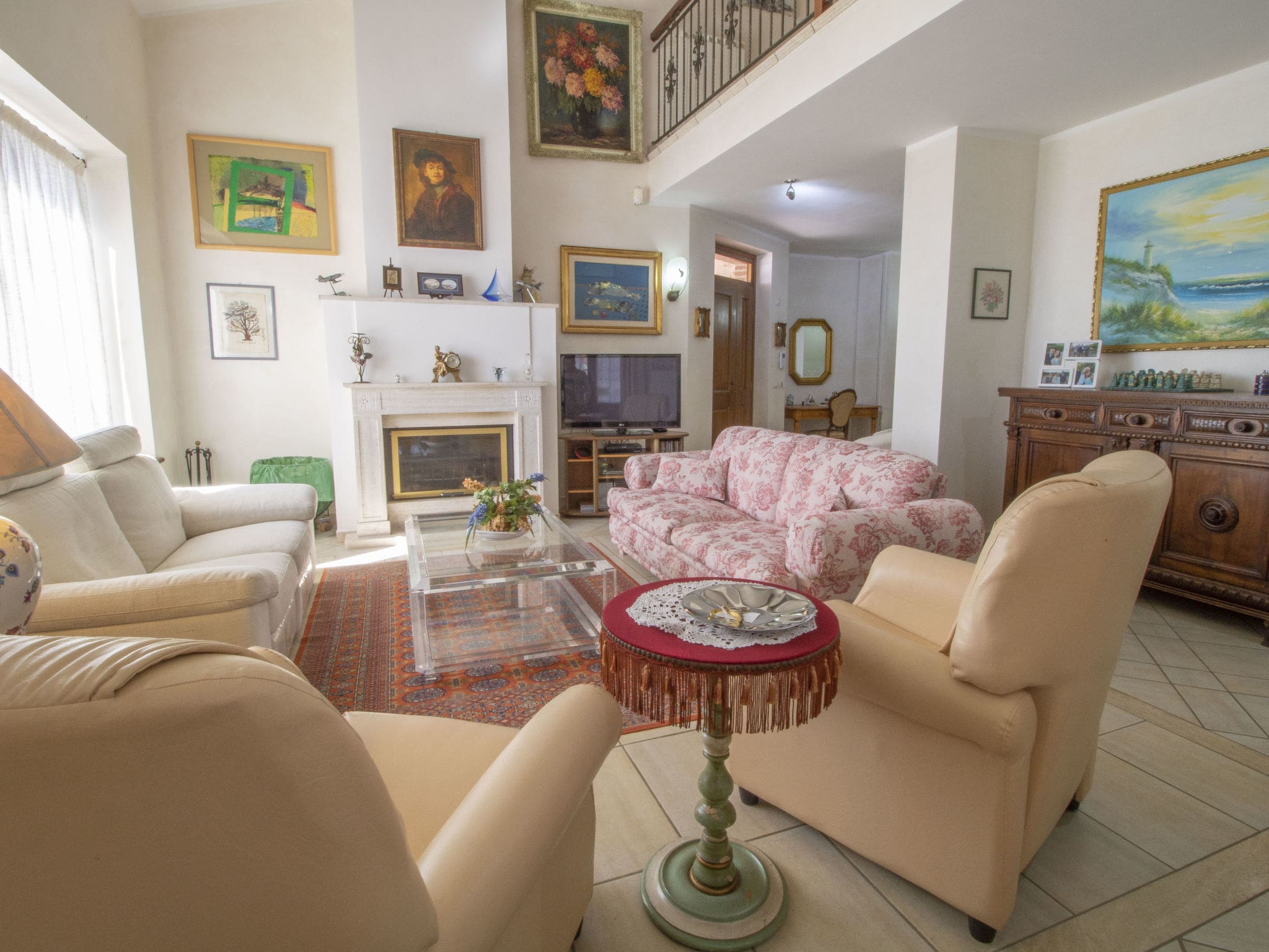 The villa’s thoughtfully designed interiors create an atmosphere of understated elegance. The ground floor features a generous open-plan living room anchored by an impressive open-hearth fireplace, perfect for gathering during cooler evenings. The separate dining room flows seamlessly to the outdoor terraces, encouraging the quintessential Italian lifestyle of indoor-outdoor living. Three double bedrooms on this level each feature private en-suite bathrooms with shower, bidet and modern fixtures.