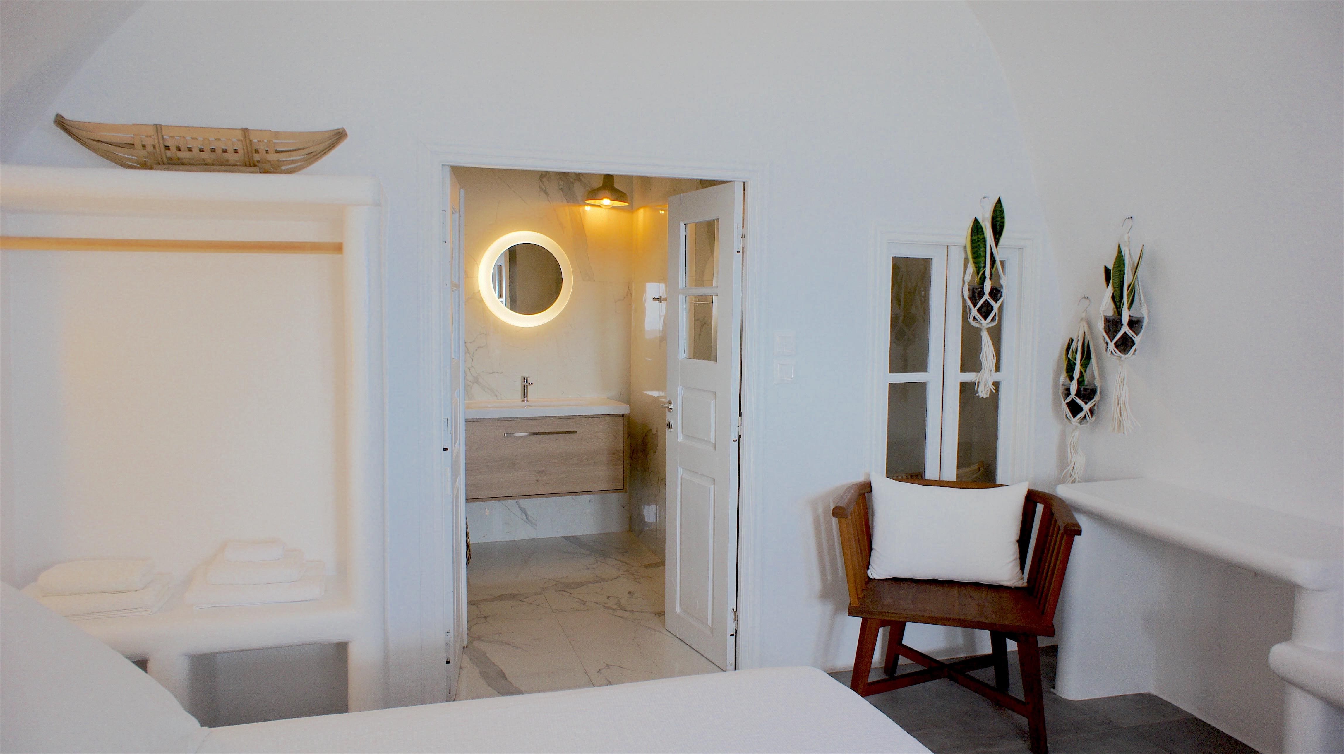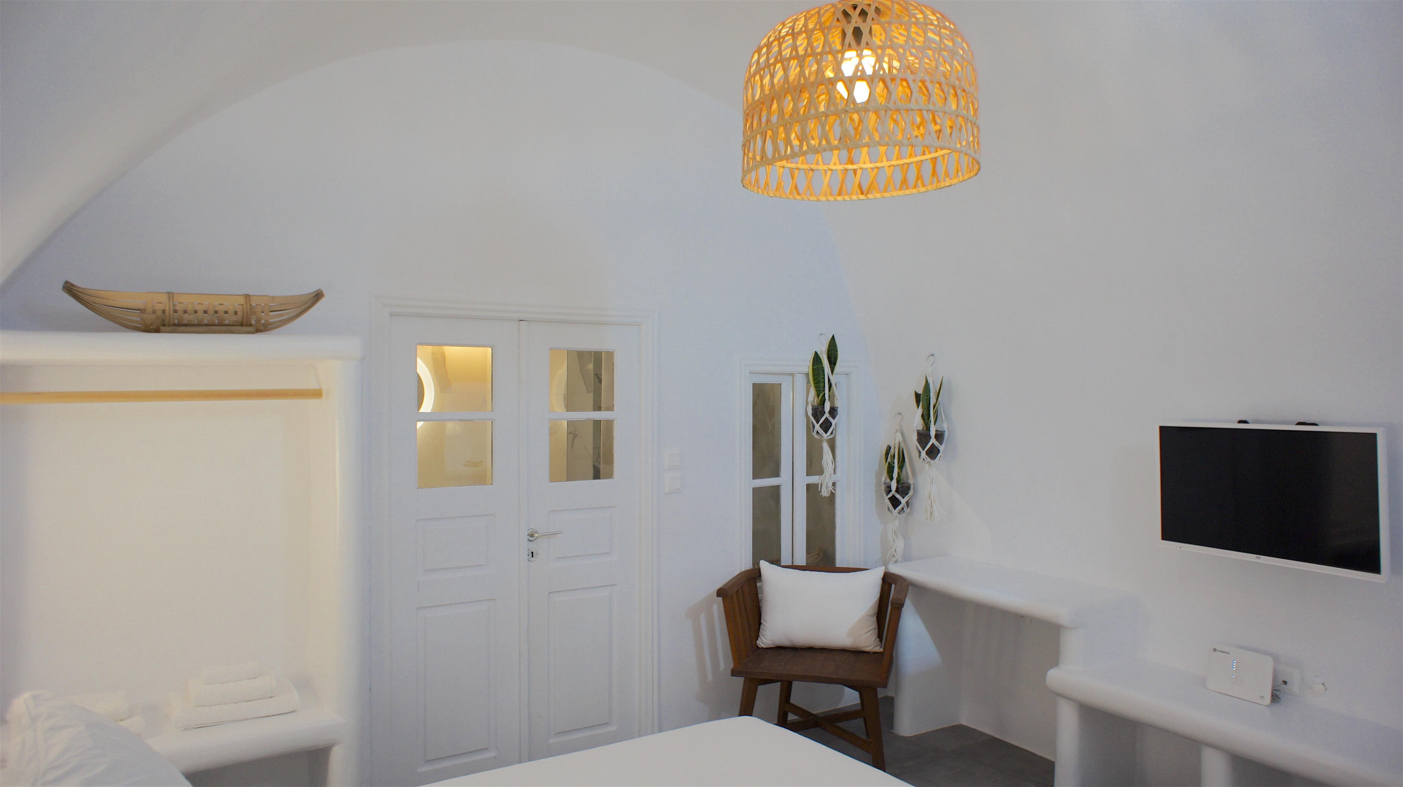 Step into a world of refined elegance within this Santorini apartment. Designed with a minimalist yet chic aesthetic, the space exudes tranquility through its soothing tones and stylish decor. The open-plan layout features a comfortable living area complete with plush seating, perfect for unwinding after a day of island exploration. The kitchenette, although compact, is well-equipped for preparing light meals and refreshments. Rest easy in the king-size bed, ensuring peaceful slumbers, while the modern bathroom offers a refreshing haven with its contemporary fittings.