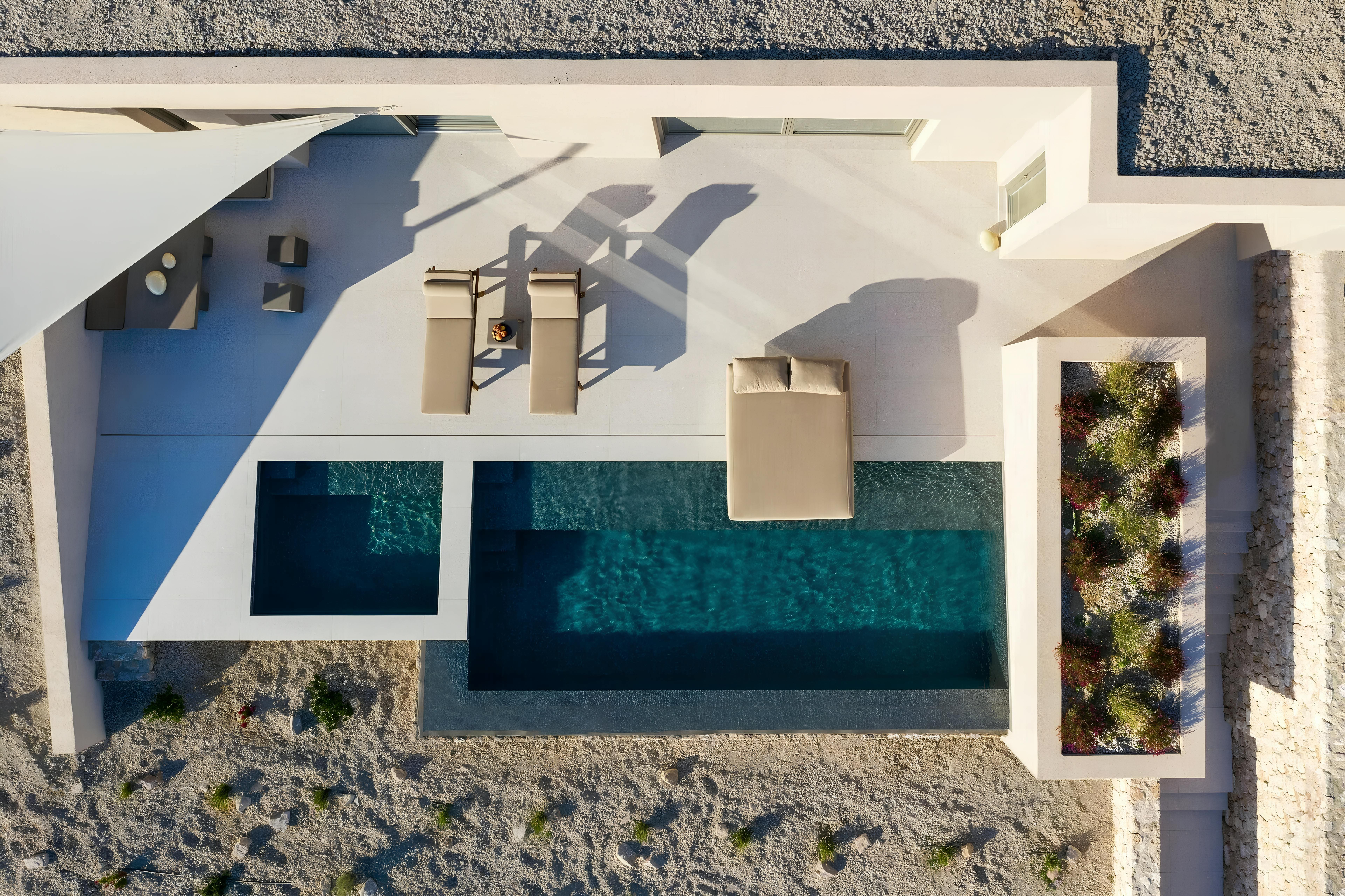 The villa’s outdoor spaces are designed for relaxation and admiration of Santorini’s natural wonders. The infinity pool seems to blend seamlessly with the azure Aegean Sea, offering a mesmerizing spot to unwind. Enjoy a soak in the hot tub while watching the sun dip below the horizon, or dine al fresco on the terrace, enveloped by the gentle sea breeze.