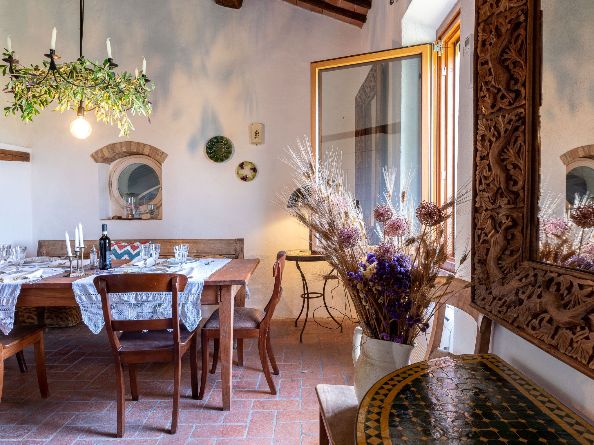 The villa’s elevated position provides breathtaking panoramic vistas across the Tuscan landscape, with Montalcino’s famous wine hills stretching to the horizon. Your private 1,000-square-meter fenced garden creates an intimate oasis, complete with a 9×5-meter private swimming pool available from mid-May through September. The covered terrace and patio areas, furnished with comfortable seating and barbecue facilities, provide perfect spots for al fresco dining while soaking in the spectacular countryside views.