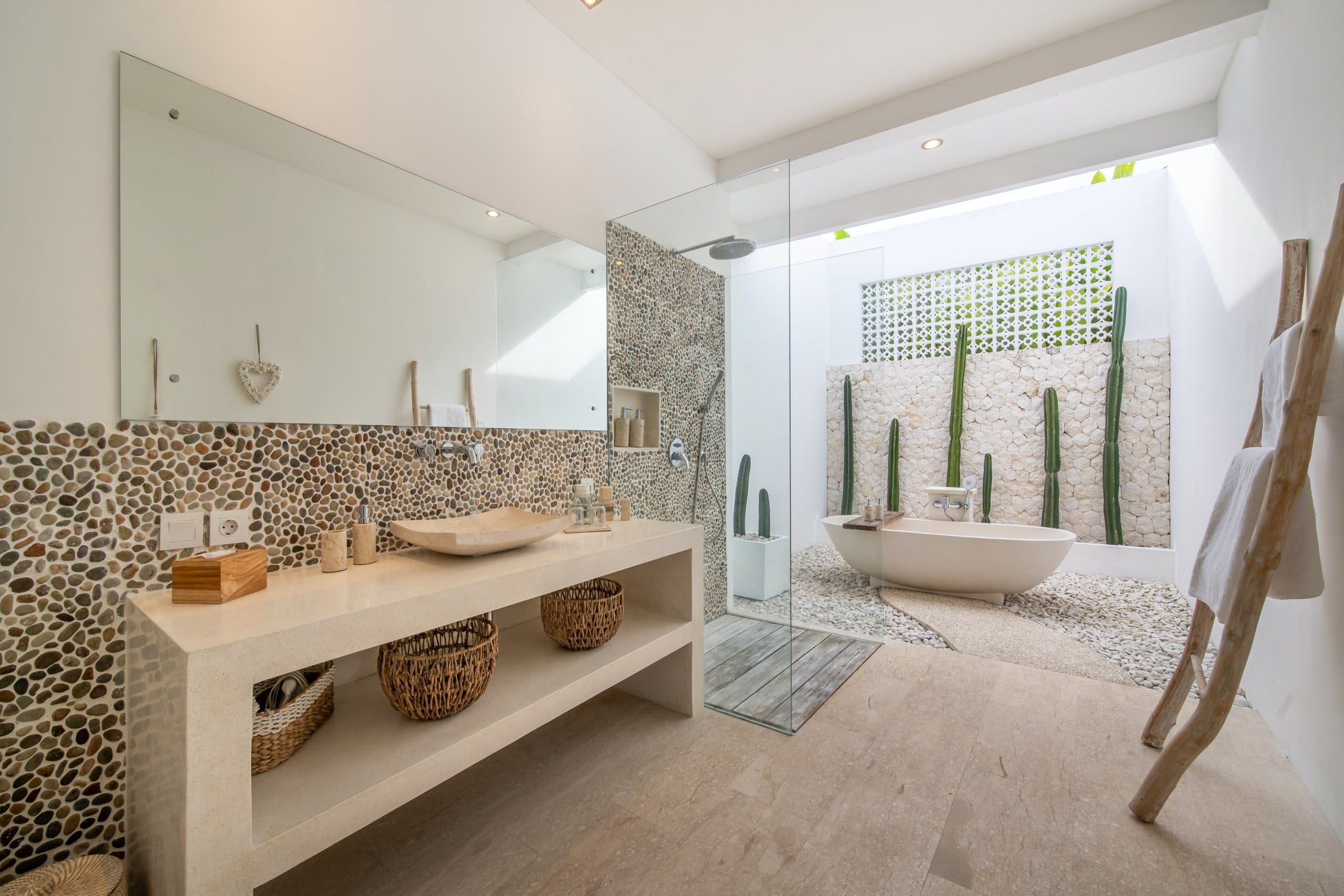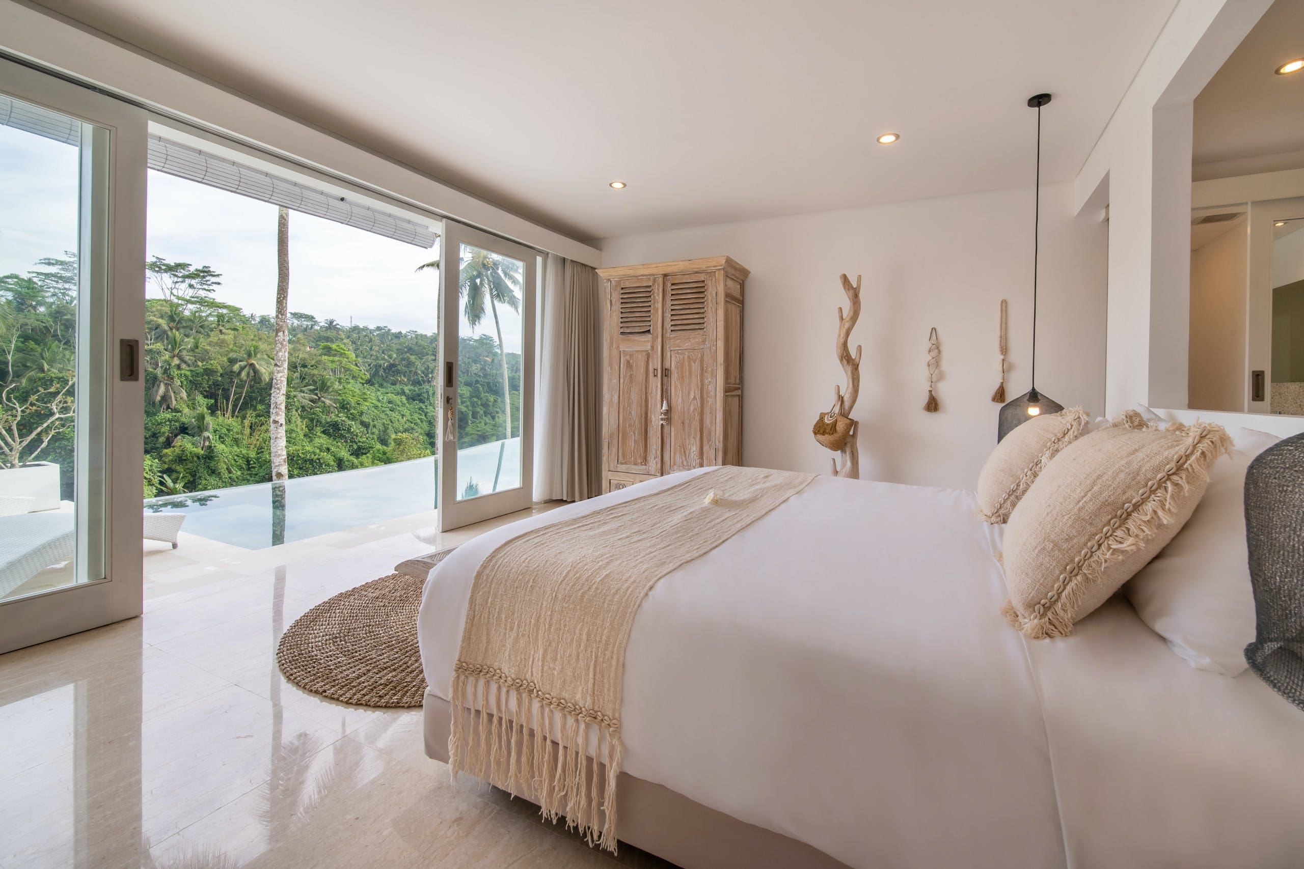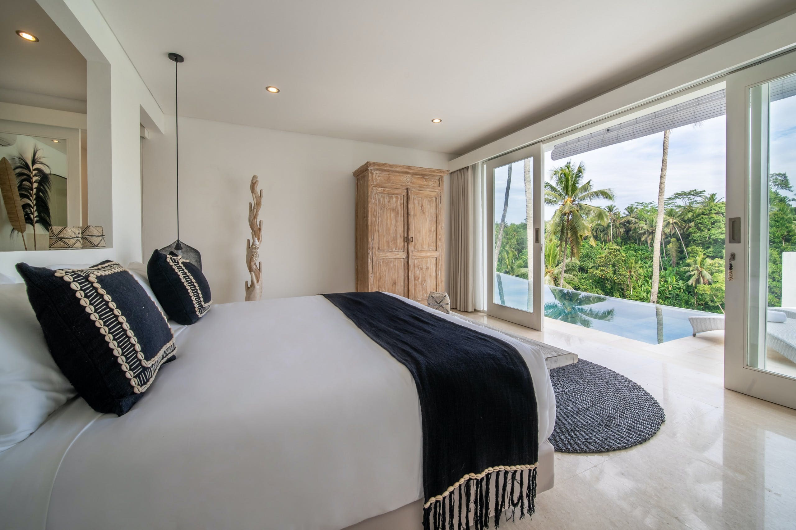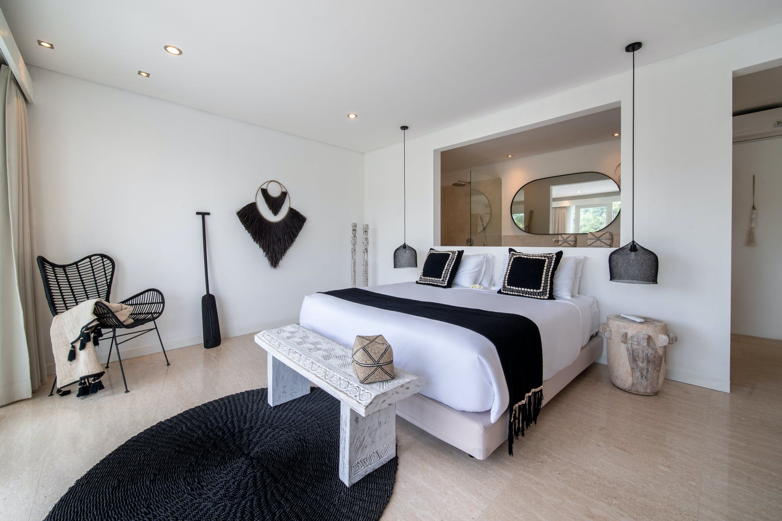 The villa’s interior is a masterpiece of contemporary design, perfectly blending traditional Balinese elements with modern comforts. The open-plan living spaces are both airy and expansive, with large windows that invite natural light and offer panoramic views of the surrounding landscape. The state-of-the-art kitchen is fully equipped, ideal for culinary enthusiasts, while each of the four bedrooms is a sanctuary of comfort, complete with en-suite bathrooms and plush furnishings that promise restful nights.