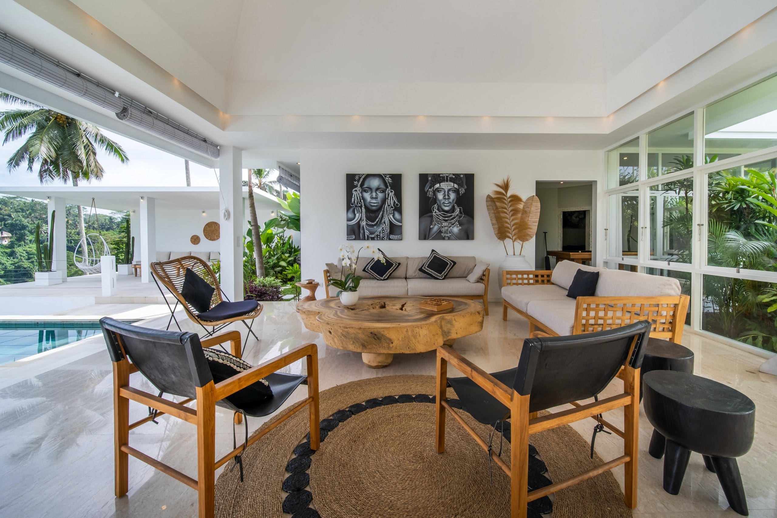 The villa’s outdoor spaces are simply breathtaking. The dual-level infinity pool seems to extend into the horizon, offering uninterrupted views of the ocean. Various terraces provide ample space for al fresco dining or simply soaking up the sun. The lush gardens, rich with tropical flora, create a private oasis, making it an ideal spot for morning yoga or evening cocktails.