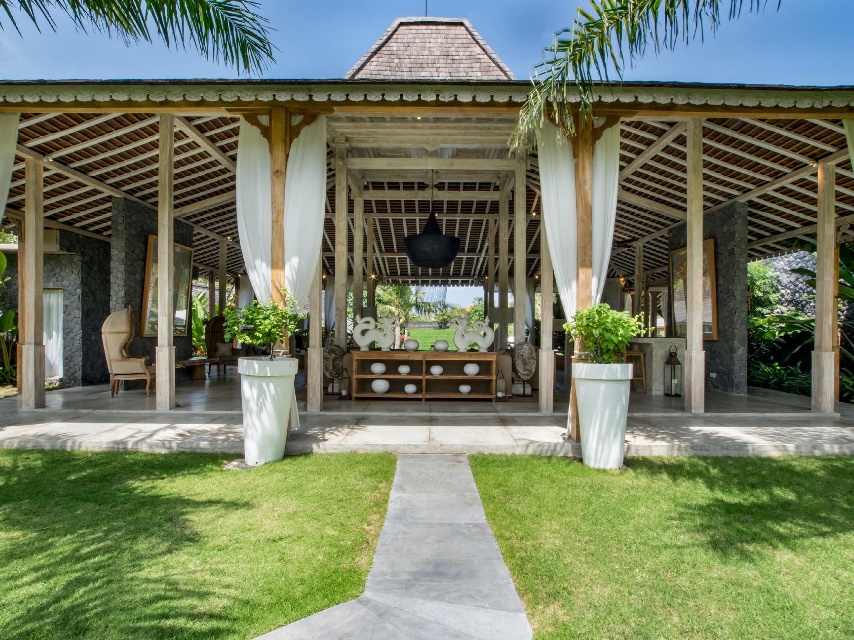 Step outside to discover the villa’s lush tropical gardens and stunning outdoor spaces. Three private swimming pools are surrounded by verdant greenery, creating a serene oasis for relaxation and recreation. The expansive lawns offer ample space for hosting weddings or lively gatherings, all with the backdrop of Bali’s natural beauty.