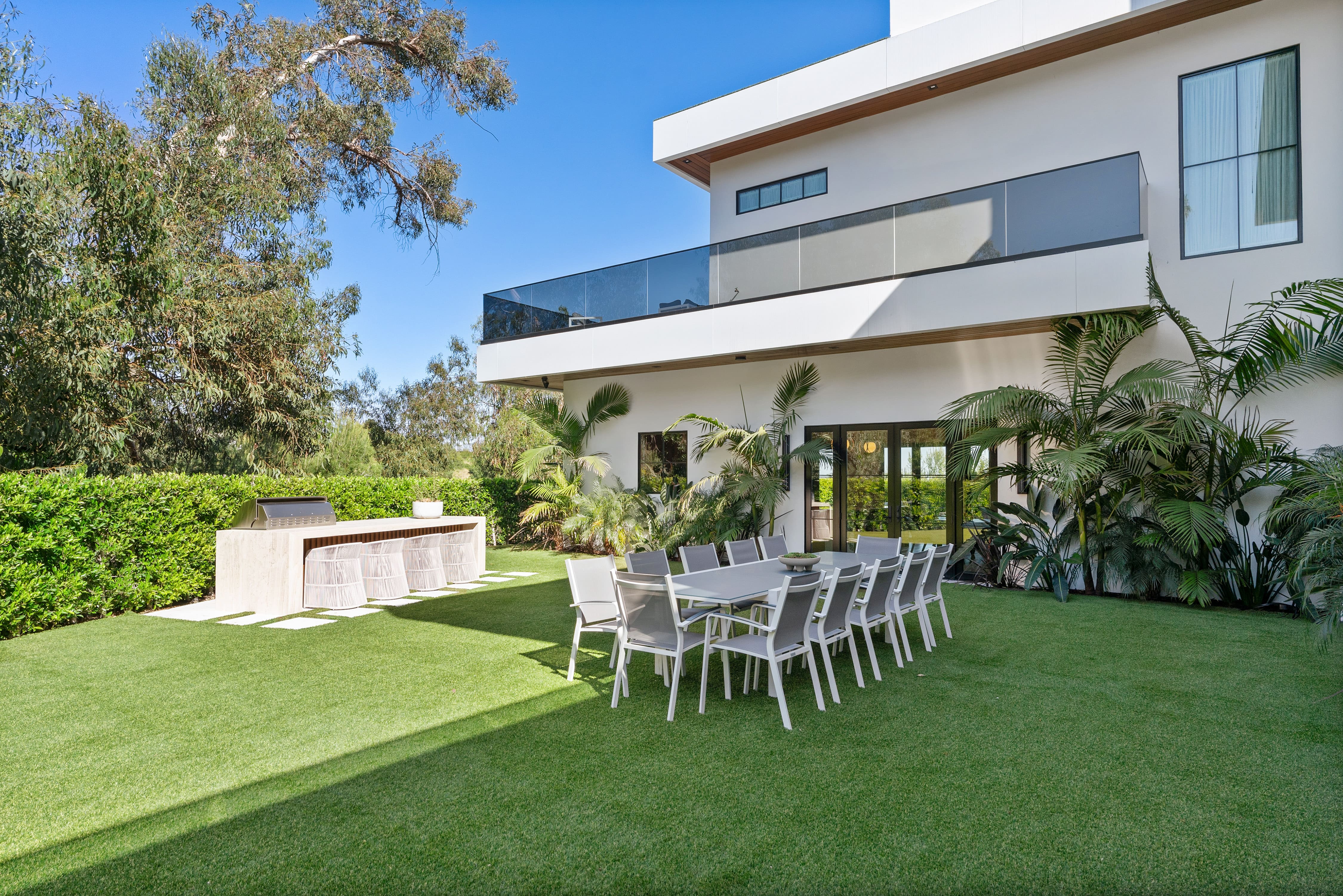 Outside, the villa’s grounds are nothing short of spectacular. Dive into the sparkling swimming pool, unwind in the bubbling hot tub, or enjoy alfresco dining under the Californian sky. The expansive terraces and lush lawns provide ample space for relaxation and entertainment, all set against the backdrop of Los Angeles’ iconic landscape.