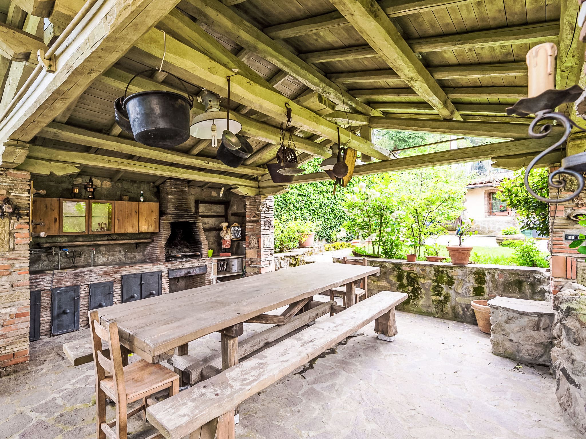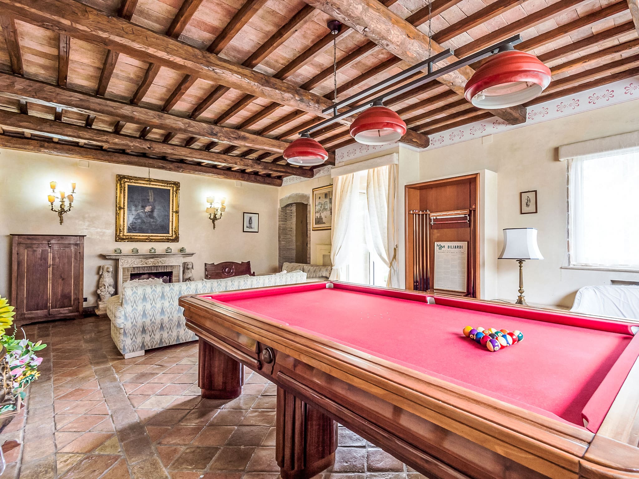 Spread across three carefully designed levels, this magnificent property accommodates up to 13 guests in five beautifully appointed bedrooms, each complemented by its own private bathroom. The ground floor welcomes you with a spacious living room featuring an open-hearth fireplace, perfect for gathering with family and friends. A dedicated billiard room provides entertainment, while the impressive 30-square-meter open kitchen serves as the heart of the home, complete with professional-grade appliances, a dining table, and its own fireplace.