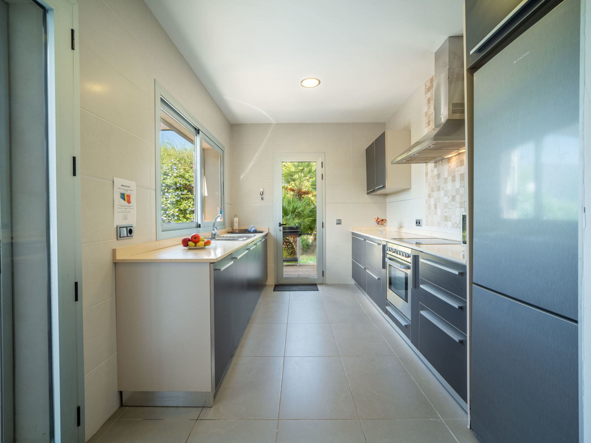 The ground floor houses two elegant double bedrooms, each furnished with twin beds and panoramic windows that frame views of the surrounding landscape. One bedroom includes an en-suite bathroom with bathtub, while a separate bathroom with shower serves the second bedroom and common areas. The fully equipped kitchen features modern appliances including a dishwasher, microwave, oven, and electric coffee machine, with direct access to the garden for seamless outdoor entertaining.