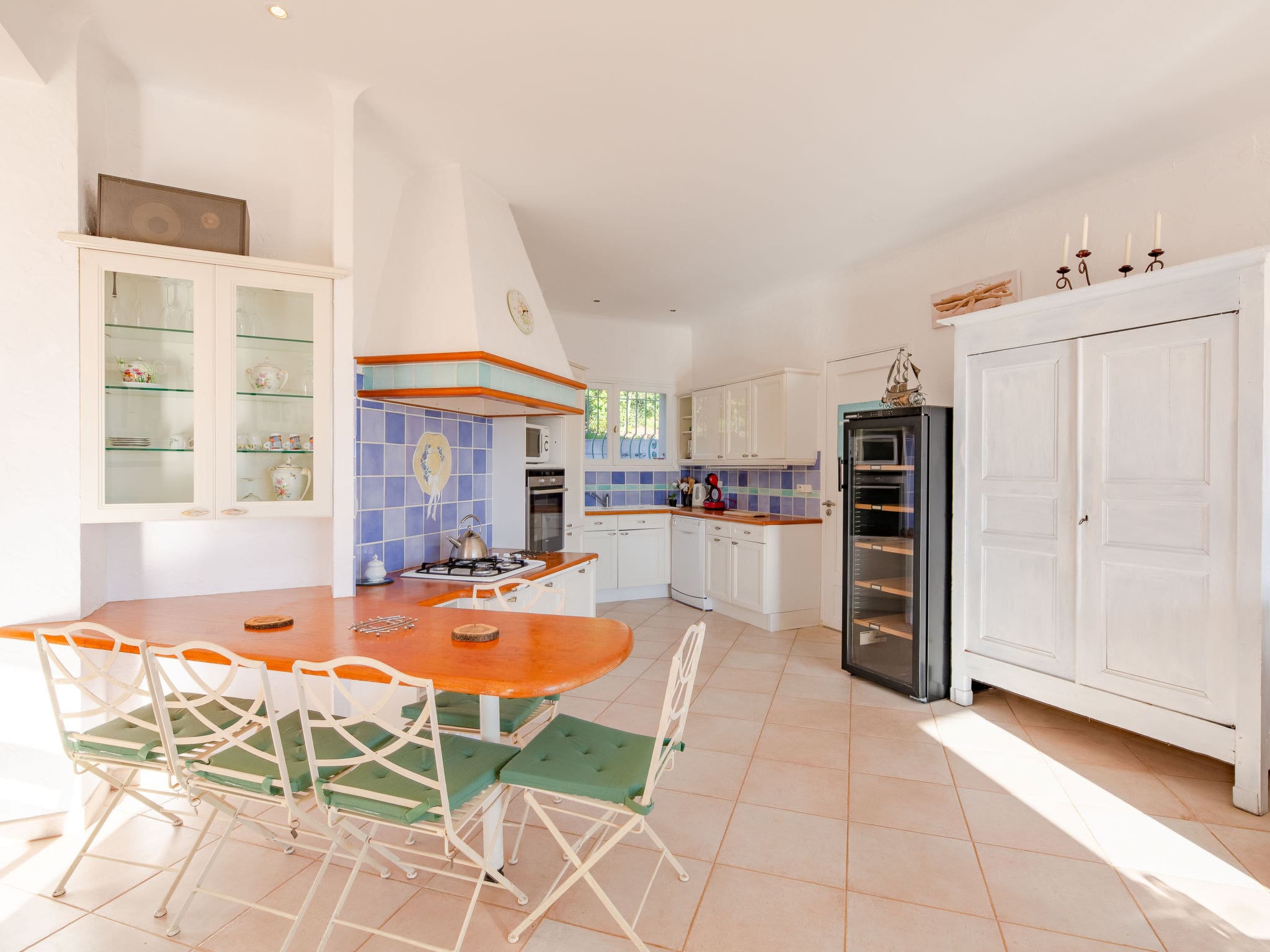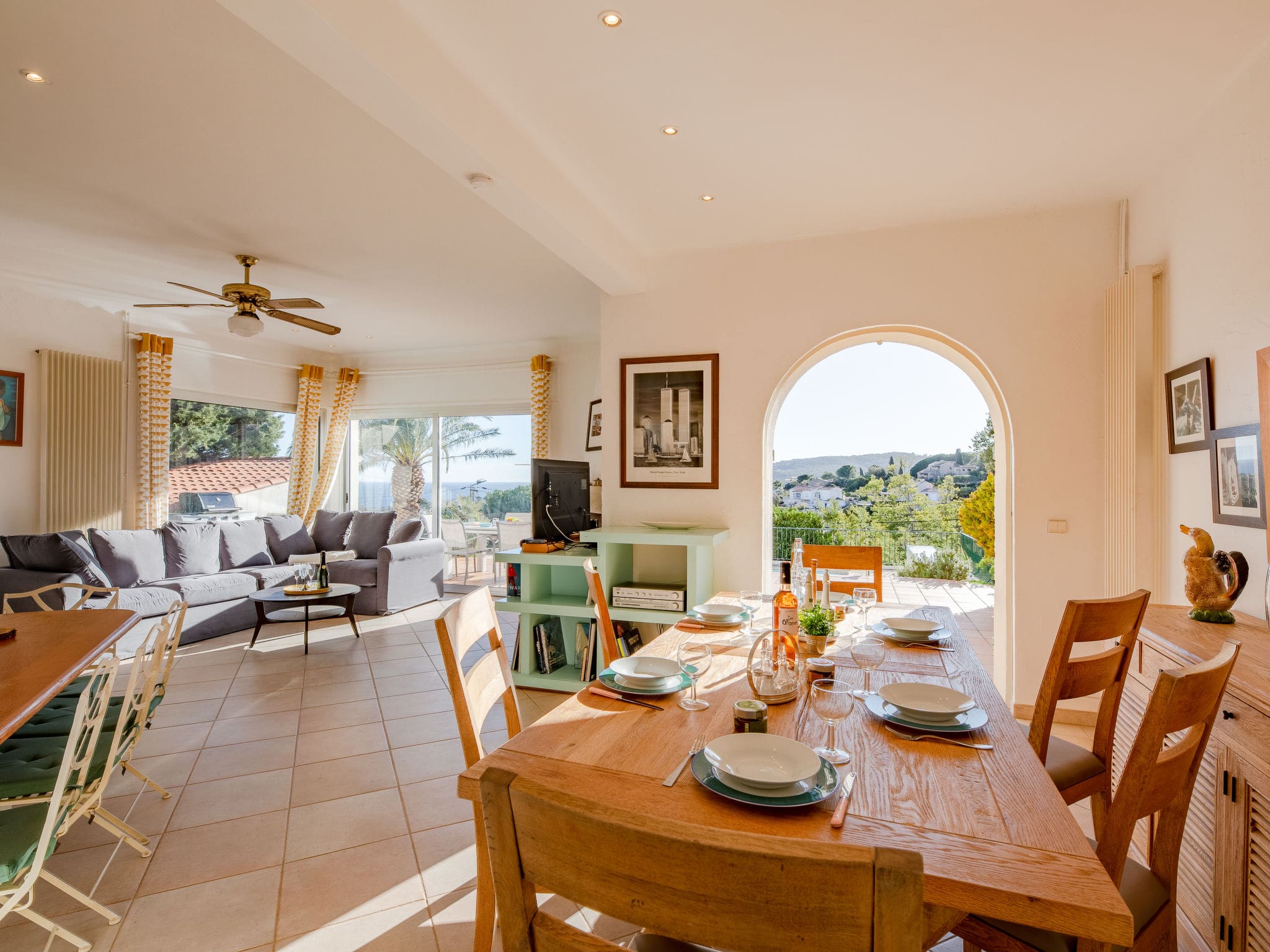 Spread across two thoughtfully designed levels, this 120m2 villa showcases contemporary luxury with traditional Provençal charm. The heart of the home features a magnificent 55m2 open-plan living and dining area, flooded with natural light through panoramic windows that frame spectacular sea vistas. The space flows seamlessly onto the sun-drenched terrace through expansive glass doors, while a decorative open-hearth fireplace adds atmospheric warmth during cooler evenings. The accommodation comprises three beautifully appointed bedrooms, each featuring panoramic windows, private balcony access, and individual climate control through ceiling fans. The master suite includes an impressive dressing room and en-suite facilities, while a versatile family room offers flexible sleeping arrangements with both a French double bed and bunk beds, perfect for children or additional guests. The villa’s modern kitchen comes fully equipped with premium appliances including gas hob, oven, dishwasher, and Dolce Gusto coffee machine, ensuring effortless self-catering throughout your stay.