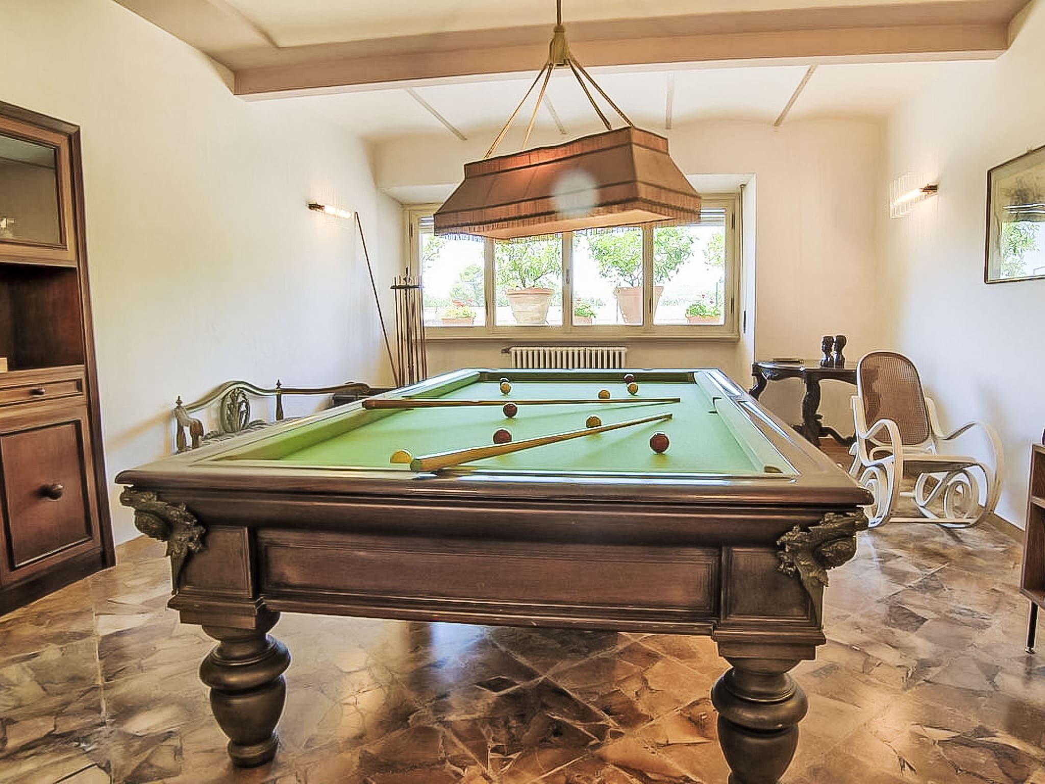 The accommodation is thoughtfully distributed across multiple levels, with the upper floors housing seven comfortable bedrooms and six well-appointed bathrooms. Several bedrooms feature private terraces, while the master suite includes a luxurious hydro massage bath. The lower ground floor houses an impressive playroom complete with billiard table and card game facilities. A particularly unique feature is the private consecrated chapel, adding historical significance to your stay. Modern amenities including complimentary WiFi and efficient laundry facilities ensure contemporary comfort throughout your visit.