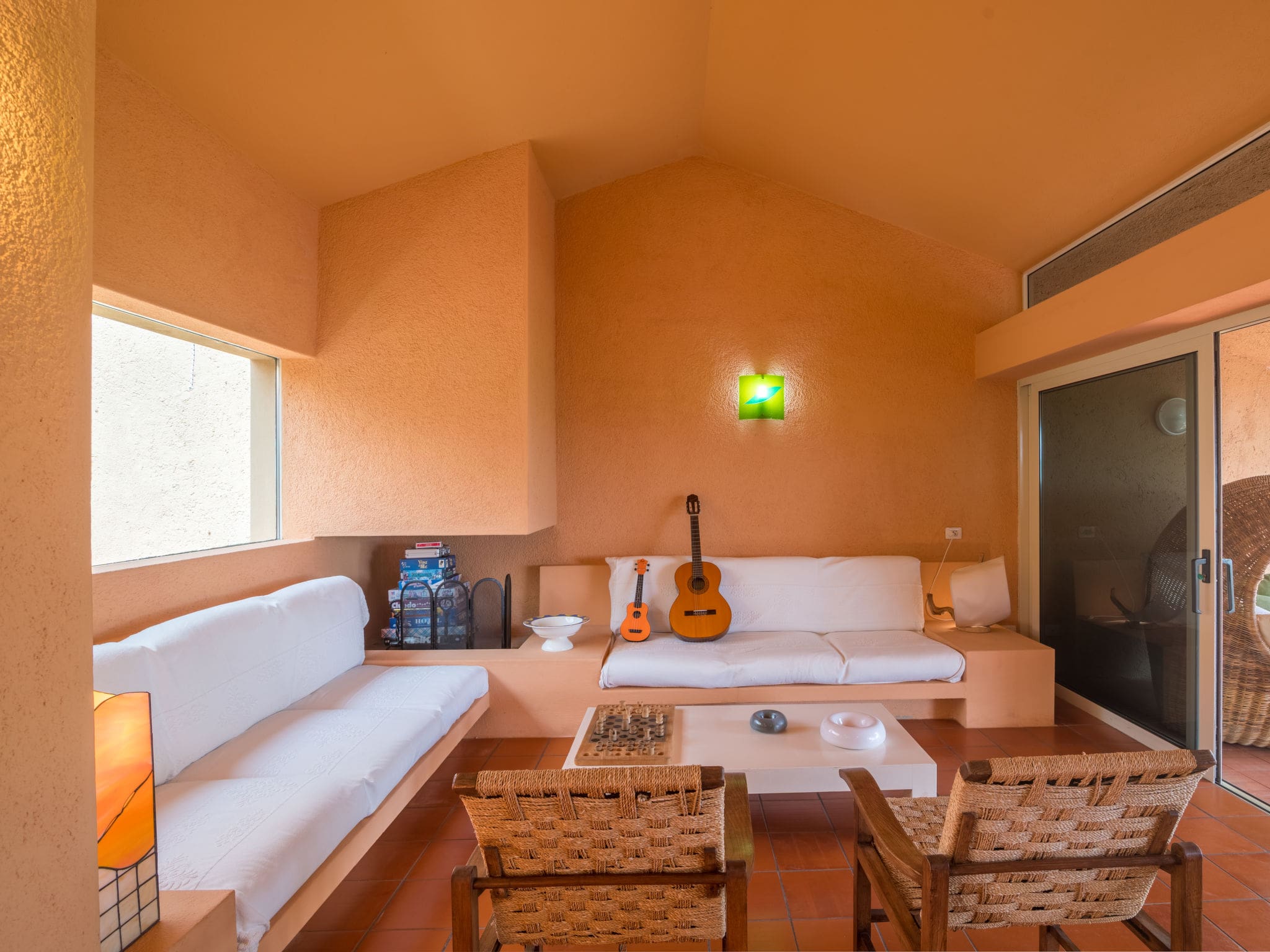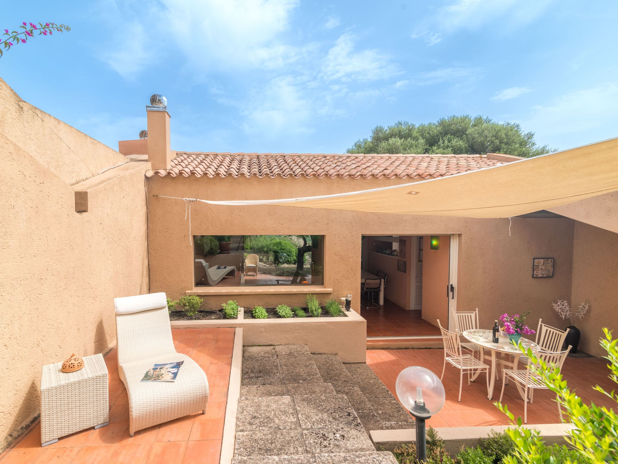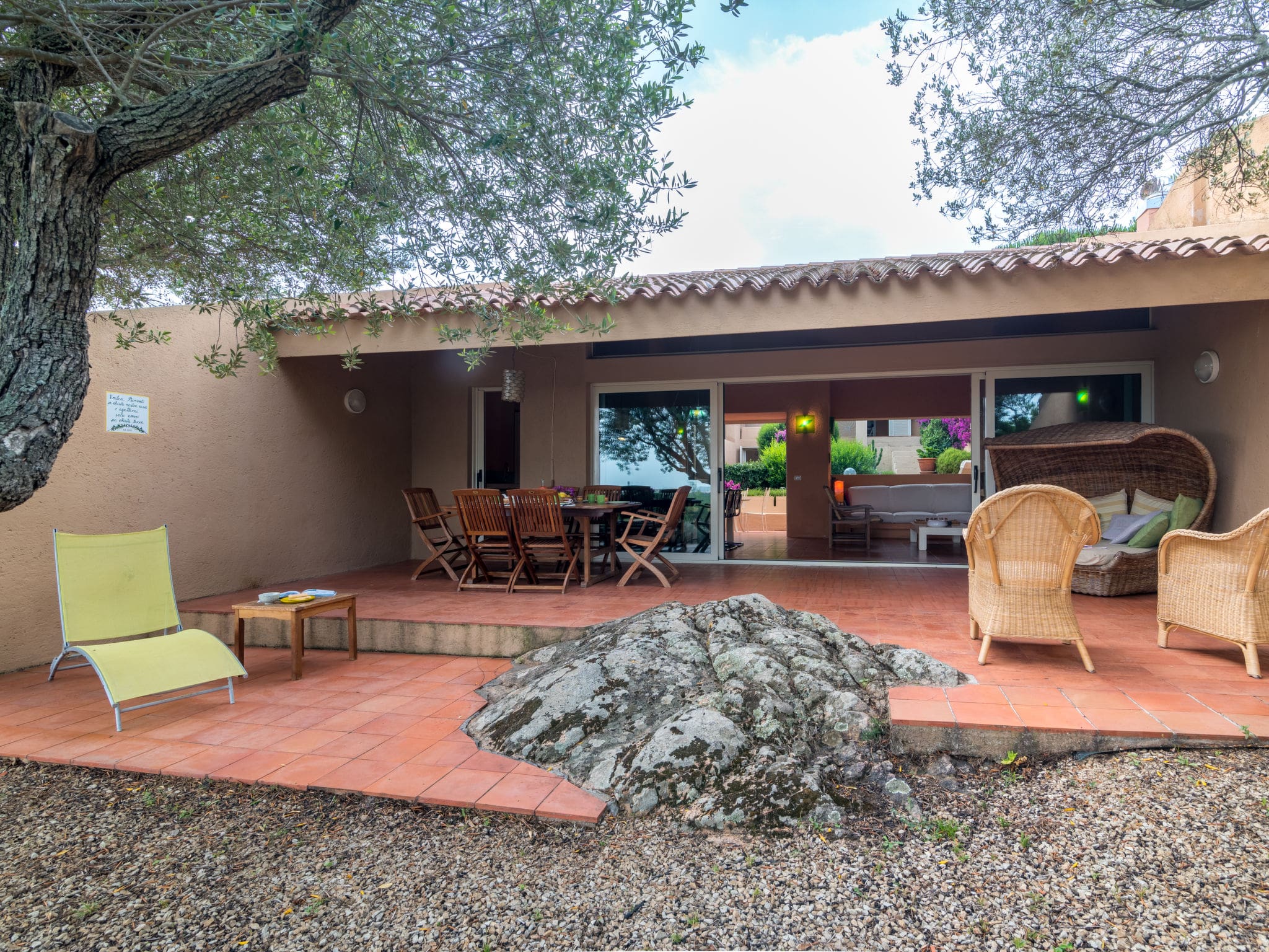 The villa’s crowning glory is its expansive terrace, partially covered for shade during Sardinia’s warm afternoons. The outdoor space features comfortable terrace furniture and two deck chairs, perfect for morning coffee or evening aperitivos while enjoying partial sea and countryside views. The surrounding garden provides a peaceful green space where your pet can roam freely, as the property welcomes one dog or pet.