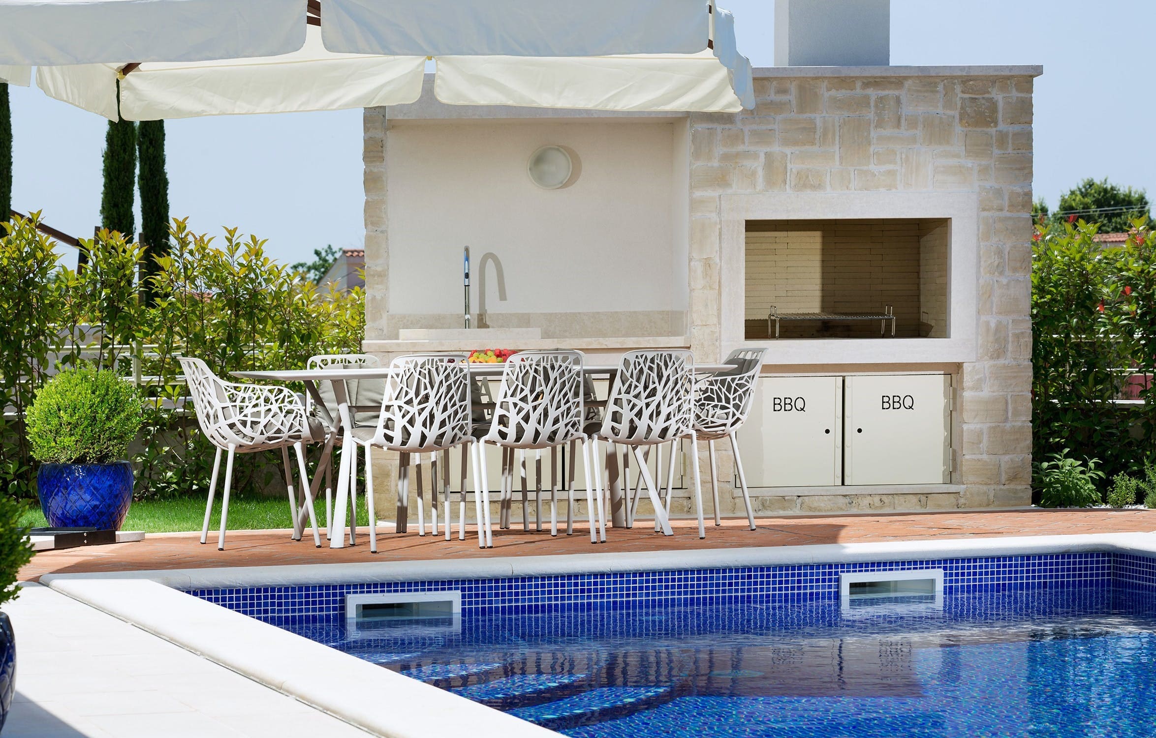 The outdoor spaces are as inviting as the interiors, with a stunning swimming pool surrounded by comfortable daybeds, ideal for unwinding under the Croatian sun. With an outdoor kitchen and dining area, al fresco meals become a delightful experience. The villa’s terraces offer picturesque views of the surrounding landscape, making it a perfect spot for evening relaxation.