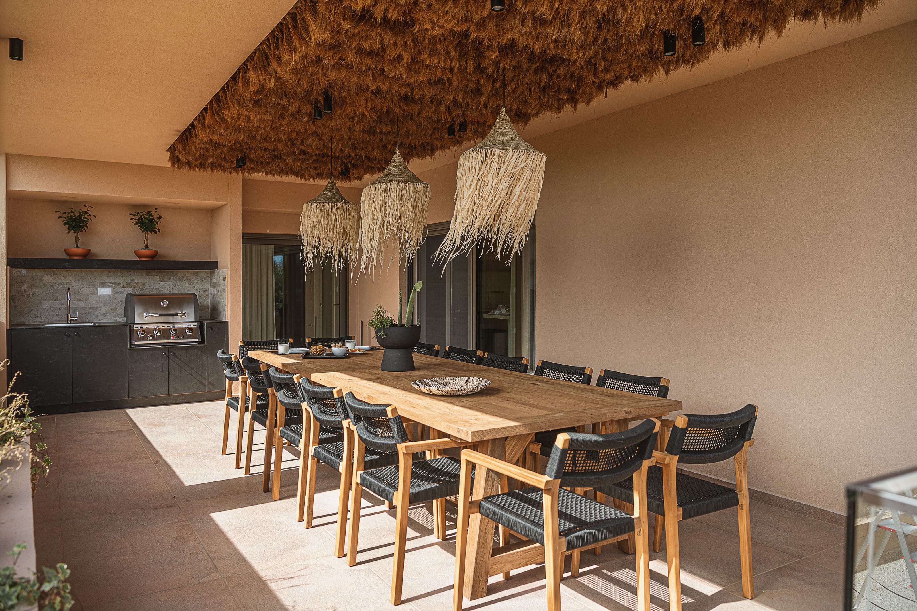 The villa’s outdoor spaces are nothing short of spectacular. Enjoy dining al fresco on the expansive terrace, where panoramic views of the sea and surrounding mountains enchant every gaze. The proximity to Koum Kappi Beach means golden sands and crystal-clear waters are just a short stroll away, offering endless seaside enjoyment.