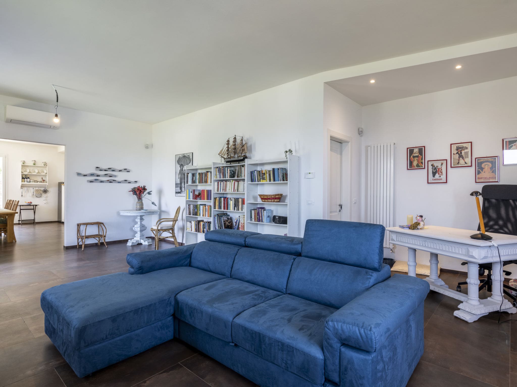 Villa Levante welcomes guests with sophisticated interiors that reflect modern Italian design sensibilities. The ground floor flows seamlessly from the spacious living area, complete with a comfortable sofa bed, through to a fully equipped kitchen featuring premium appliances including a dishwasher, oven, microwave, and electric coffee machine. Large windows and direct garden access fill the space with natural light while showcasing the panoramic sea views that extend across the resort.