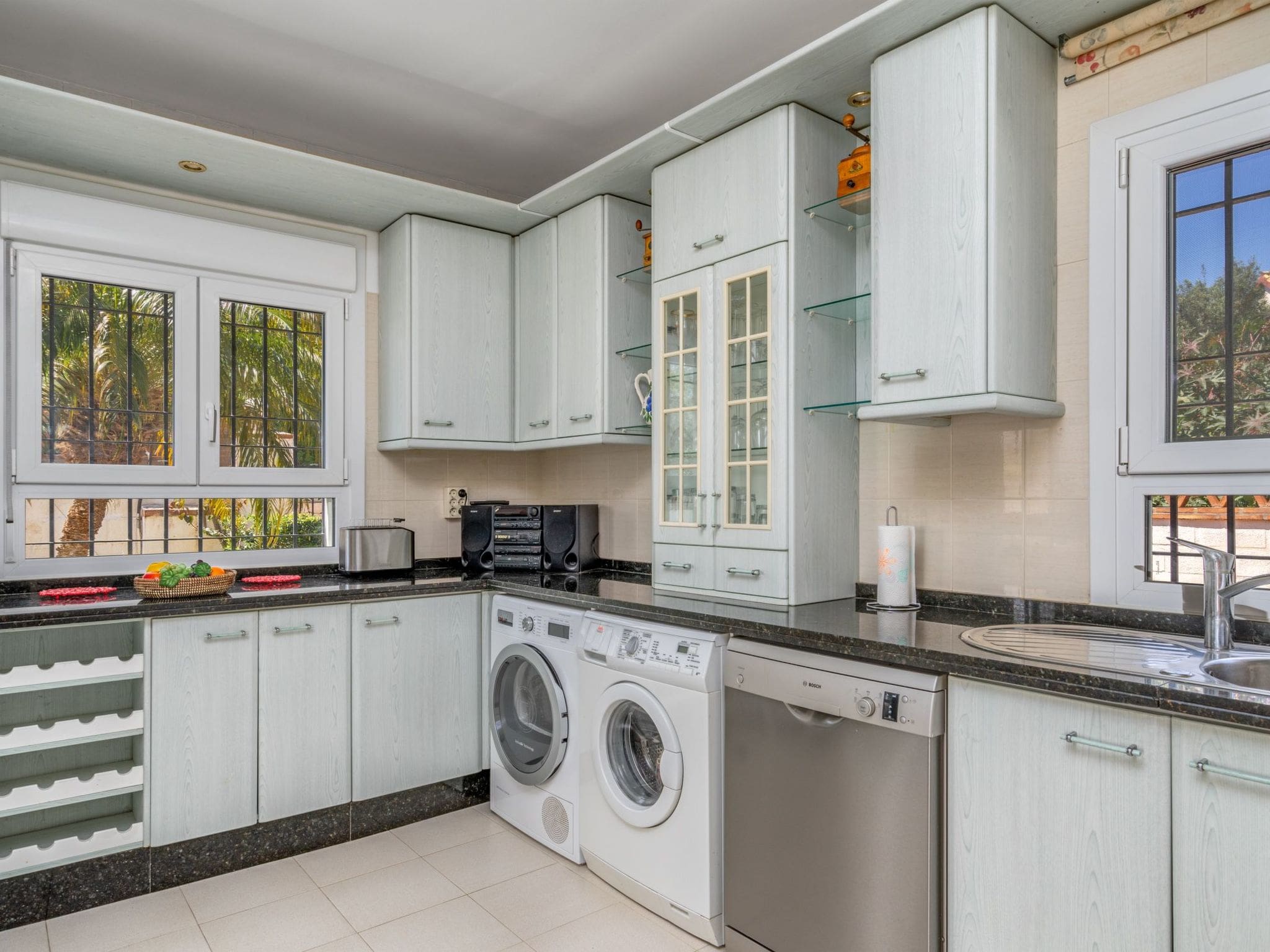 Villa Levante Benalmadena spans 150 square meters of thoughtfully designed living space across two levels. The heart of the home centers around a spacious living and dining area, where an open-hearth fireplace creates a cozy atmosphere for cooler evenings. Large windows flood the space with natural light, while satellite television and air conditioning ensure year-round comfort. The kitchen impresses with its full complement of modern appliances, including a dishwasher, ceramic hob, microwave, and electric coffee machine, making meal preparation a pleasure whether you’re preparing light breakfasts or elaborate dinner parties.