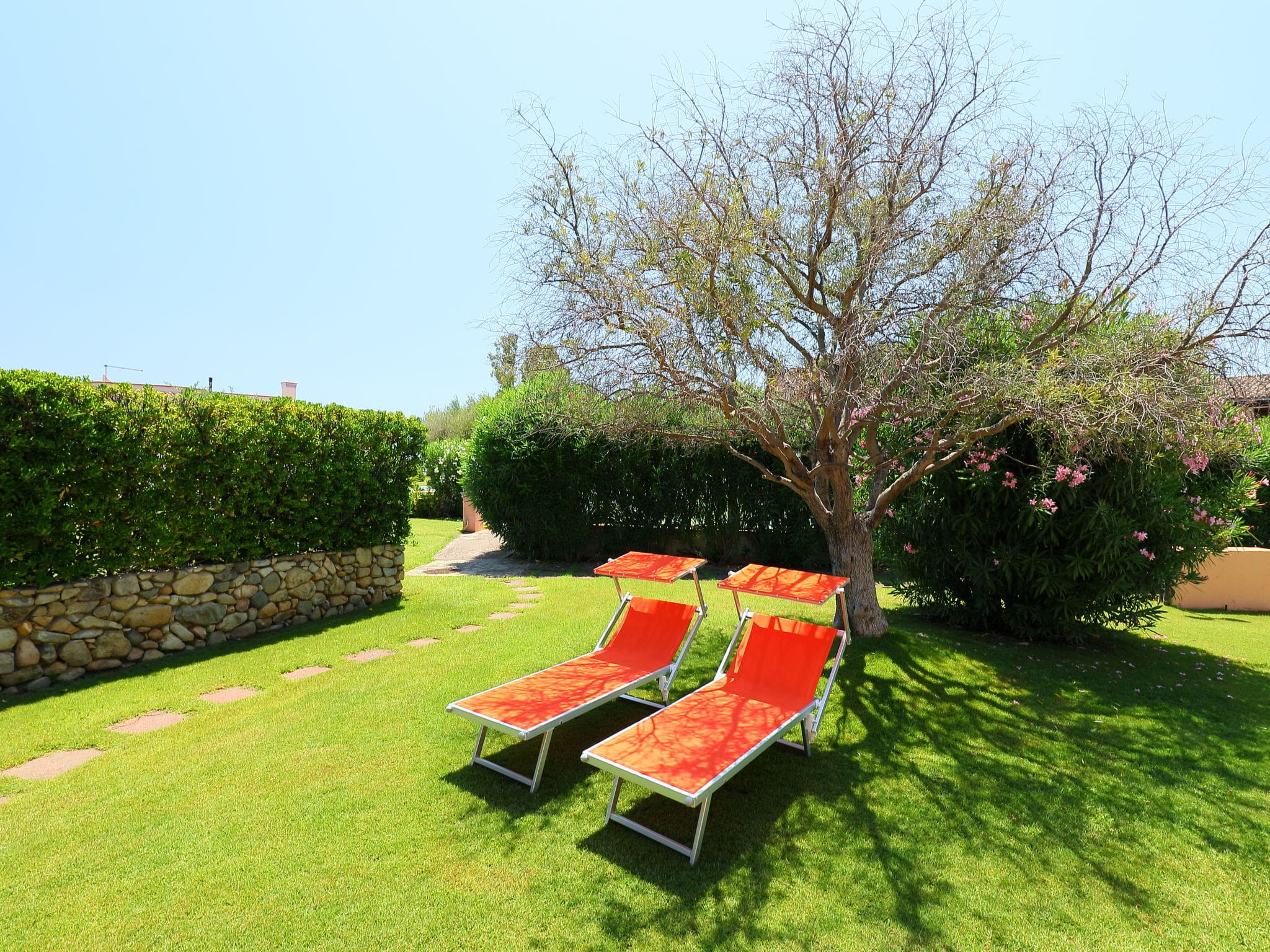 The villa sits within beautifully maintained communal gardens featuring lush lawns and Mediterranean plantings that create a resort-like atmosphere. An outdoor shower offers convenient beach preparation, while central parking ensures secure vehicle storage throughout your stay.