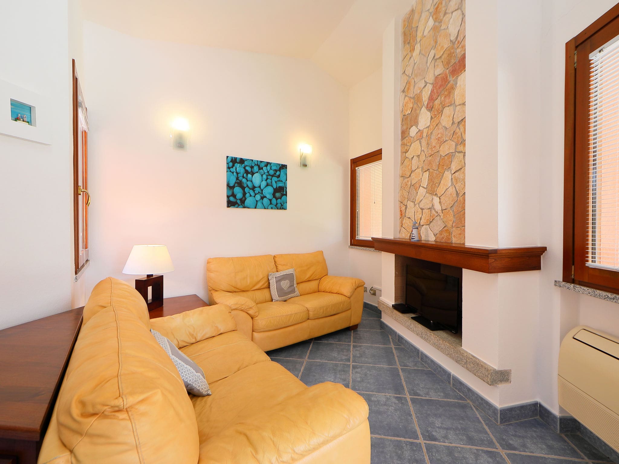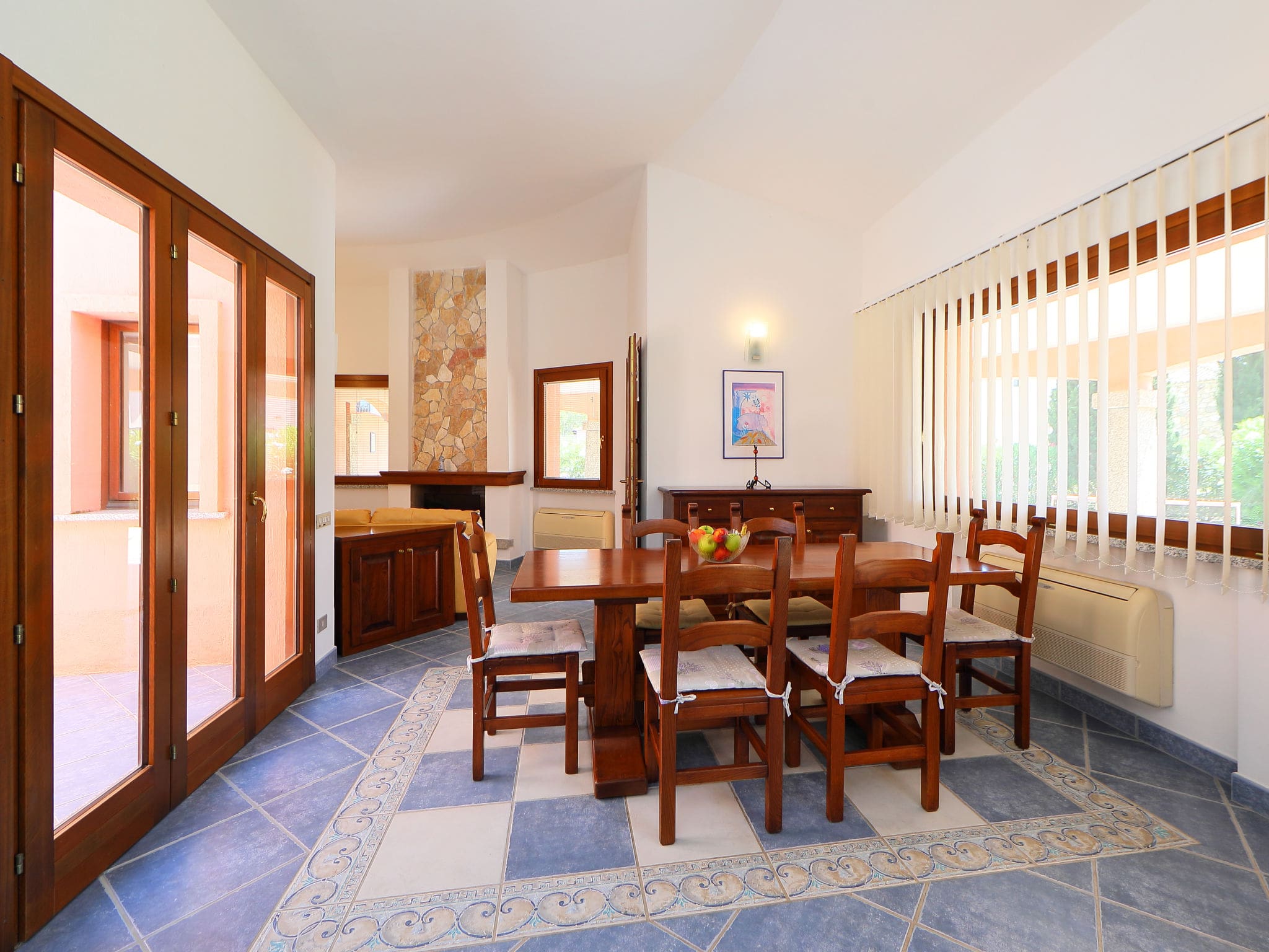 The 100-square-metre interior unfolds across a single level, creating an effortlessly flowing living space ideal for holiday gatherings. The heart of the home centres around an elegant living and dining area, where an open-hearth fireplace provides warmth during cooler evenings and satellite television ensures entertainment for all ages. Large windows and terrace access flood the space with natural light while maintaining seamless indoor-outdoor flow.