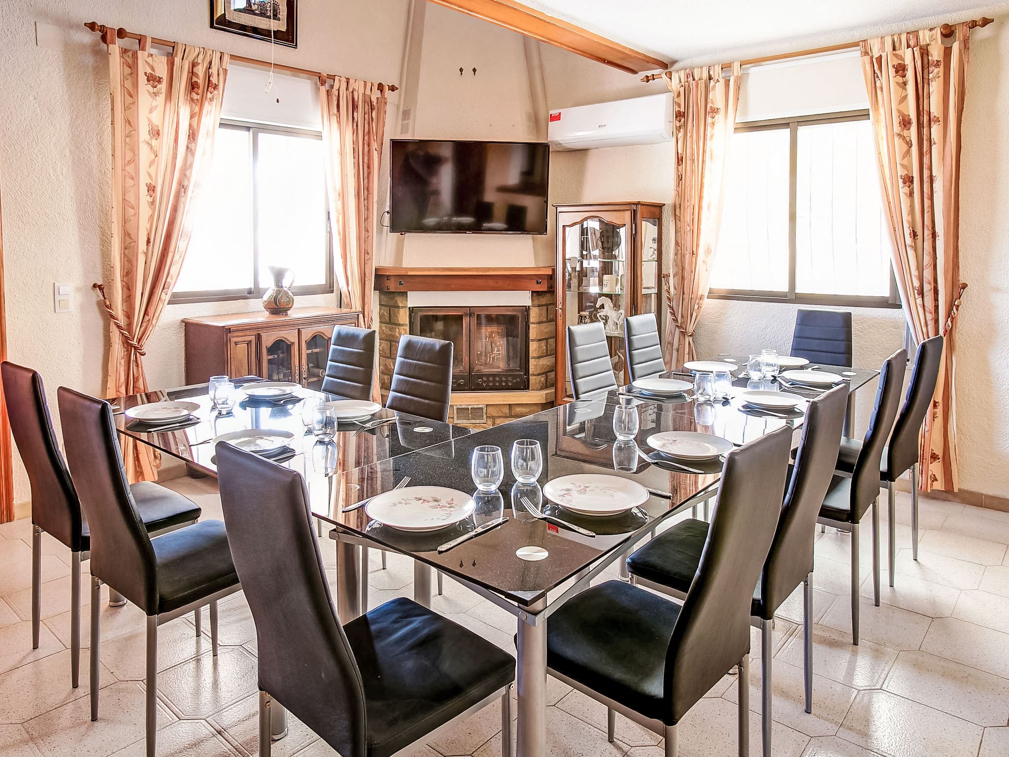 The spacious 8-room villa welcomes guests with cosy furnishings and thoughtful design throughout its two levels. The heart of the home features an inviting living and dining area anchored by an open-hearth fireplace, complemented by satellite television and climate control for year-round comfort. The open kitchen provides everything needed for group dining, equipped with four hot plates, oven, dishwasher, microwave, and electric coffee machine.