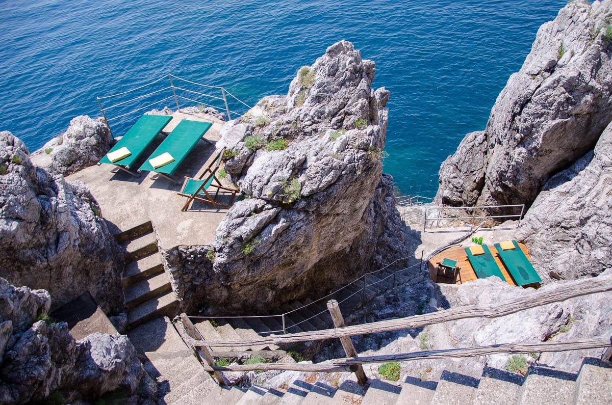 The villa’s outdoor spaces are a true sanctuary, with terraced gardens leading to a private saltwater swimming pool carved into the cliffside. Here, guests can bask in the sun while relishing panoramic views of the Mediterranean. A private pathway winds down the property, offering direct access to a secluded rocky cove — perfect for an intimate seaside escape. Enjoy al fresco dining on the terrace, surrounded by the vibrant colors and scents of the Amalfi Coast.