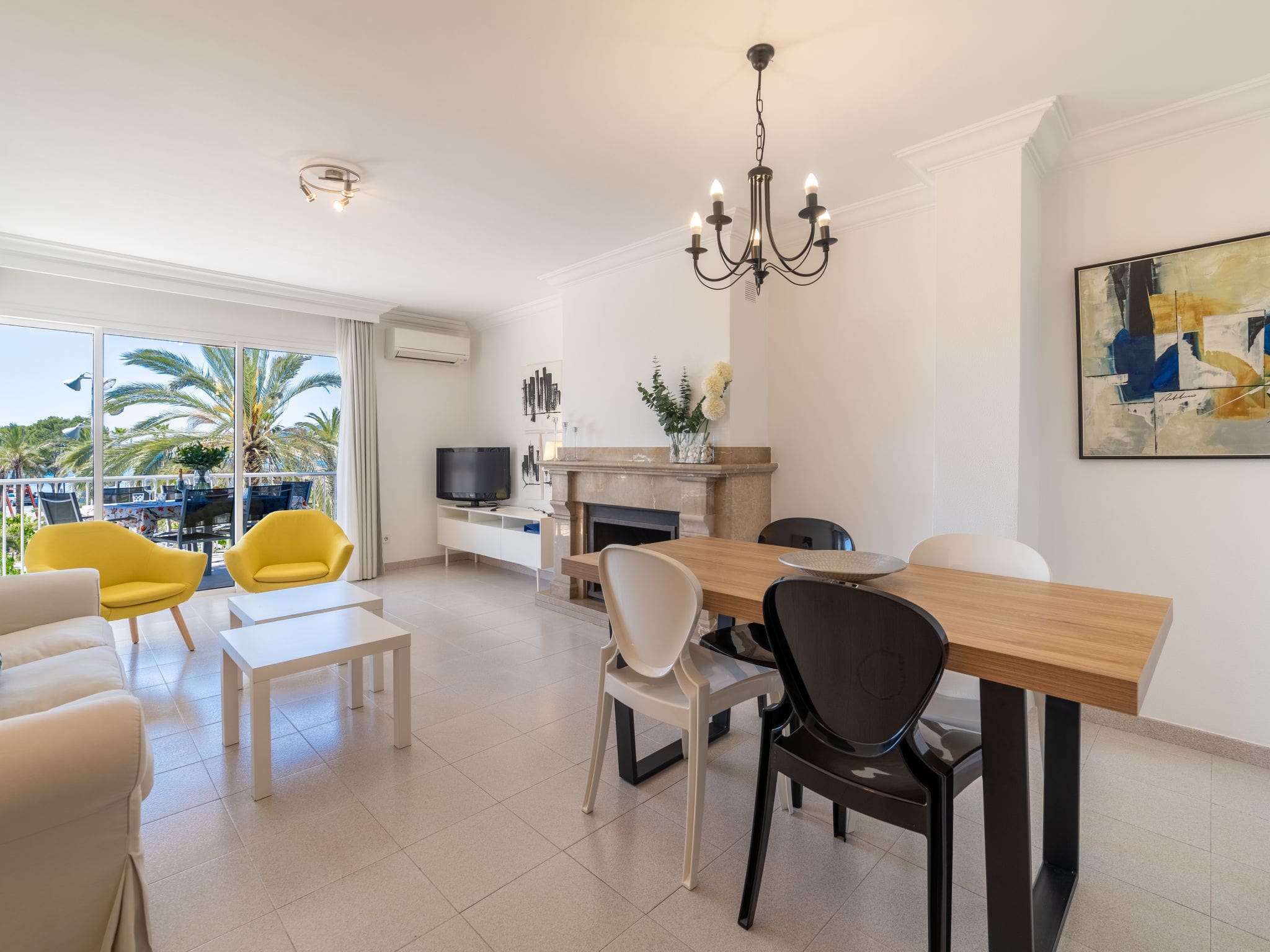 The 10m² private terrace serves as an extension of the living space, furnished for al fresco dining and relaxation. Morning coffee and evening aperitifs take on special significance when enjoyed against the backdrop of Port d’Alcúdia’s bustling marina and the endless expanse of the Mediterranean. The terrace’s sunny orientation ensures natural light throughout the day, while the sea breeze provides natural cooling during the warmer months.