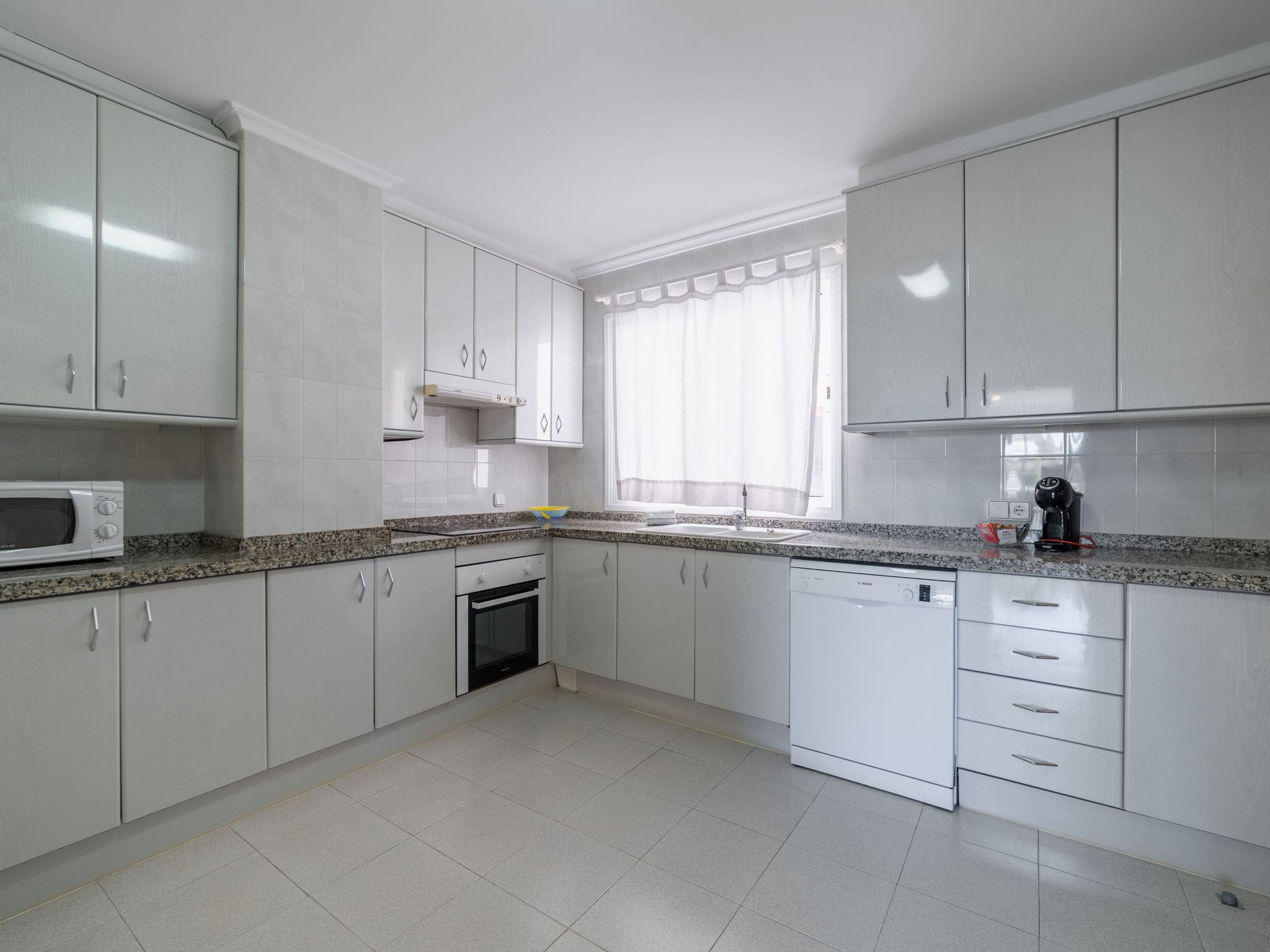 The contemporary kitchen comes fully equipped with everything needed for self-catering, including a dishwasher, microwave, oven, ceramic hob, and electric coffee machine. The adjacent dining area provides the perfect setting for enjoying meals prepared with fresh ingredients from the local markets.