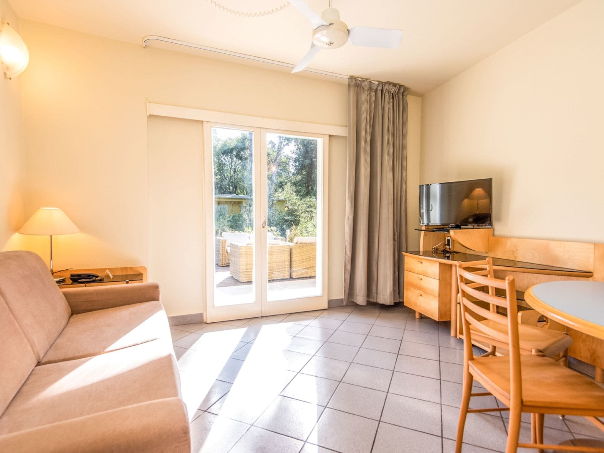 This thoughtfully designed 57-square-metre villa maximises space and natural light across its single-level layout. The open-plan living area serves as the heart of the home, featuring comfortable sleeping facilities for two guests, a dining area perfect for family meals, and satellite television for evening entertainment. The master bedroom provides a peaceful retreat with a comfortable double bed, while the second bedroom accommodates two guests with twin beds, making this an ideal configuration for families or small groups.