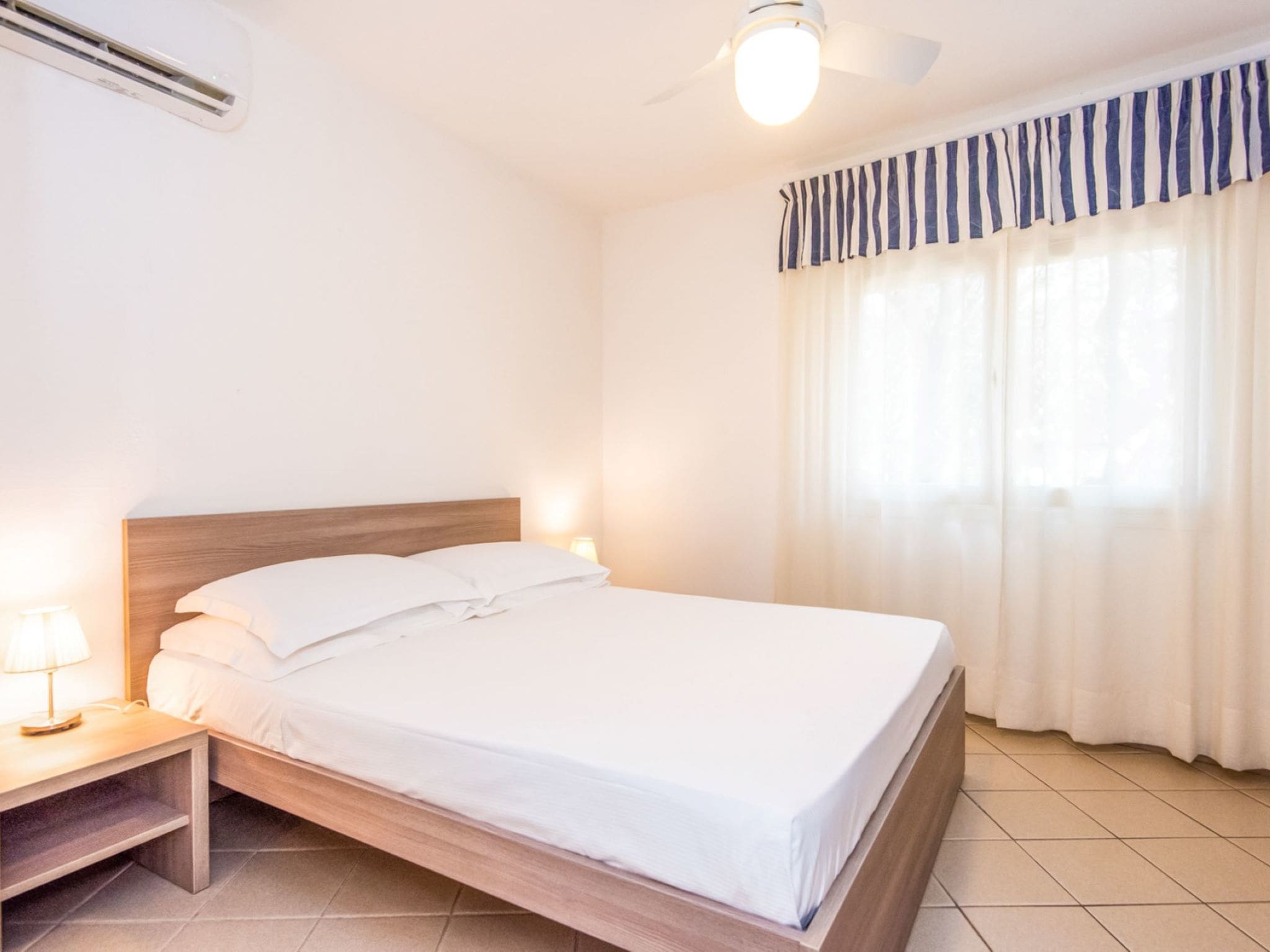 The rental includes beach equipment (umbrella, deck chairs, sun lounger), WiFi, air conditioning, private parking, and access to all resort facilities including the swimming pool, tennis court and children’s playground.