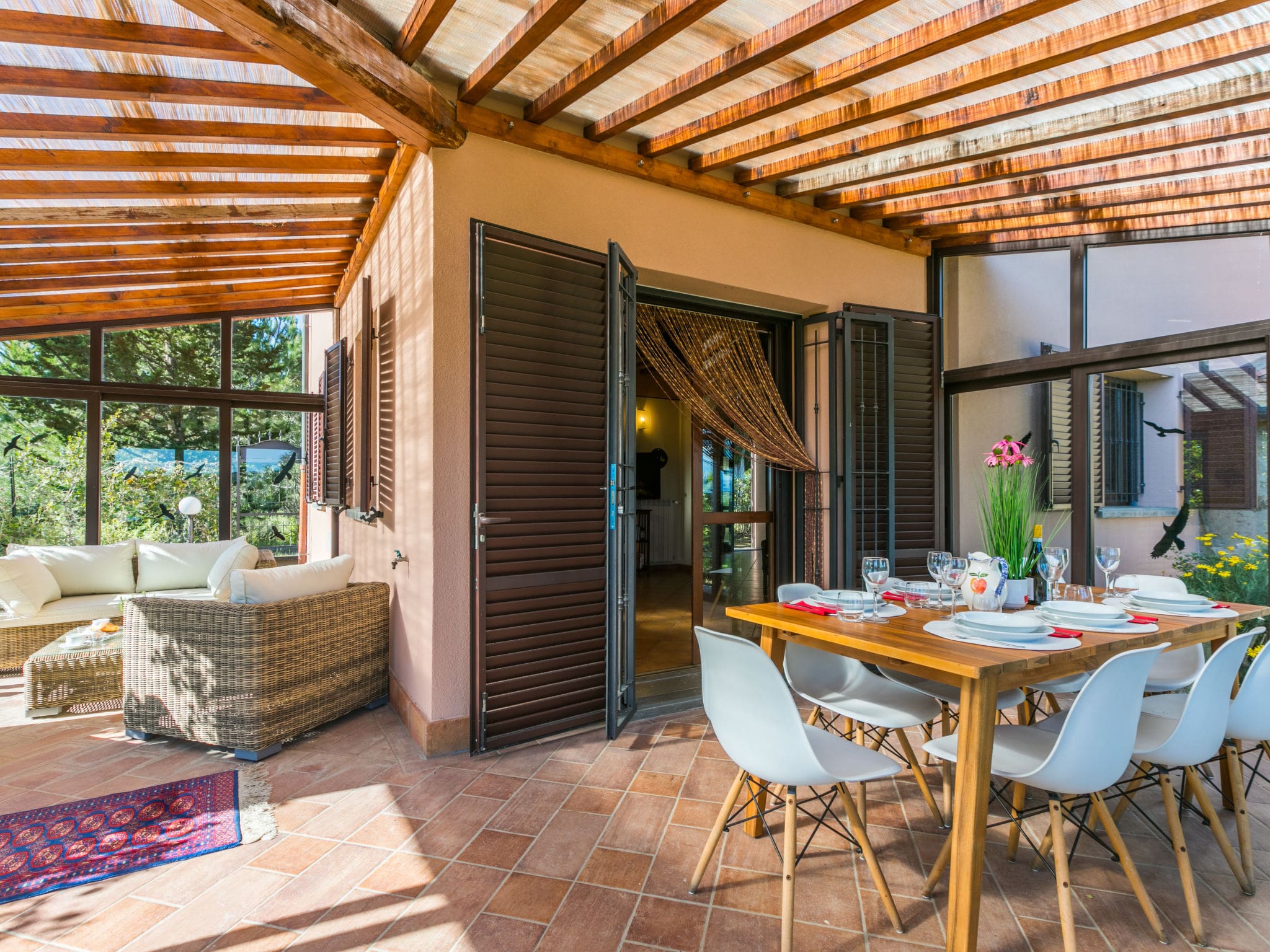 The villa’s outdoor spaces truly distinguish this property, beginning with the stunning 4×8-meter swimming pool that takes center stage in the beautifully maintained grounds. Available from May through mid-October with automatic shutter cover, the pool area includes an outdoor shower and dedicated sunbathing lawn. The extensive terraces and patios provide multiple dining and relaxation zones, each taking advantage of different views and sun patterns throughout the day.