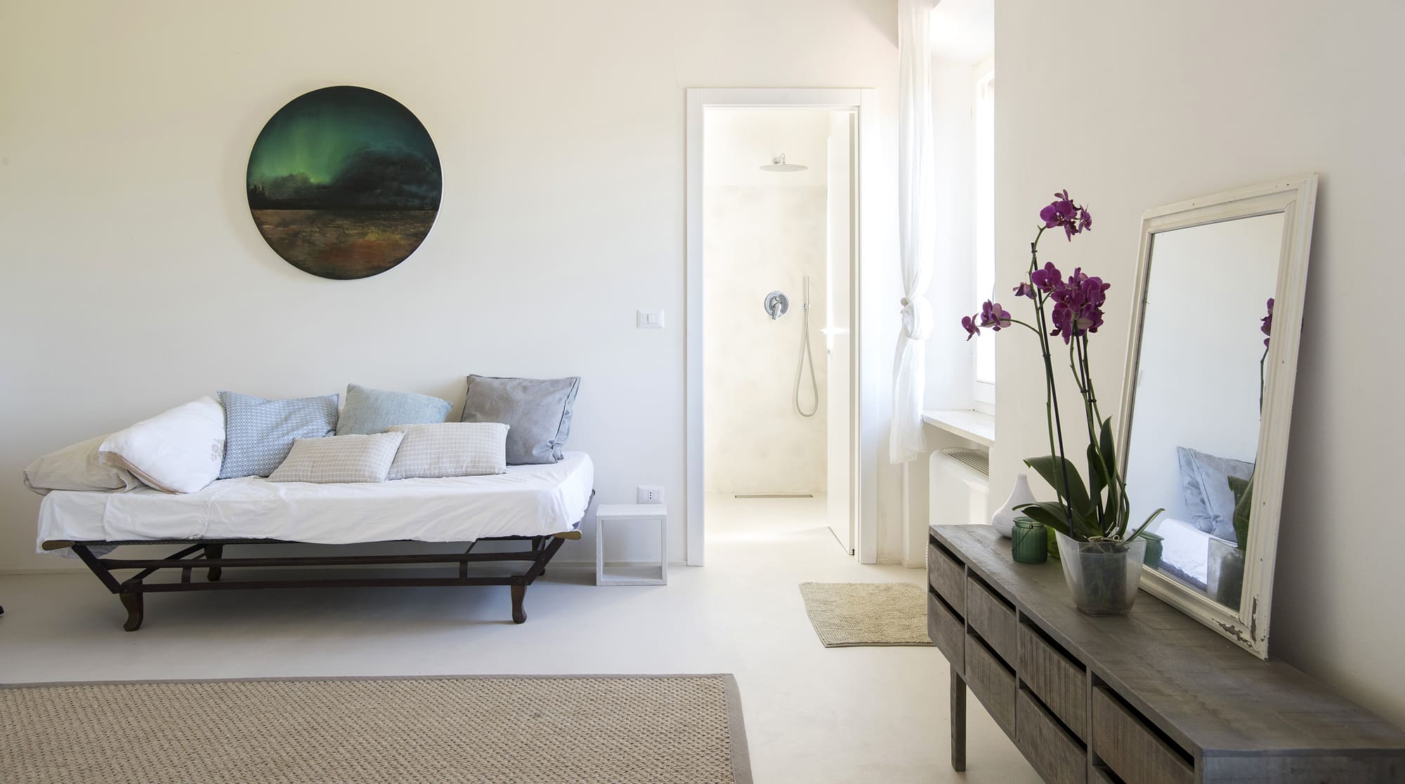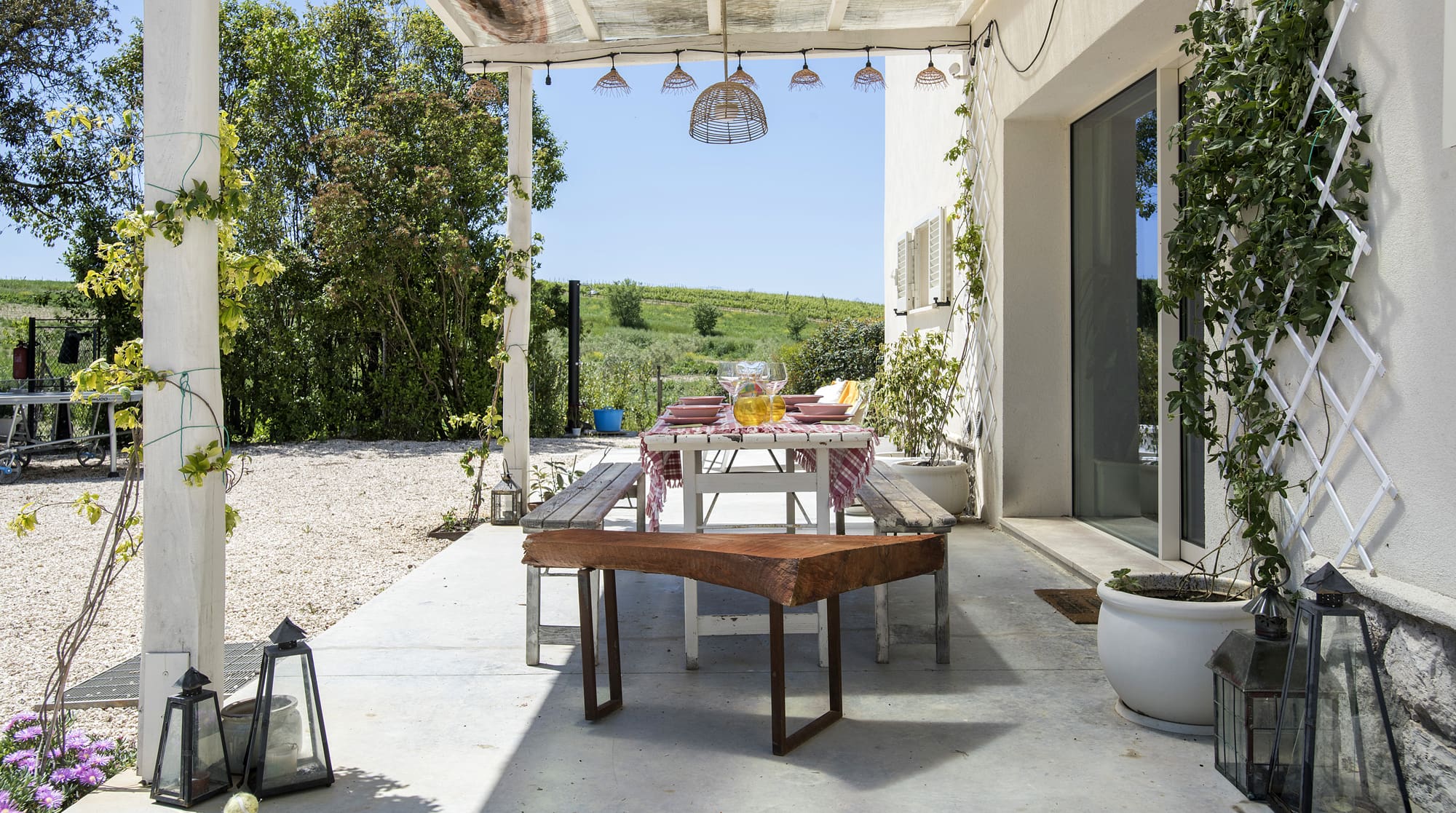 Step inside and be captivated by the harmonious blend of Japanese zen and Scandi-chic design, creating a serene and inviting atmosphere. The spacious living room, centered around a grand fireplace, features raw-wood tables and wicker lampshades that beautifully reflect the natural surroundings. The professionally equipped kitchen, with its expansive range-style cooker, is a culinary enthusiast’s dream, perfect for preparing meals using fresh produce from the villa’s own vegetable garden. With five elegantly appointed bedrooms and six luxurious bathrooms, the villa comfortably accommodates up to eleven guests, ensuring a restful stay for everyone.