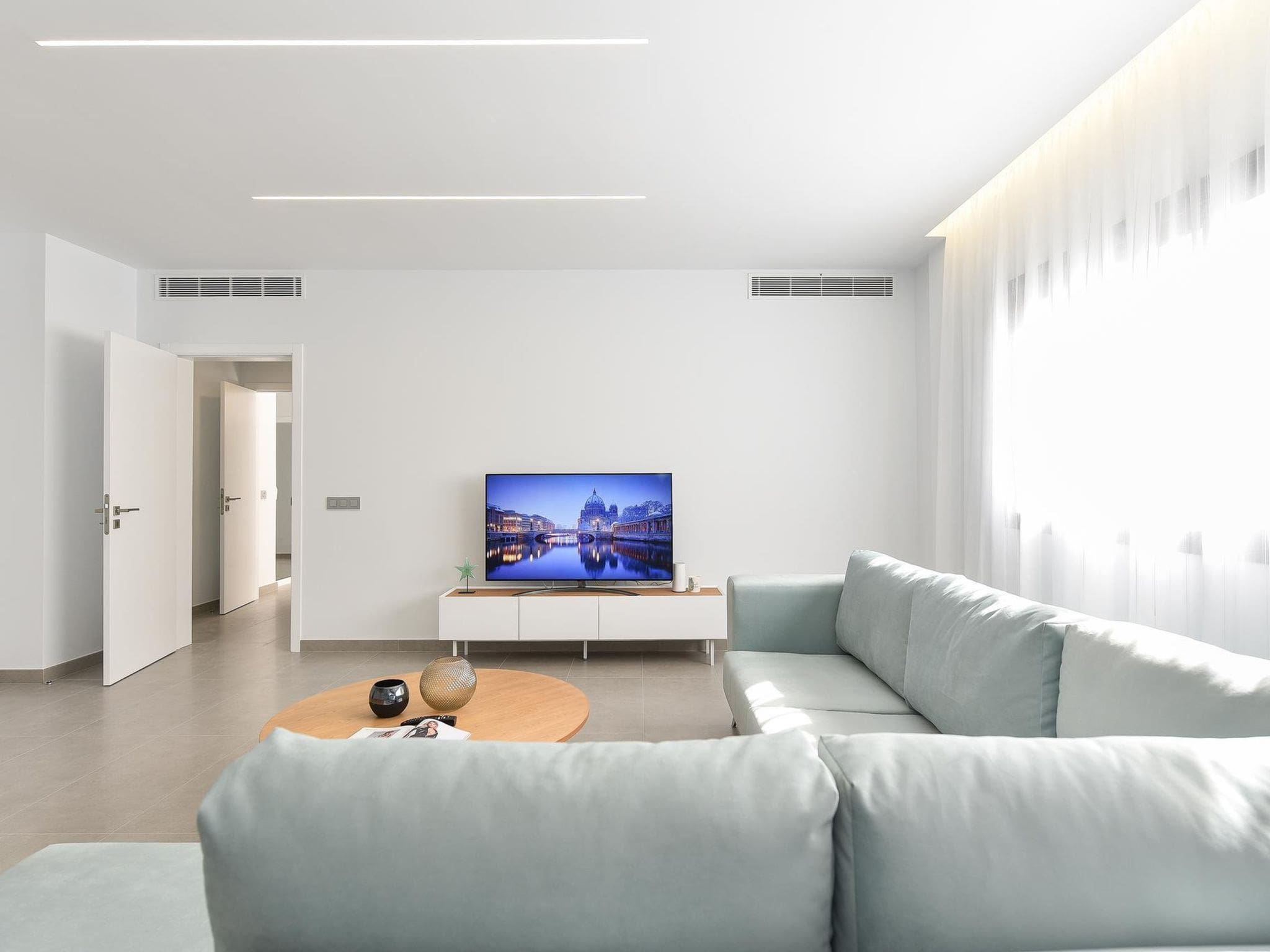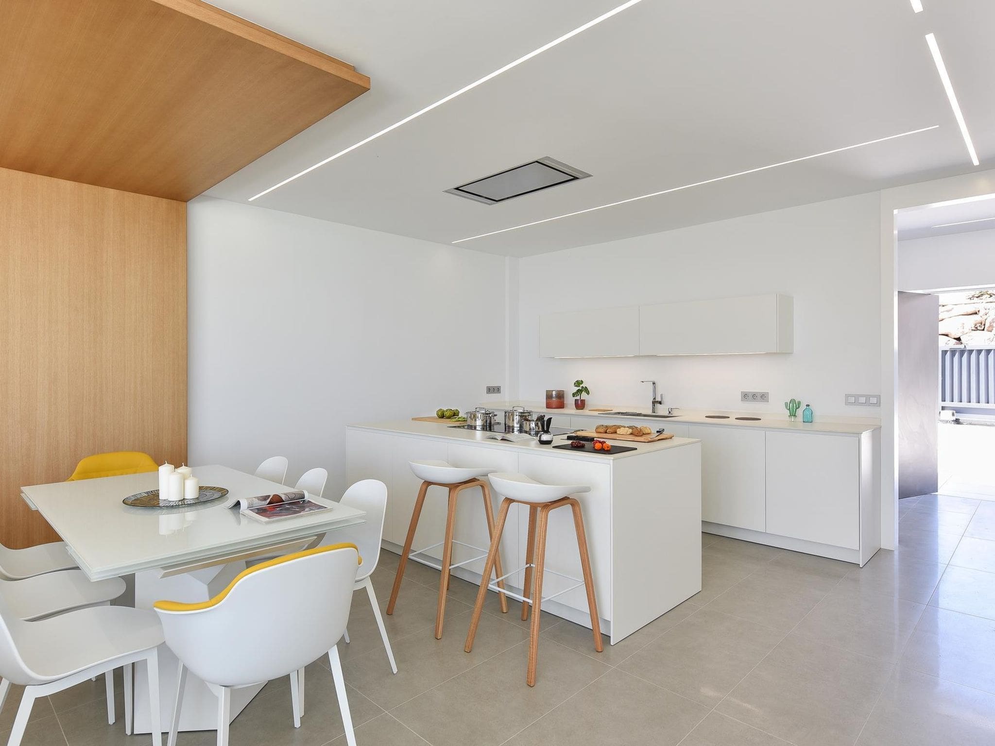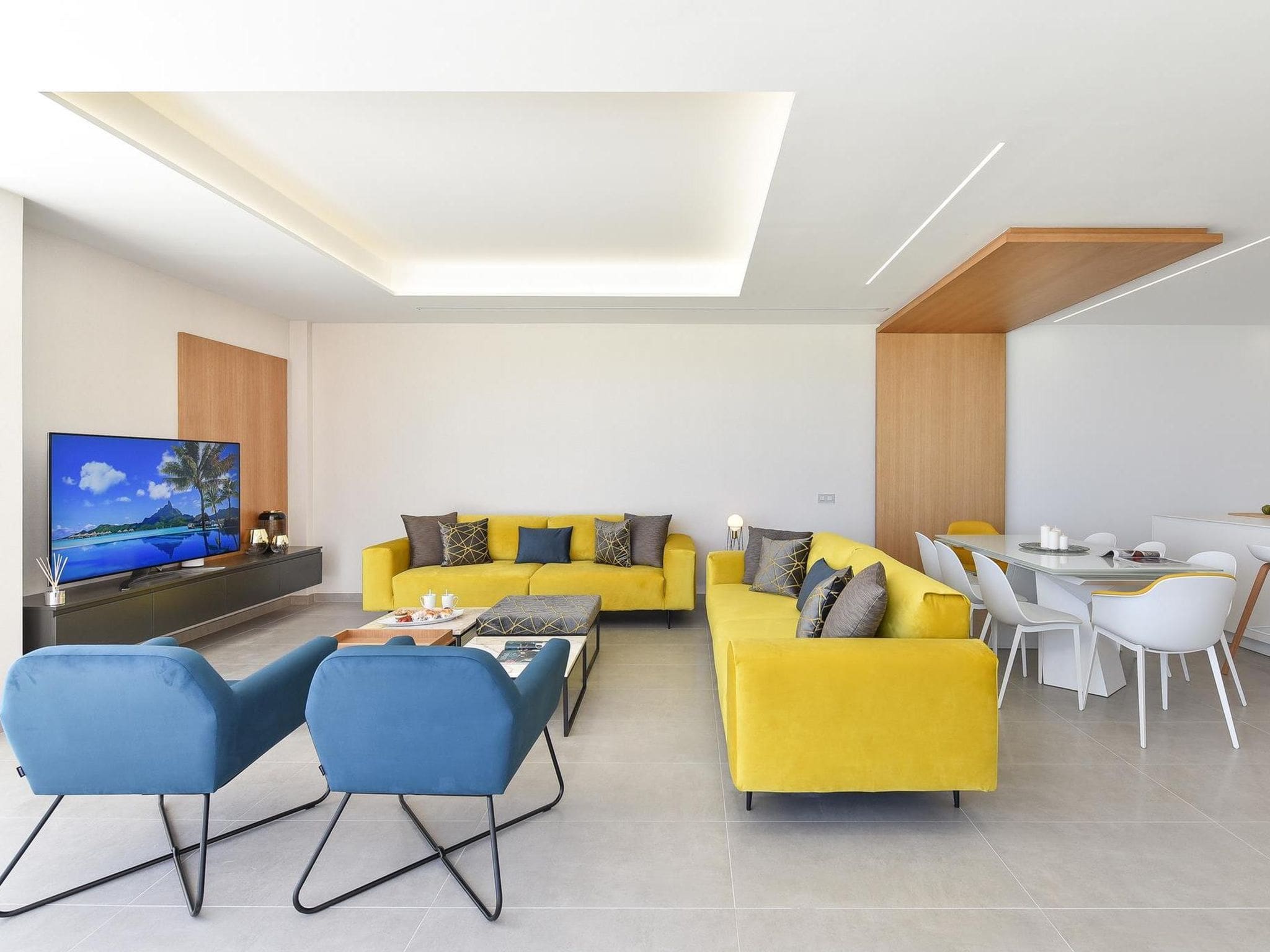 The open-plan living spaces flow seamlessly between indoor and outdoor areas, with the contemporary kitchen featuring top-tier appliances including a ceramic hob, dishwasher, and professional-grade coffee machine. The expansive living and dining area opens directly onto the magnificent 300-square-metre terrace, creating an effortless transition between interior luxury and outdoor paradise.