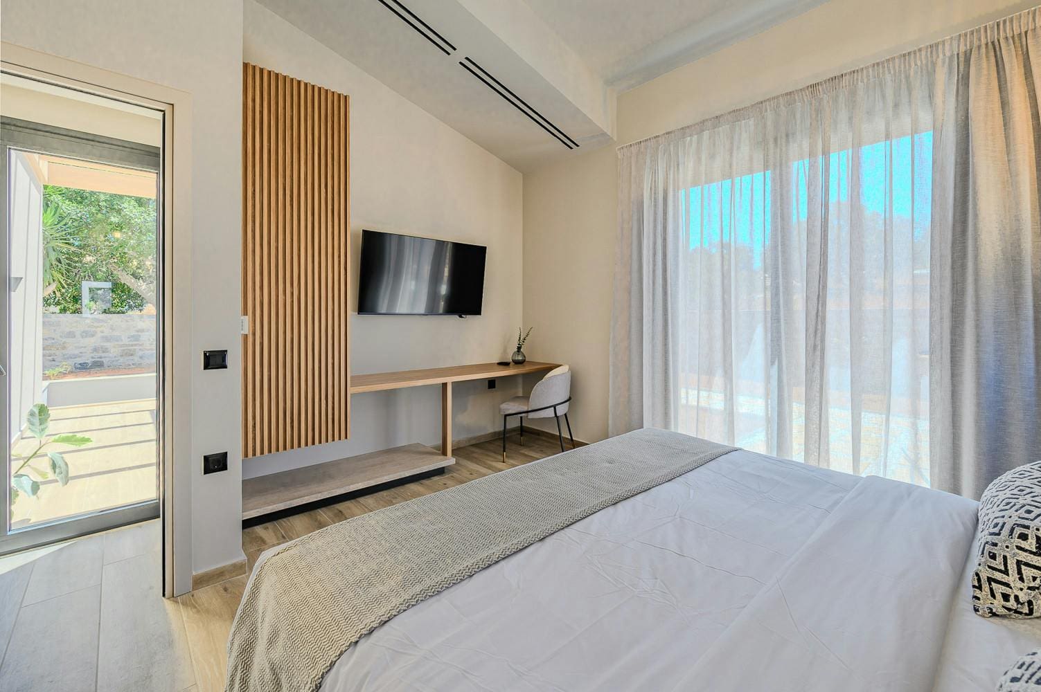 Outside, the villa’s allure continues with a pristine pool that offers a refreshing respite from the warm Cretan sun. Lounge on the sun-kissed terrace or dine al fresco while soaking up the panoramic views. The lush garden and surrounding landscape create a sense of tranquility and privacy, making it an idyllic setting for relaxation.
